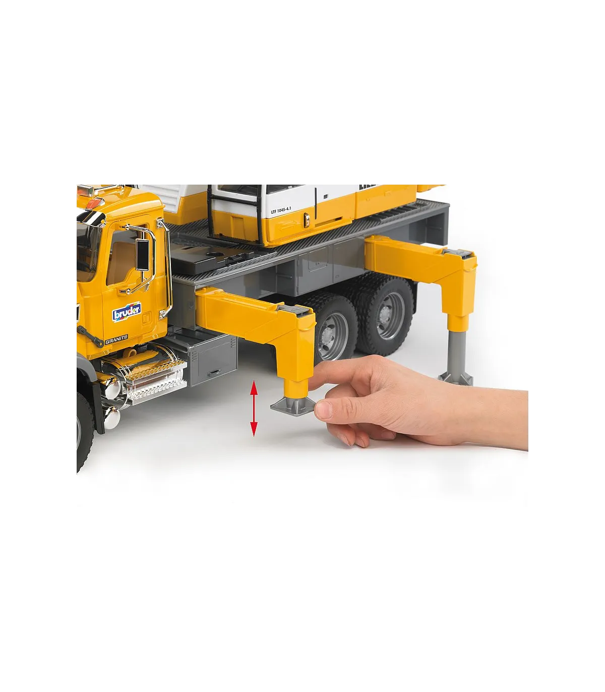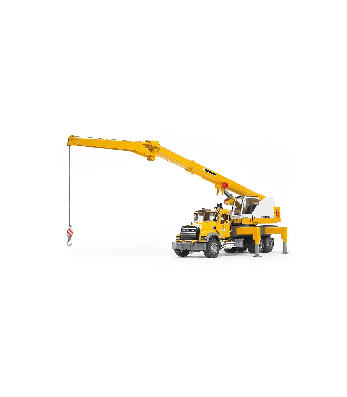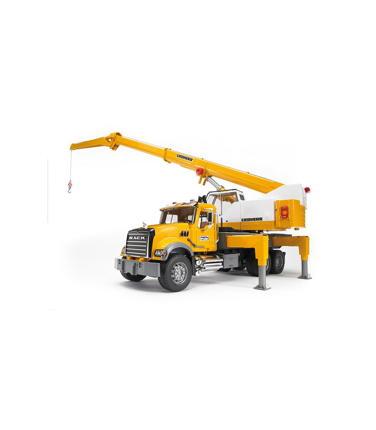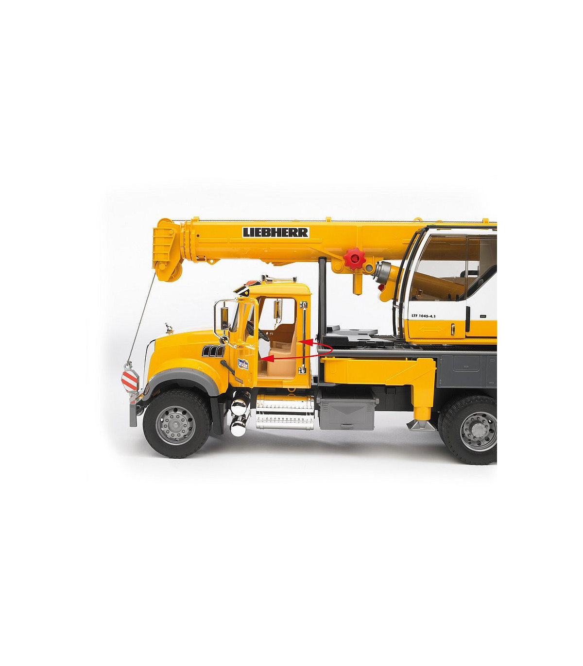 En el sentido más literal de la palabra, la impresionante grúa telescópica sobre camión de BRUDER sobresale de entre los vehículos industriales de BRUDER. La grúa sobre camión tiene ya una altura considerable con la pluma telescópica desplegada, pero todavía puede aumentarse con un brazo extensible adicional. Nuestros clientecillos alucinarán con el tamaño de la grúa que, con el brazo desplegado y totalmente vertical, alcanza 1,30 m de alto, con el que superará a algunos de los maestros de obra más pequeñitos. Con este tamaño, la estabilidad es absolutamente necesaria. La elevada resistencia a la basculación que presenta este vehículo se consigue gracias a las patas estabilizadoras giratorias y de ajuste individual de la plataforma del vehículo. Si todavía se requiere más estabilidad, se podrá utilizar el contrapeso acoplado, como en la grúa original. Para conferir más peso al modelo, se puede llenar con arena. El eslogan de BRUDER "multifuncional" se hace especialmente visible en este modelo. Un torno de cable de nuevo desarrollo con sistema de fijación y seguridad de sobrecarga permite manejar con total facilidad el gancho de la grúa cuando sube y baja, también con piezas grandes. El amor por los detalles tampoco se detiene ante la cabina del conductor. Como la grúa original, dispone de un marco de protección de los cristales y una puerta corredera que se puede abrir. Un compartimento para herramientas integrado en la plataforma completa las numerosas funciones de la grúa. Idéntico aspecto presenta también la cabina Mack: sus muchas piezas cromadas y su gran capó del motor son la representación de la "American way of life". Un camión con muchas funciones, como las puertas y el capó del motor, que se pueden abrir.