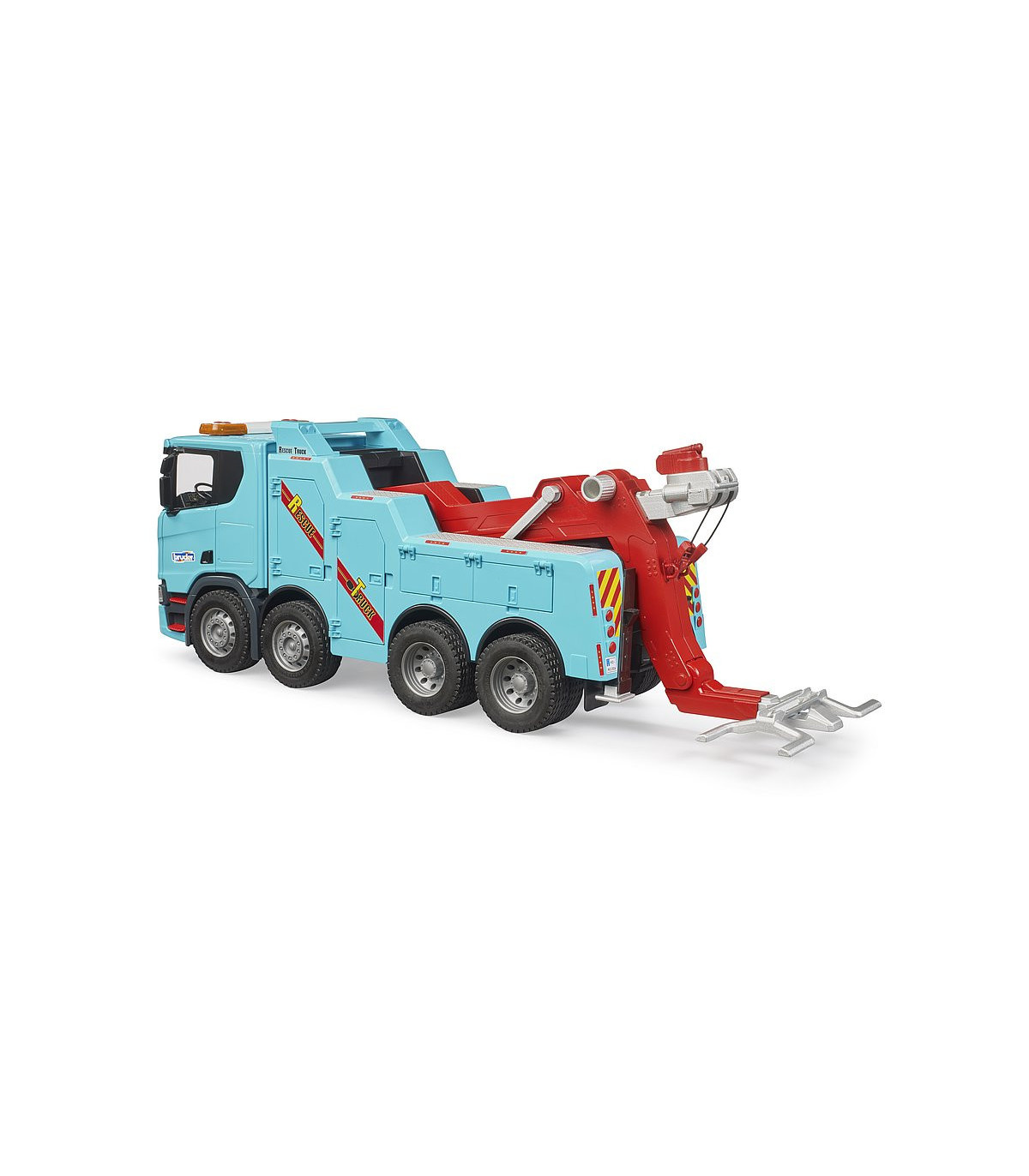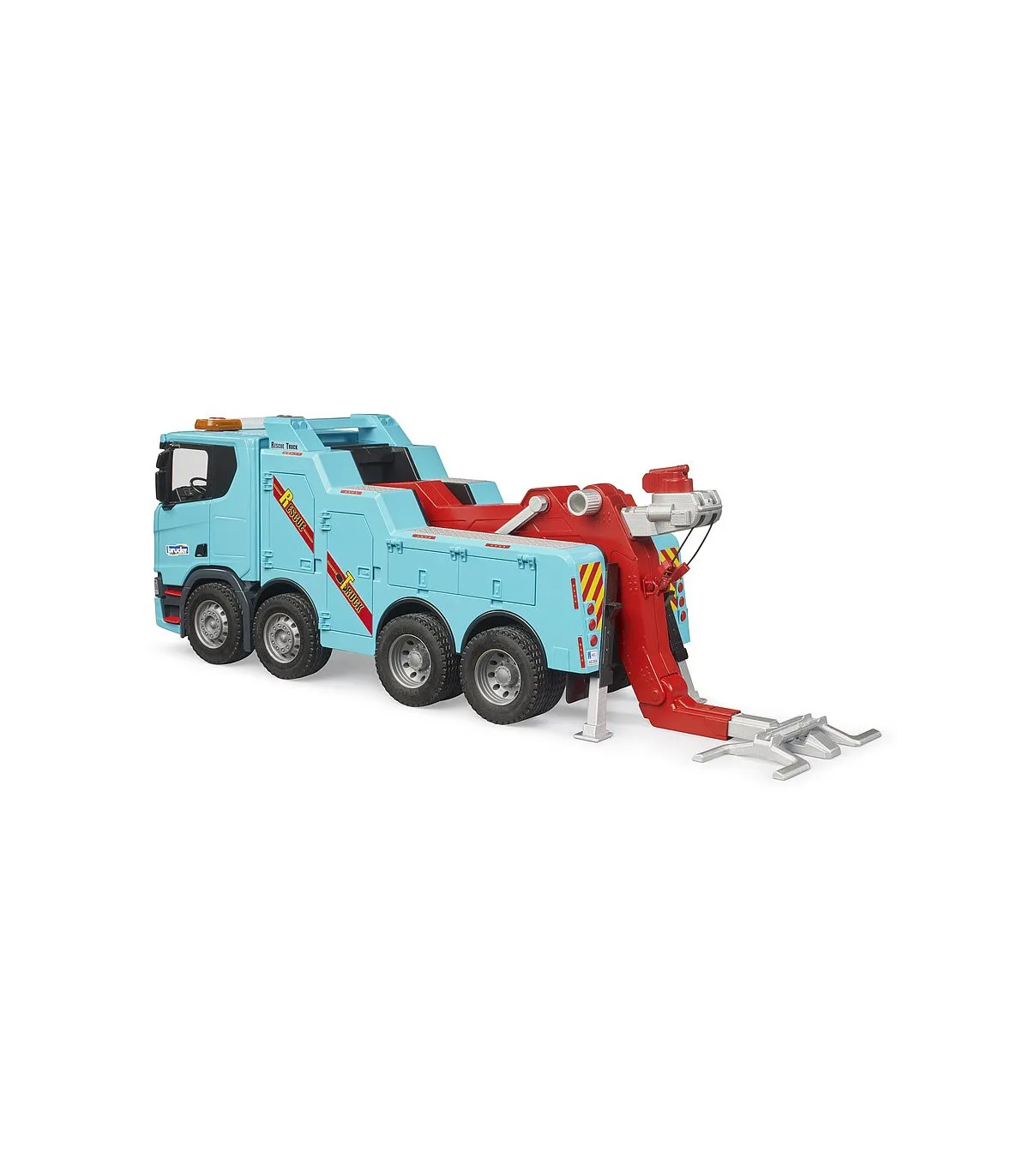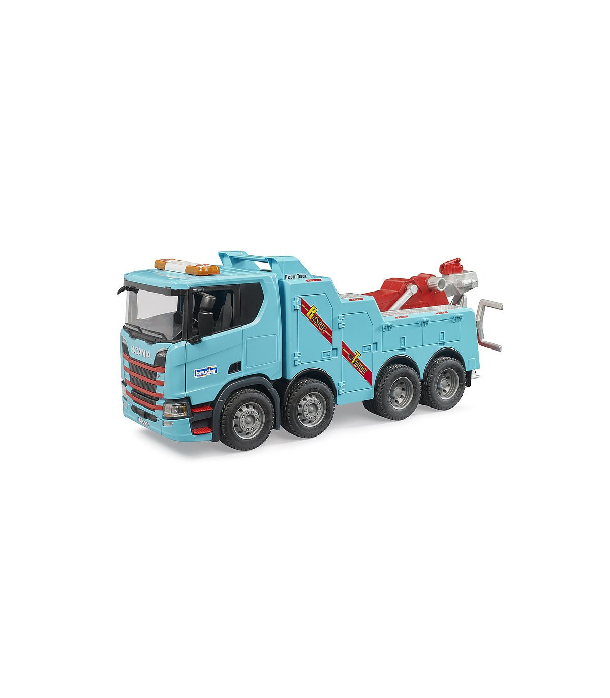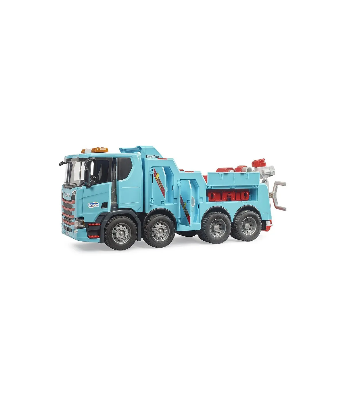 Los camiones-grúa de rescate y remolque para vehículos industriales y camiones son algunos de los vehículos más llamativos que los niños pueden descubrir en nuestras carreteras. Pero por lo que más impresionan estos vehículos es por su potencia y tecnología extraordinarias. Con BRUDER, los niños pueden descubrir y reproducir estas fascinantes propiedades en el nuevo camión de rescate y remolque Scania Super 560R. El gancho de remolque se puede abatir y sostiene las ruedas delanteras del vehículo que se va a remolcar. Detrás de una de las muchas trampillas que se pueden abrir se encuentra el ajuste de altura del brazo principal, con el que se eleva el brazo principal junto con el vehículo. En la punta del brazo principal telescópico hay un torno de cable. Con un adaptador incluido en el suministro, que se fija al parachoques del MAN TGS, MB Arocs, MACK, SCANIA que se va a remolcar, junto con el torno de cable, se puede rescatar un vehículo accidentado y tirar de él hacia el gancho de remolque.