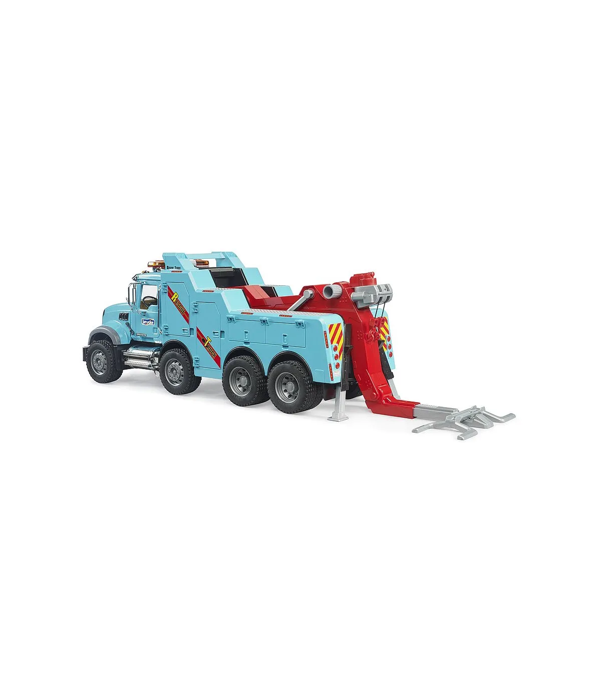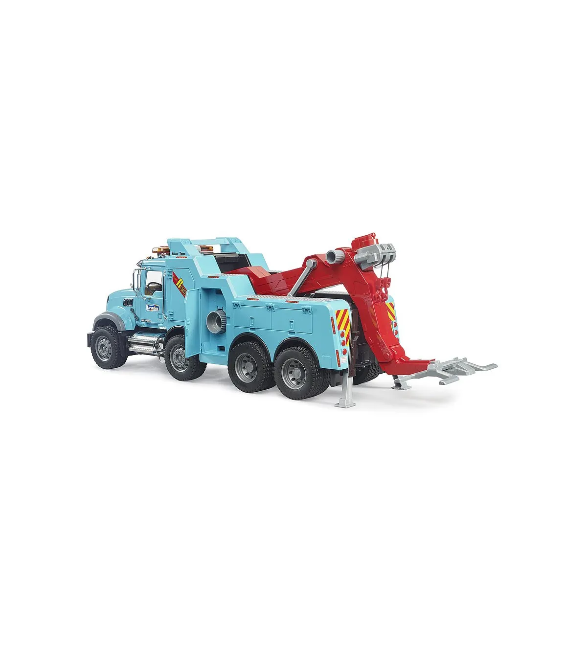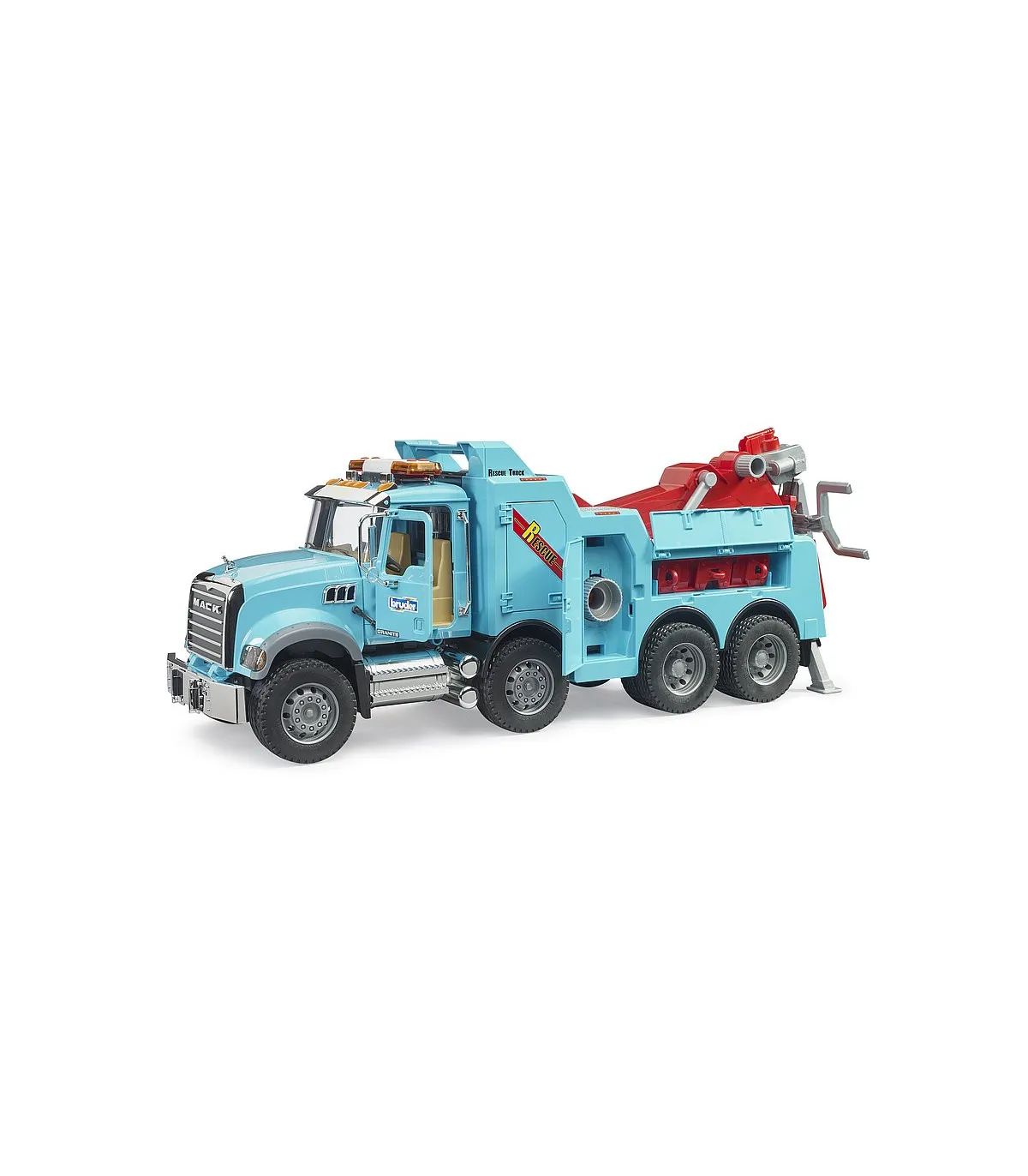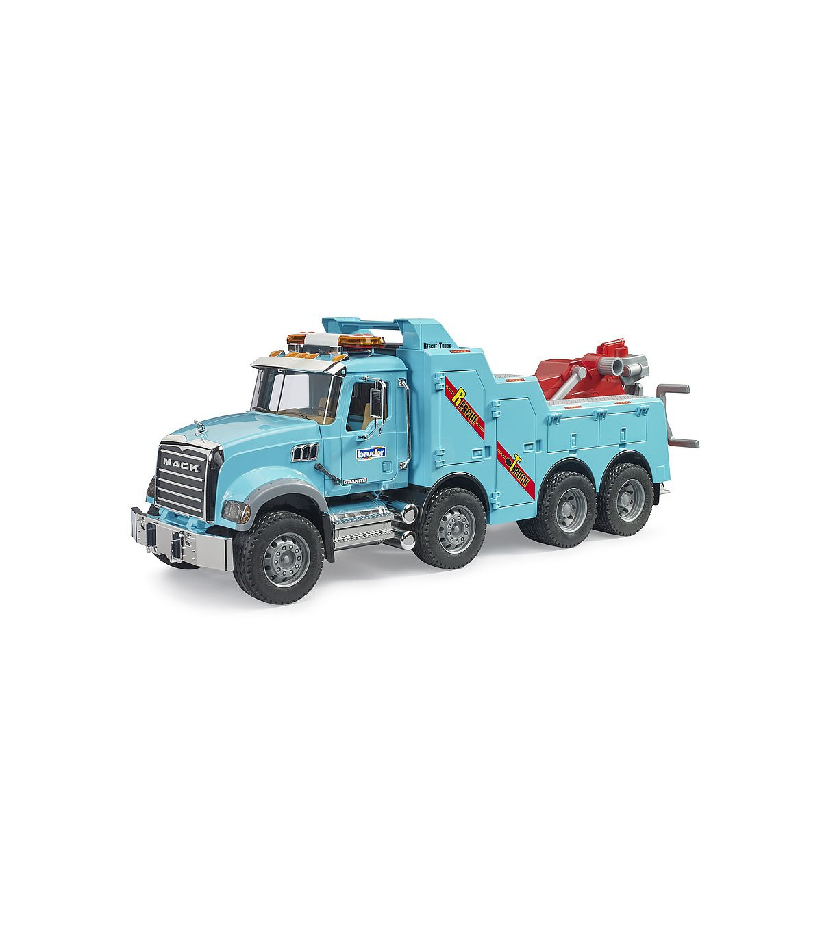 Los camiones-grúa de rescate y remolque para vehículos industriales y camiones son algunos de los vehículos más llamativos que los niños pueden descubrir en nuestras carreteras. Pero por lo que más impresionan estos vehículos es por su potencia y tecnología extraordinarias. Con BRUDER, los niños pueden descubrir y reproducir estas fascinantes propiedades en el nuevo camión de rescate y remolque MACK Granite. El gancho de remolque se puede abatir y sostiene las ruedas delanteras del vehículo que se va a remolcar. Detrás de una de las muchas trampillas que se pueden abrir se encuentra el ajuste de altura del brazo principal, con el que se eleva el brazo principal junto con el vehículo. En la punta del brazo principal telescópico hay un torno de cable. Con un adaptador incluido en el suministro, que se fija al parachoques del MAN TGS, MB Arocs, MACK, SCANIA que se va a remolcar, junto con el torno de cable, se puede rescatar un vehículo accidentado y tirar de él hacia el gancho de remolque.