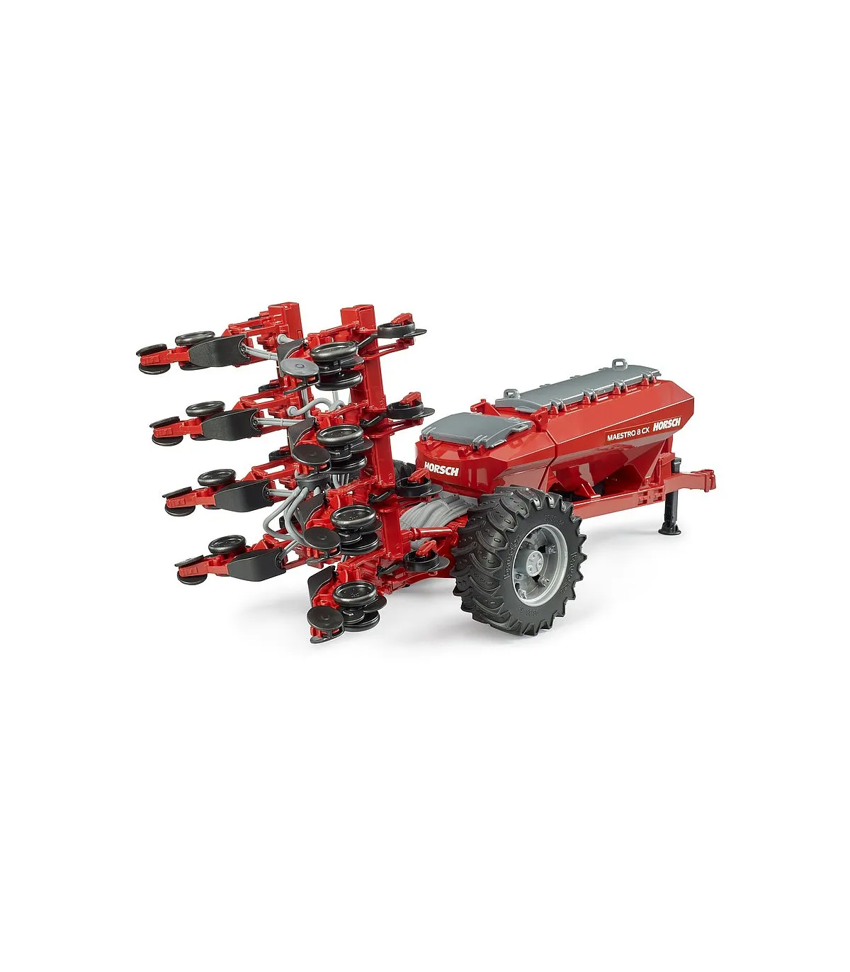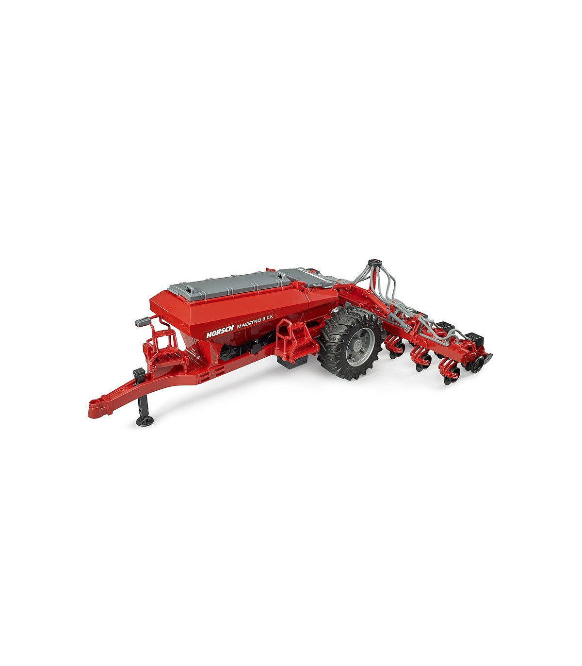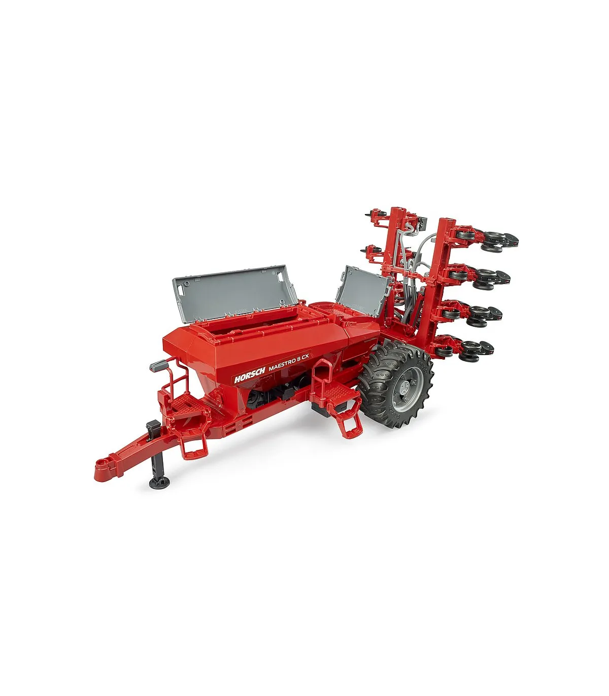 Esta fascinante sembradora es una novedad en la amplia gama agrícola de BRUDER. Para el transporte por carretera, el dispositivo de siembra se puede plegar, y volver a desplegarse para trabajar en el campo. El depósito integrado se puede llenar y cerrarse con una tapa. El remolque se vacía a través de una corredera de salida en el suelo del depósito. Los tractores de las series 3000 y 4000 de BRUDER combinan a la perfección como vehículo tractor para esta imponente sembradora.