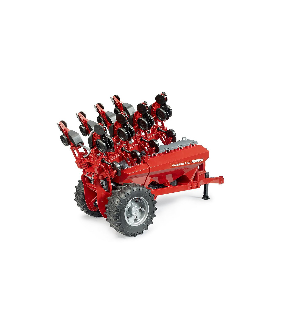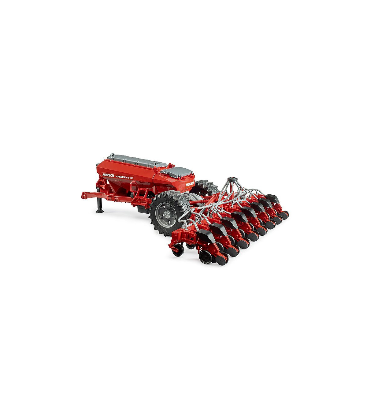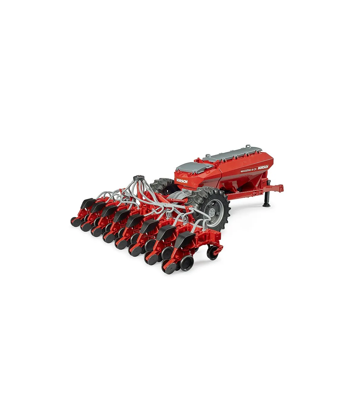 Esta fascinante sembradora es una novedad en la amplia gama agrícola de BRUDER. Para el transporte por carretera, el dispositivo de siembra se puede plegar, y volver a desplegarse para trabajar en el campo. El depósito integrado se puede llenar y cerrarse con una tapa. El remolque se vacía a través de una corredera de salida en el suelo del depósito. Los tractores de las series 3000 y 4000 de BRUDER combinan a la perfección como vehículo tractor para esta imponente sembradora.