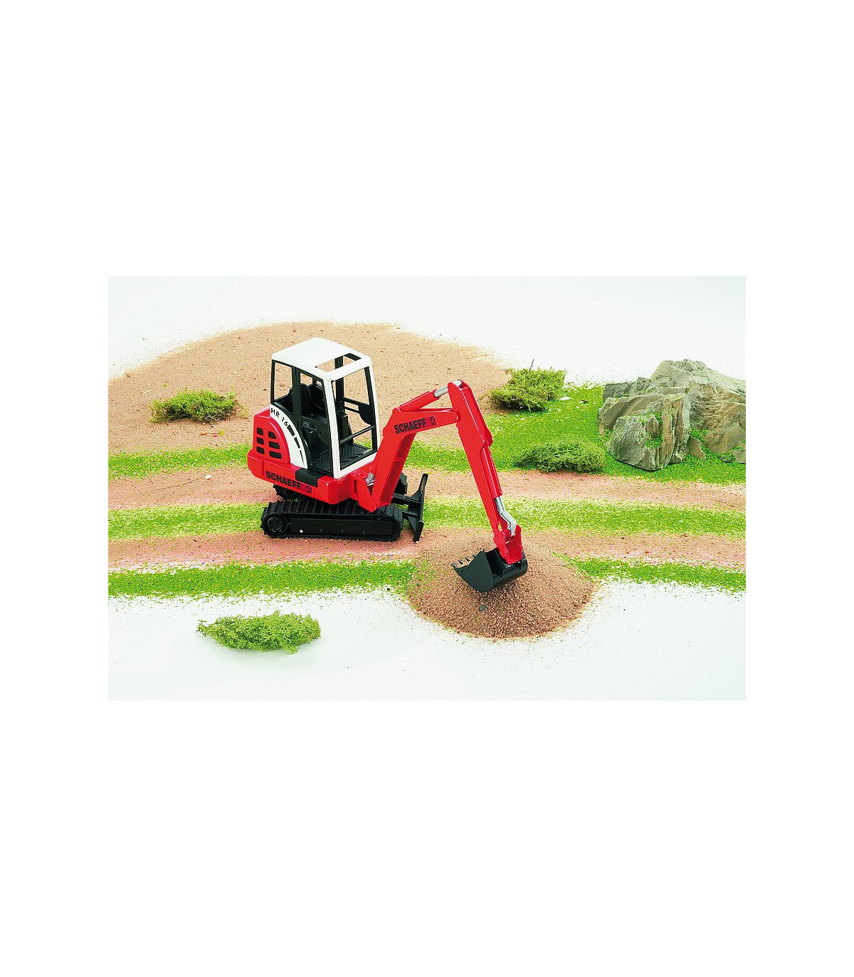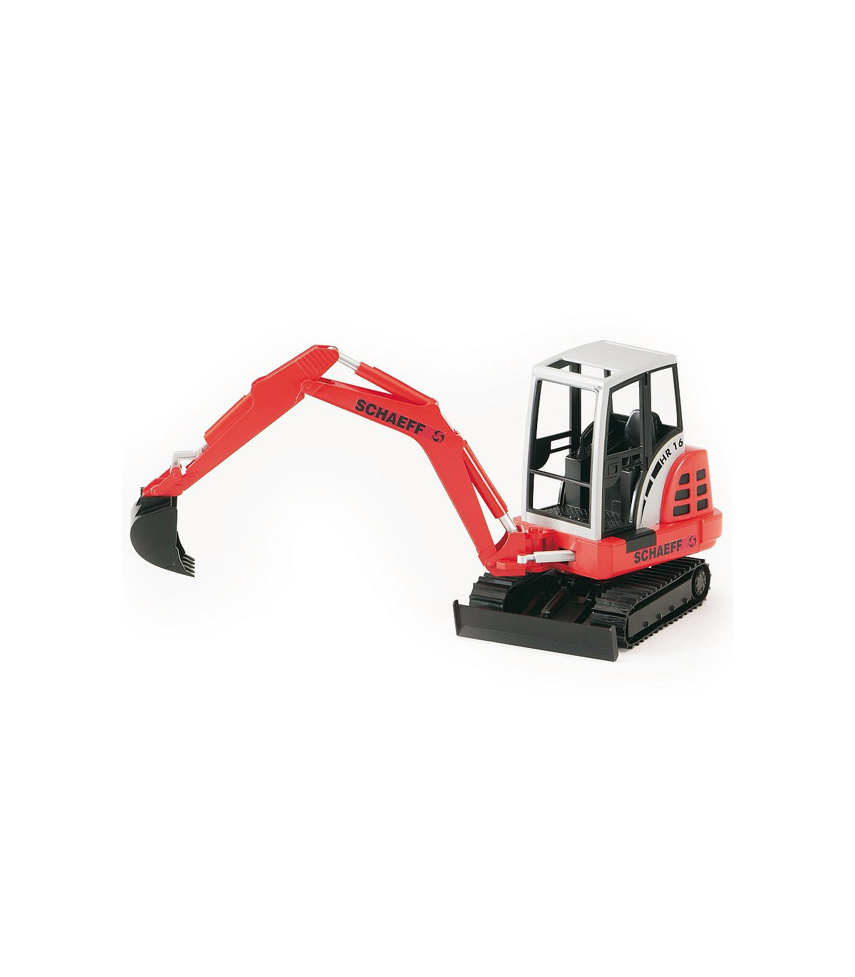 El brazo de la excavadora es completamente funcional y la pala es extraíble y la hoja ajustable. El brazo de la miniexcavadora Schaeff se puede inclinar hacia un lado, lo que permite una función de excavadora realista. Además, la cabina del conductor de la miniexcavadora Schaeff se puede girar 360 ° y las cintas de goma le permiten rodar silenciosamente.