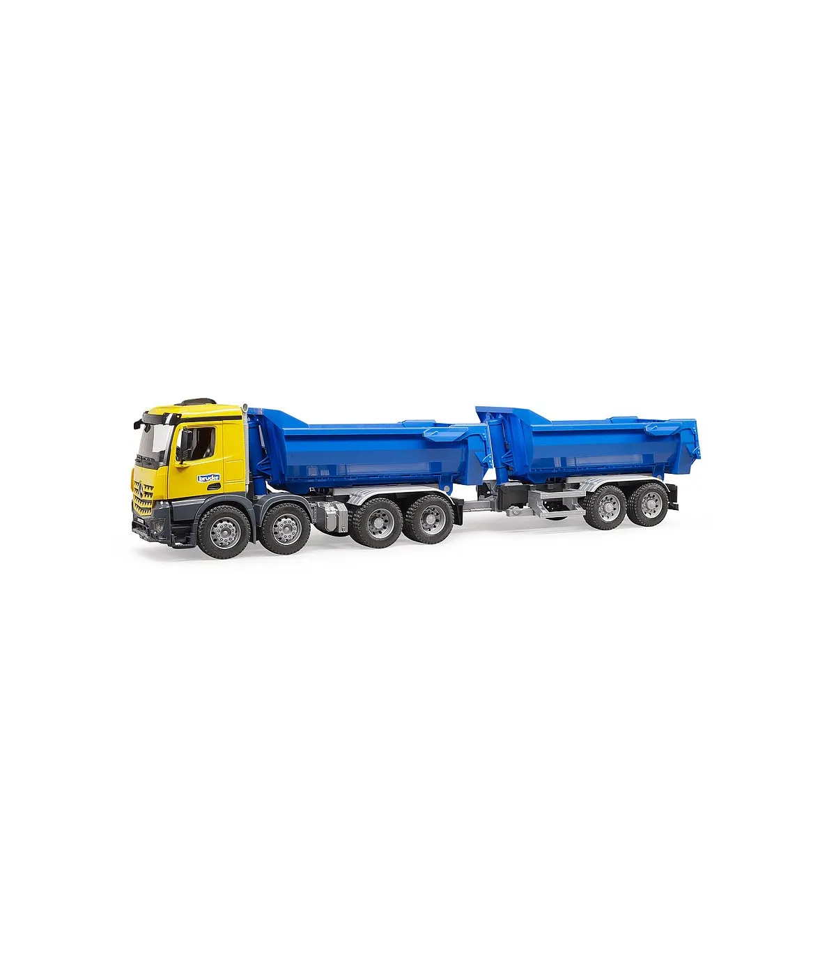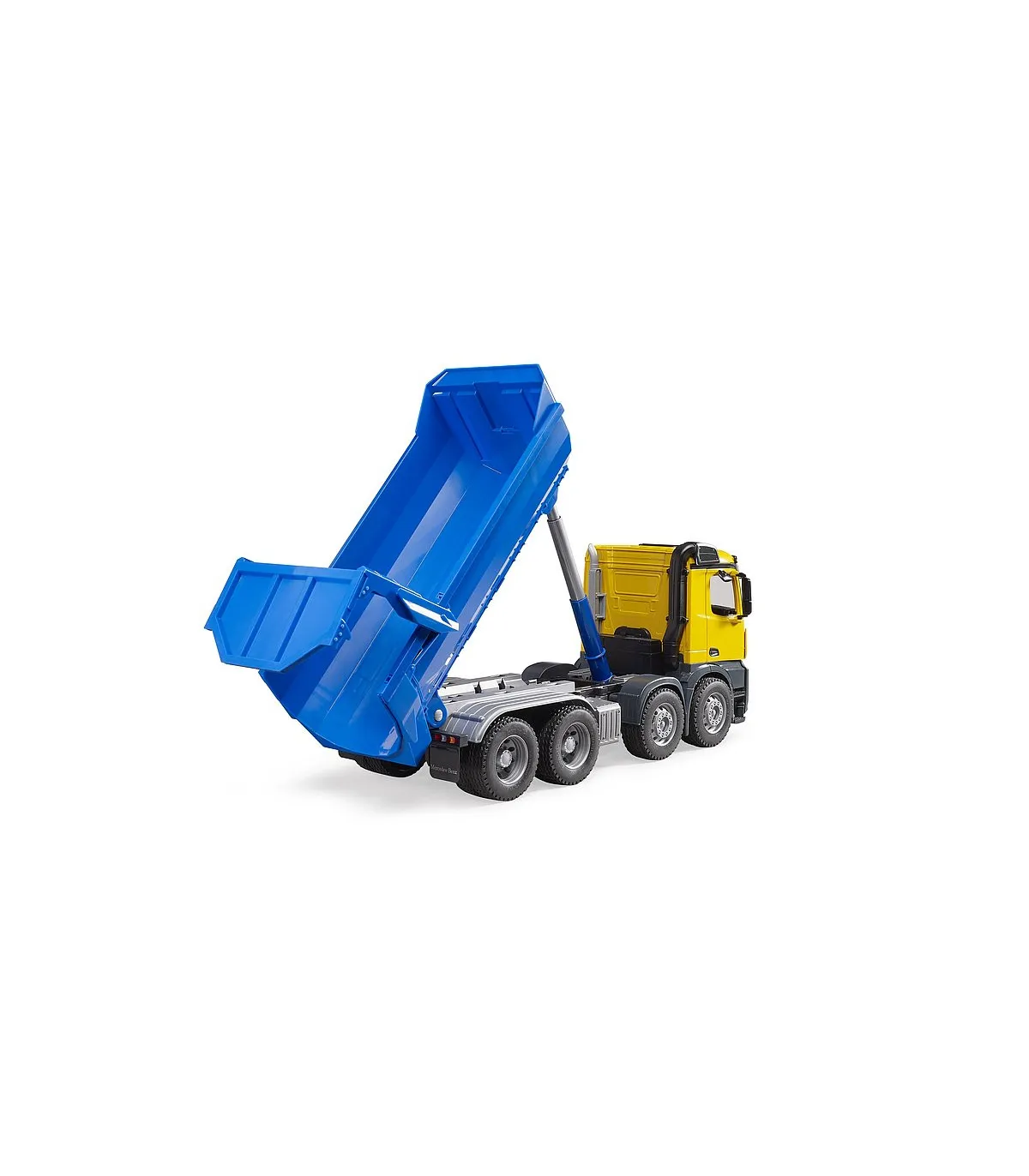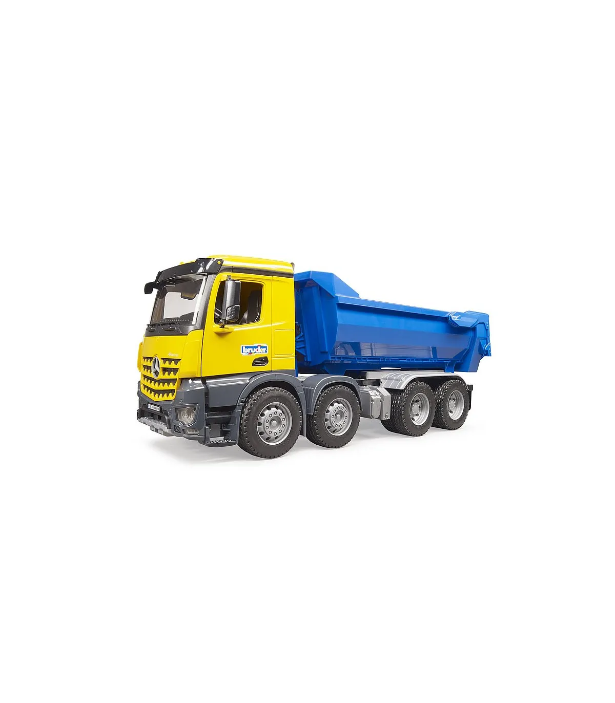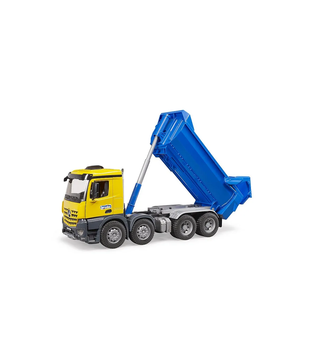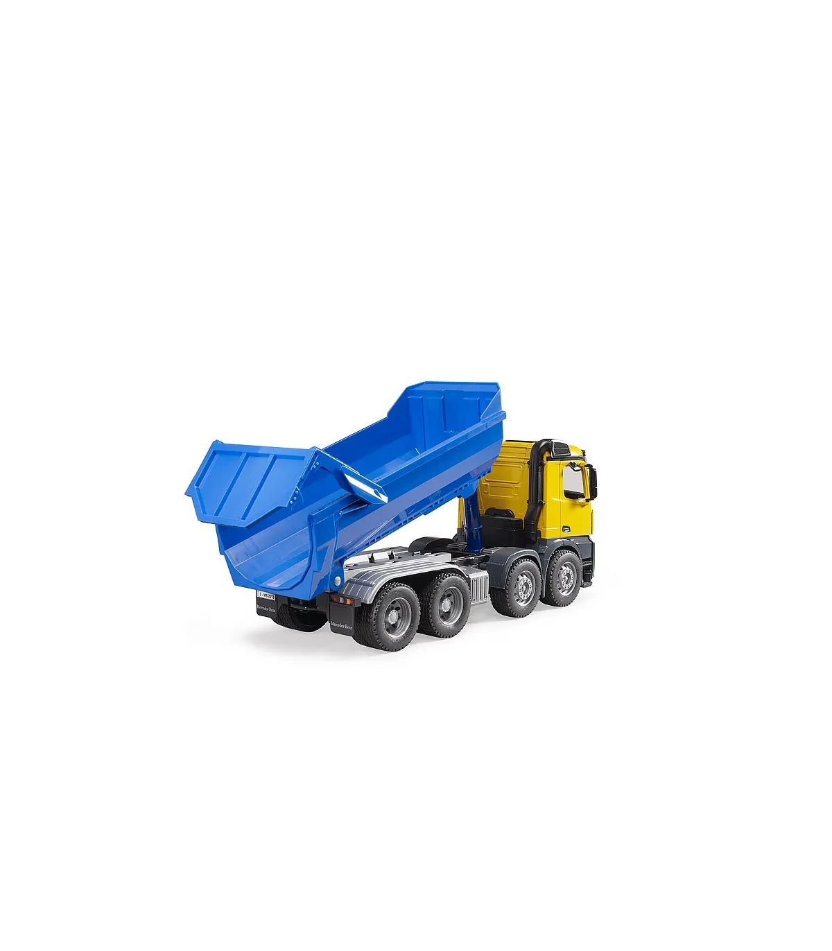 La fuerza, la resistencia y la eficiencia suelen ser factores decisivos en un día de trabajo en carreteras y obras. El nuevo Mercedes-Benz Arcos ha sido construido específicamente para cubrir estas necesidades. Pero además de sus extraordinarias características técnicas, también se ha revisado su diseño. Así, por ejemplo, la parte delantera de la rejilla del radiador obedece a un diseño tipo "diente de excavadora", en el que los "dientes" son la expresión de la capacidad para abrirse paso y de meterse a fondo, y con ello, de la enorme fuerza del vehículo. El diseño del modelo fue adaptado haciendo gran hincapié en la robustez habitual de BRUDER, y se añadieron puertas que se pueden abrir, para que las figuras BRUDER puedan subirse al vehículo. Gracias a su especial forma semicircular, la carga se coloca automáticamente en el centro, lo cual resulta útil tanto para conducir como para efectuar la descarga con total facilidad. El cilindro de la caja extensible en tres tramos y la puerta posterior pueden regularse en diferentes niveles para permitir muchas posibilidades de juego.