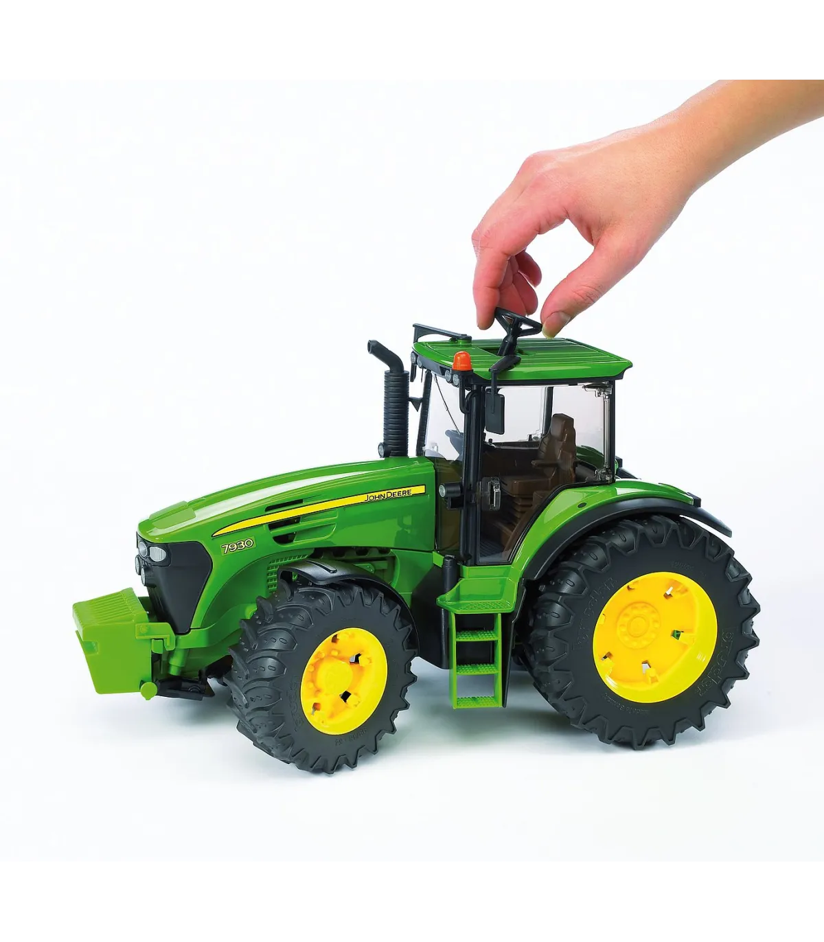 Con la introducción de la serie 03000 de tractores grandes en otoño de 2004, BRUDER estableció en el mercado una gama de tractores de juguete de gran éxito que no puede ser superada en términos de funcionalidad y estética. A esta gama se añade el modelo John Deere 7930. Tiene las mismas características que los otros modelos de estos grandes tractores, como cabinas totalmente acristaladas con puertas que se pueden abrir, un peso delantero desmontable, un eje delantero pendular todoterreno y un enganche de remolque ajustable en altura. El exclusivo sistema de juego / dirección con la extensión del volante a través del techo de la cabina también hace que este tractor sea fácil de conducir para los niños a pesar del acristalamiento de la cabina. Por supuesto, todos los remolques e implementos agrícolas de BRUDER caben en este tractor