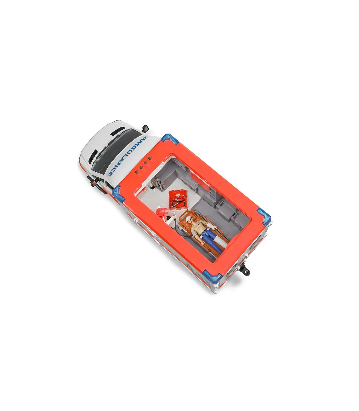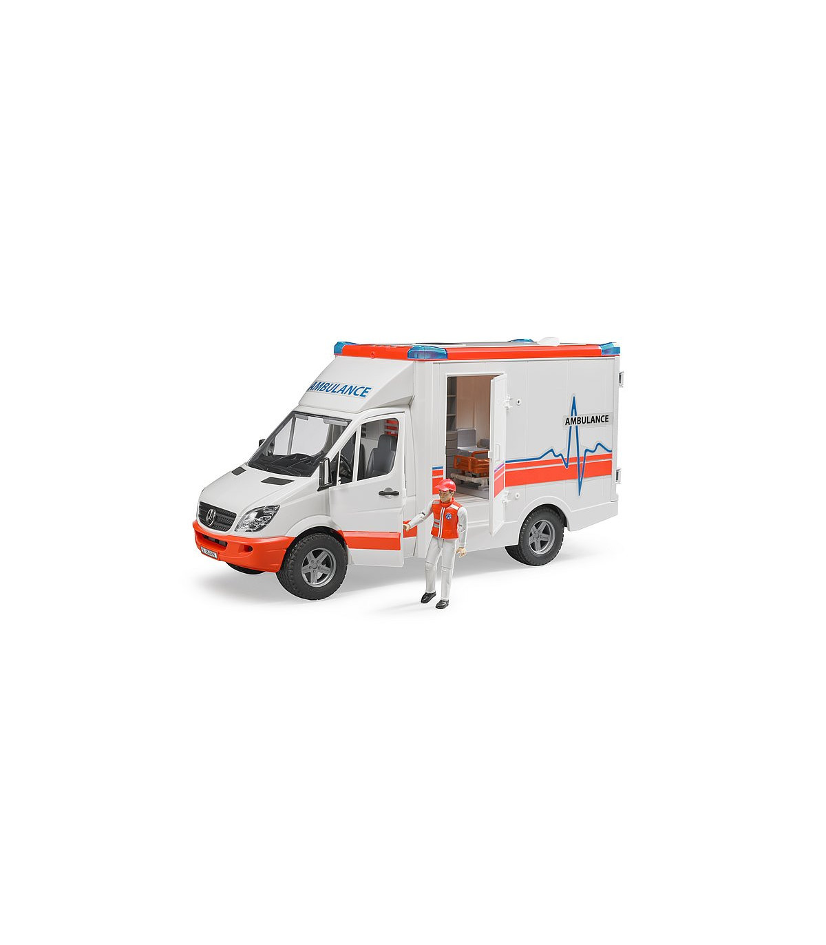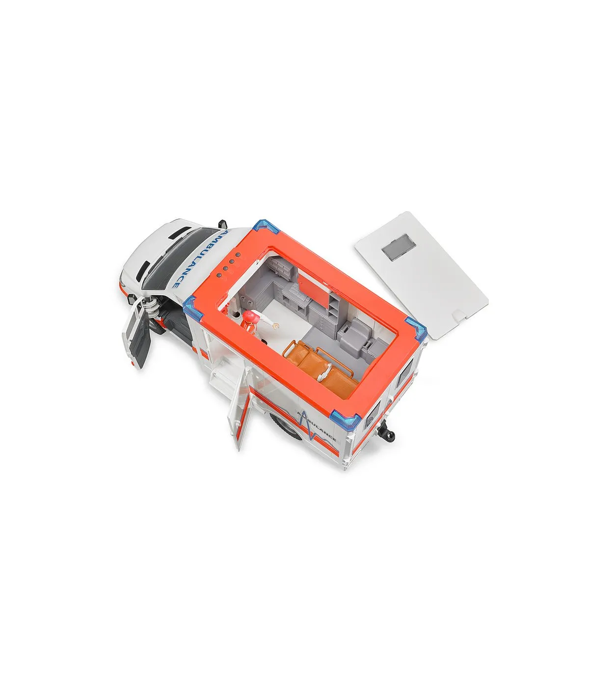 Los vehículos de servicio juegan un papel muy importante en BRUDER. Para completar este surtido se acaba de incorporar la ambulancia MB Sprinter. Este vehículo, equipado con un gran número de funciones, no puede faltar cuando se represente una emergencia. El paramédico incluido en el volumen de suministro puede acceder a la cabina del conductor por las puertas que se pueden abrir. Con el nuevo módulo de luz y sonido (Light & Sound Module) integrado con diferentes sirenas y luces, la ambulancia llega rápidamente y de forma segura al lugar de la emergencia. El pequeño paramédico tiene acceso a la moderna área de trabajo tanto por las puertas traseras y lateral que se pueden abrir, así como por el módulo del techo extraíble. Cualquier figura bworld puede recibir tratamiento en la camilla de altura regulable que se puede extraer y volver a introducirse y ser transportada de manera segura tal y como dice el lema de Bruder - ¡Igual que en la vida real! Gracias al juego de accesorios 62710, formado por un paramédico y un paciente, se puede aumentar el factor de diversión de este gran vehículo.
