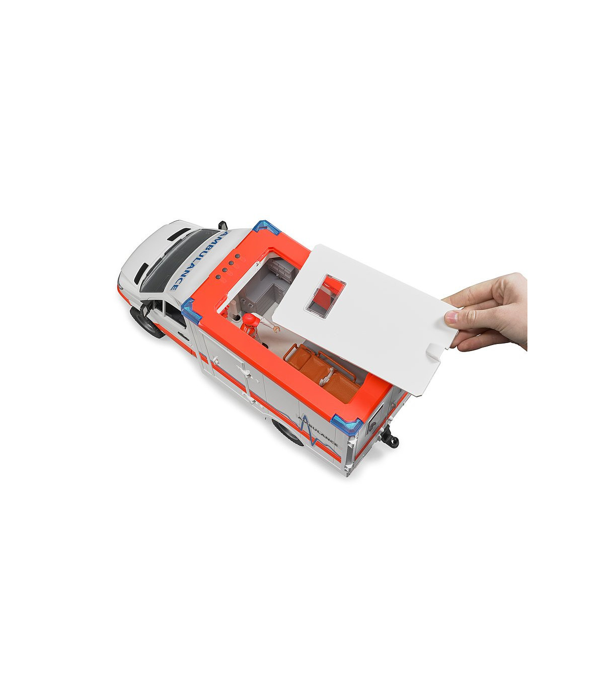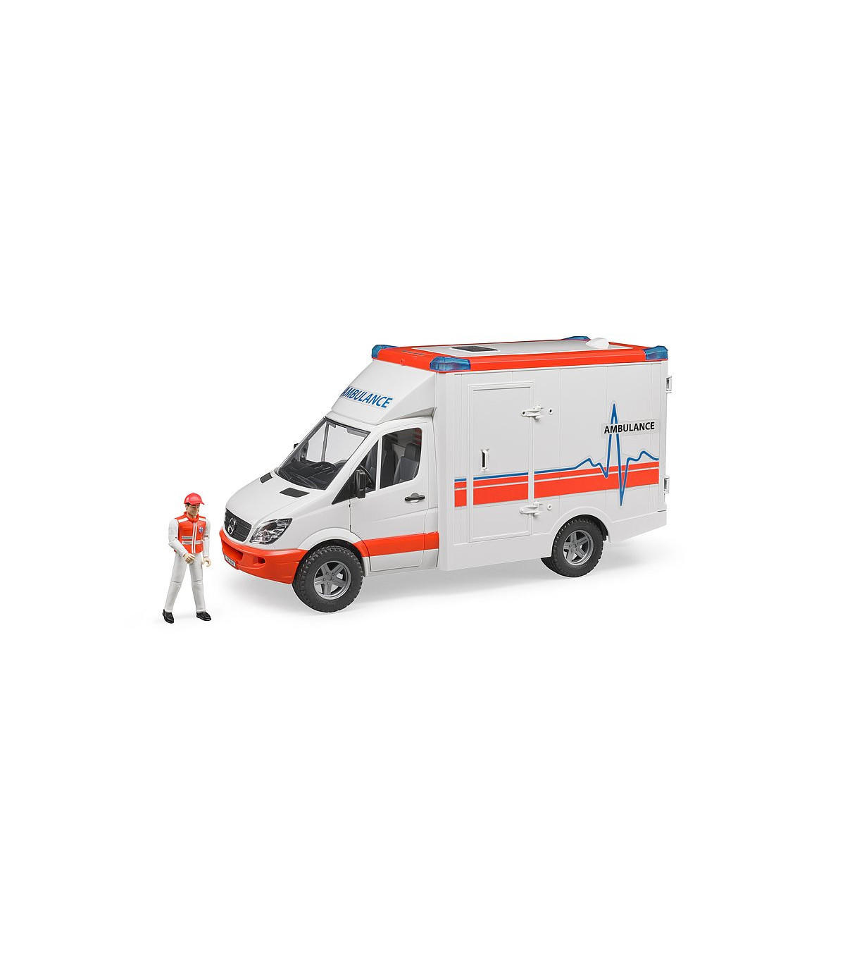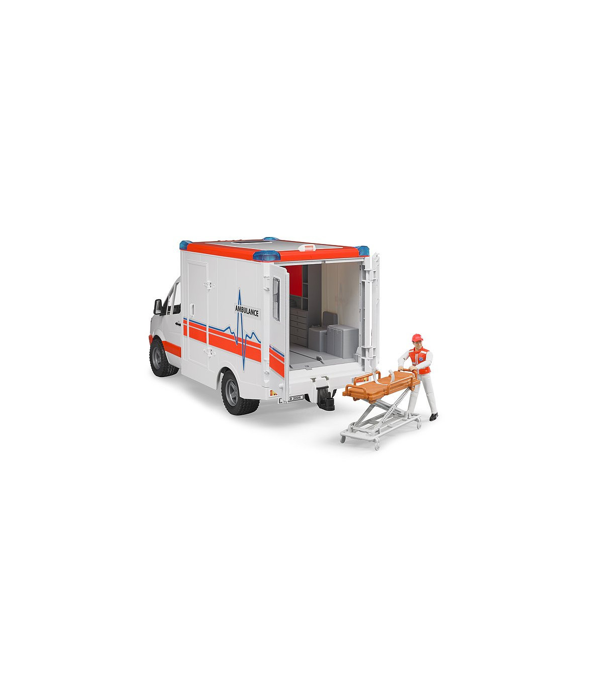 Los vehículos de servicio juegan un papel muy importante en BRUDER. Para completar este surtido se acaba de incorporar la ambulancia MB Sprinter. Este vehículo, equipado con un gran número de funciones, no puede faltar cuando se represente una emergencia. El paramédico incluido en el volumen de suministro puede acceder a la cabina del conductor por las puertas que se pueden abrir. Con el nuevo módulo de luz y sonido (Light & Sound Module) integrado con diferentes sirenas y luces, la ambulancia llega rápidamente y de forma segura al lugar de la emergencia. El pequeño paramédico tiene acceso a la moderna área de trabajo tanto por las puertas traseras y lateral que se pueden abrir, así como por el módulo del techo extraíble. Cualquier figura bworld puede recibir tratamiento en la camilla de altura regulable que se puede extraer y volver a introducirse y ser transportada de manera segura tal y como dice el lema de Bruder - ¡Igual que en la vida real! Gracias al juego de accesorios 62710, formado por un paramédico y un paciente, se puede aumentar el factor de diversión de este gran vehículo.