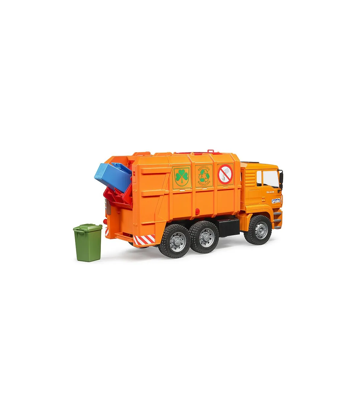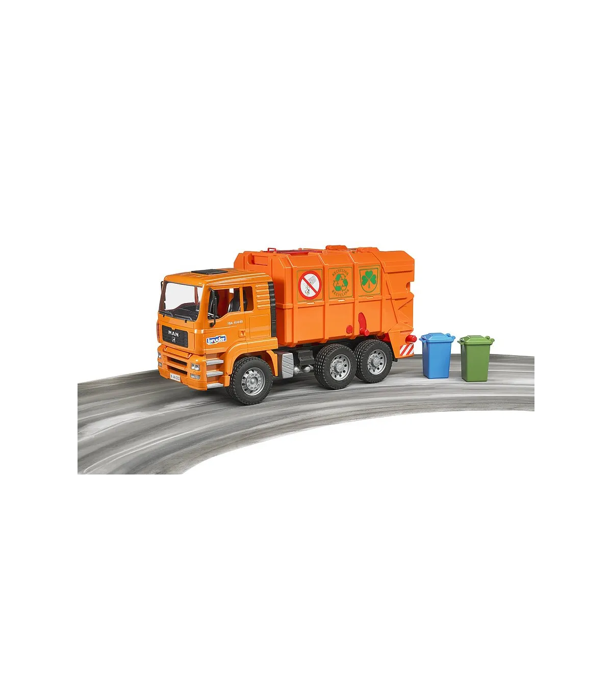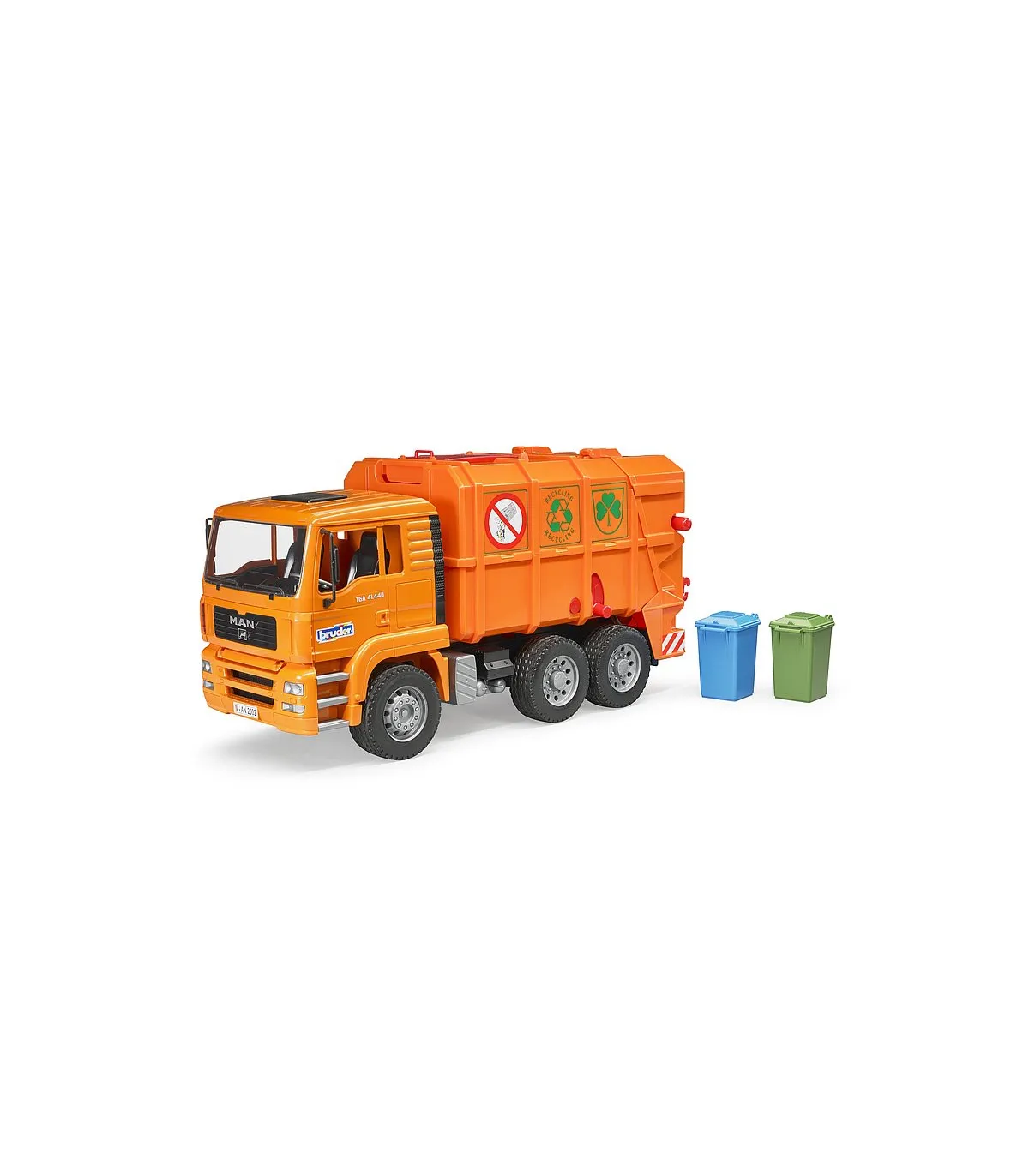 La cabina de conductor basculante del camión de la basura MAN permite ver el bloque de motor. Los espejos de la cabina del conductor son abatibles. El vaciado de los pequeños contenedores de basura de colores se realiza mediante un dispositivo de volcado funcional con elevador de contenedores. El contenedor de basura dispone de una palanca de transporte de basura colocada en un lateral y es basculante. El contenedor de basura se puede volver a vaciar mediante el portón trasero que se puede abrir. Los neumáticos perfilados completan el conjunto. Para hacerlo más divertido, el camión de la basura MAN TGA se puede equipar con el juego de contenedores de basura (3 pequeños "de colores", 1 contenedor "gris" grande), n.º de art.: 02607 y los módulos de luz y sonido (Light & Sound Module), n.º de art.: 02801, así como 02802 (no incluidos en el volumen de suministro)