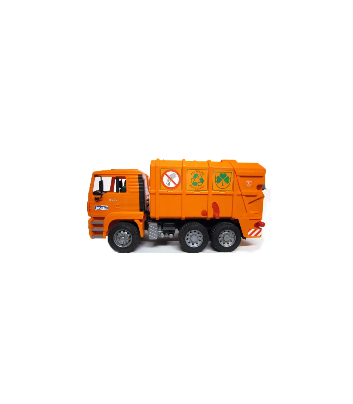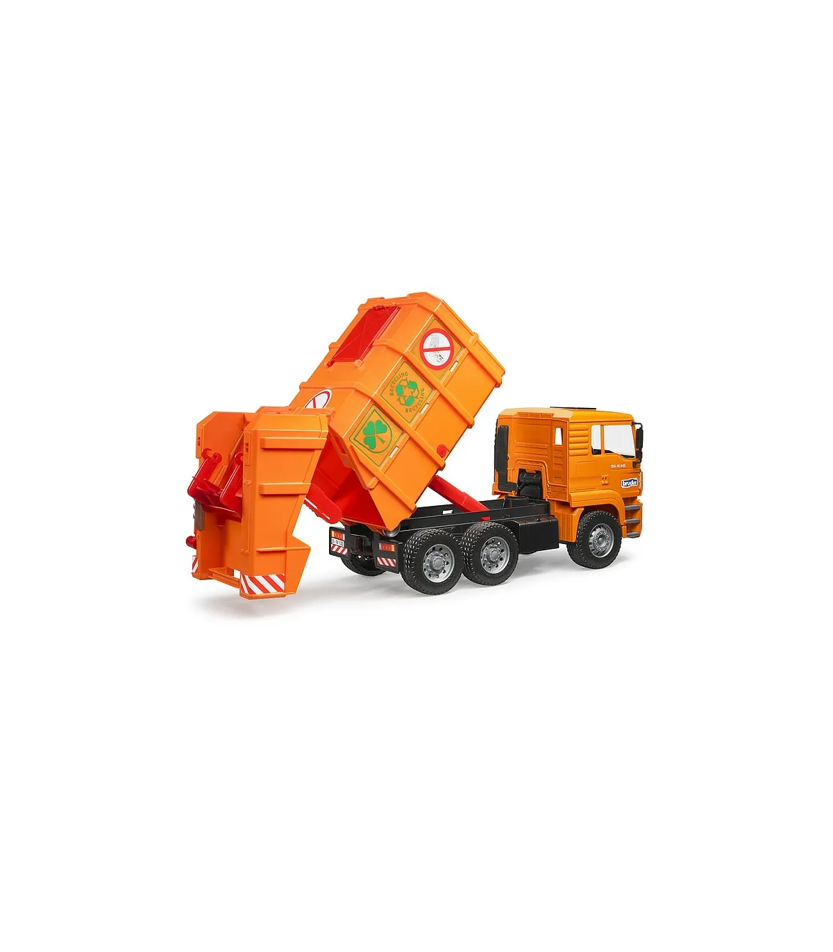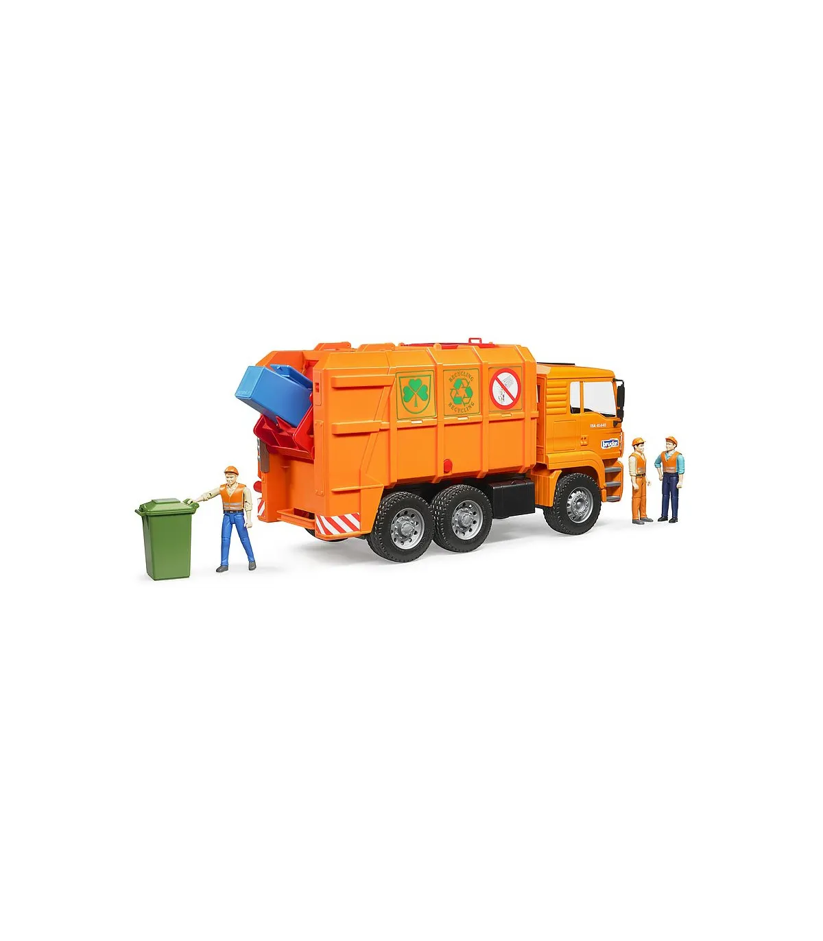 La cabina de conductor basculante del camión de la basura MAN permite ver el bloque de motor. Los espejos de la cabina del conductor son abatibles. El vaciado de los pequeños contenedores de basura de colores se realiza mediante un dispositivo de volcado funcional con elevador de contenedores. El contenedor de basura dispone de una palanca de transporte de basura colocada en un lateral y es basculante. El contenedor de basura se puede volver a vaciar mediante el portón trasero que se puede abrir. Los neumáticos perfilados completan el conjunto. Para hacerlo más divertido, el camión de la basura MAN TGA se puede equipar con el juego de contenedores de basura (3 pequeños "de colores", 1 contenedor "gris" grande), n.º de art.: 02607 y los módulos de luz y sonido (Light & Sound Module), n.º de art.: 02801, así como 02802 (no incluidos en el volumen de suministro)