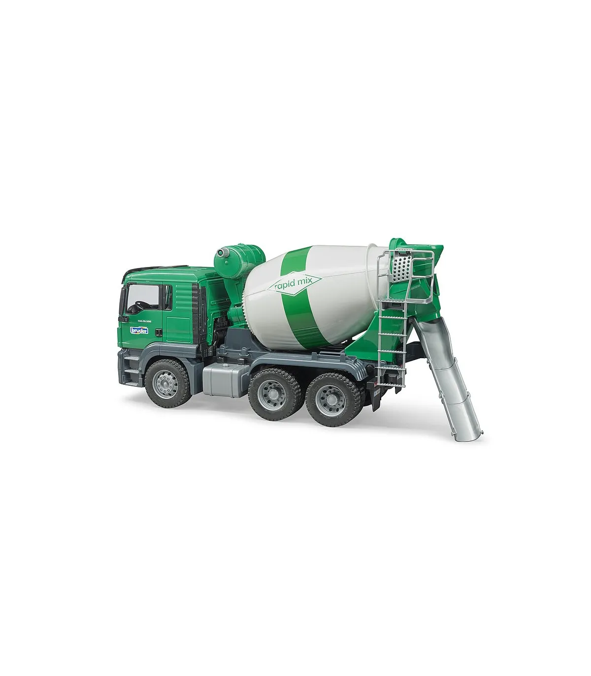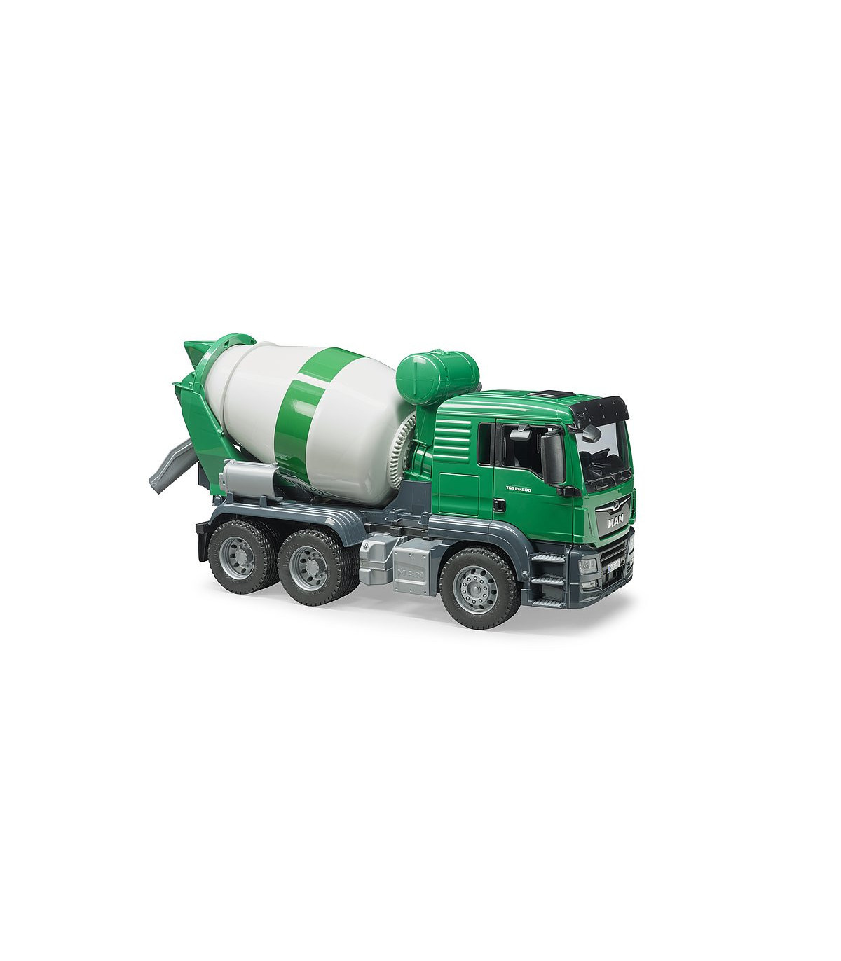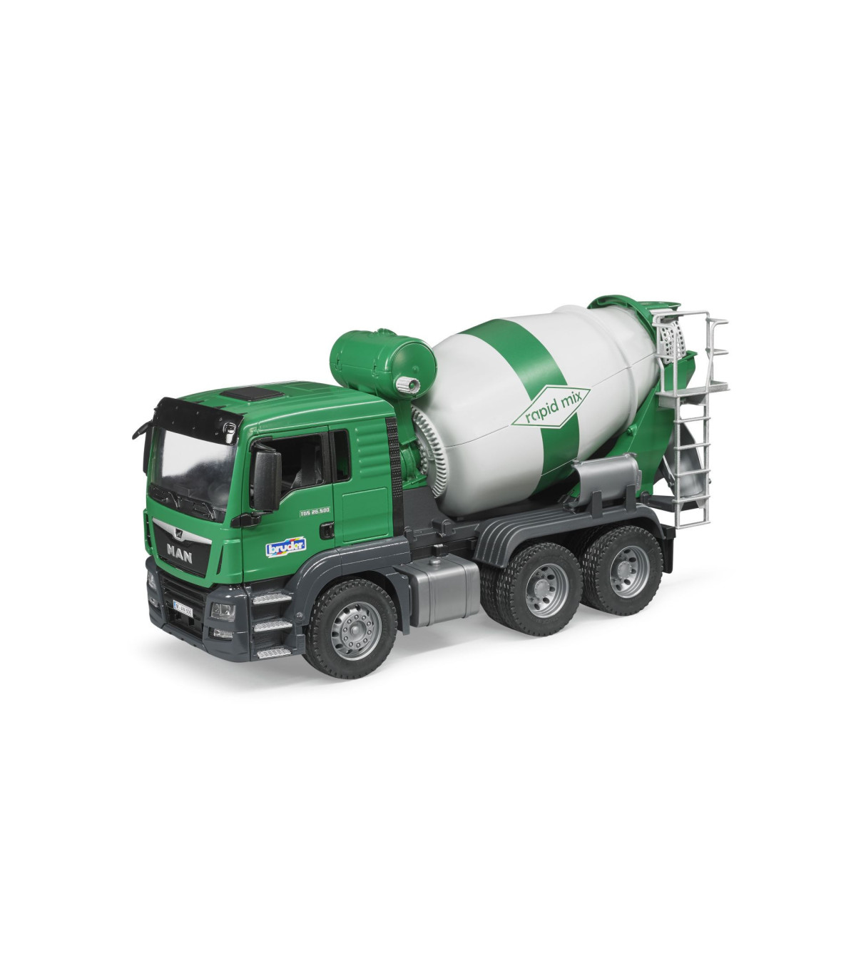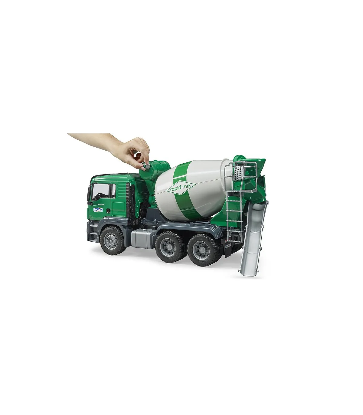El camión MAN TGS es el todoterreno ideal para obras, transporte de larga distancia y distribución a corta distancia. De construcción robusta, equipado con motores de gran potencia y con una carga útil superior a la media, este camión es el prototipo del vehículo "puedelotodo" del que tanto se habla y que incorpora gran cantidad de innovaciones. El modelo Bruder del camión hormigonera MAN TGS en escala 1:16 combina la nueva cabina del conductor de MAN con la estructura creada mediante un nuevo diseño para este camión. La cabina bicolor del conductor dispone de puertas que se pueden abrir y ofrece un espacio de trabajo moderno a cada figura bworld. La cabina dispone de una conexión para instalar el módulo de luz y sonido opcional (Light & Sound Module, n.º de art. 02801 + 02802). El tambor del camión-hormigonera se puede girar mediante una manivela montada en el depósito de agua. Además, este tambor contiene un transportador sinfín y de mezcla y, al igual que en el original, se vacía cambiando la dirección de giro. Seguidamente, el tornillo sinfín en el interior del tambor transporta el producto llenado hacia atrás en dirección al tobogán de descarga. También se incluyen dos placas de extensión que pueden acoplarse a este tobogán. Una figura bworld puede supervisar el funcionamiento de la mezcladora subiendo por la escalera fijada en un lateral del camión.