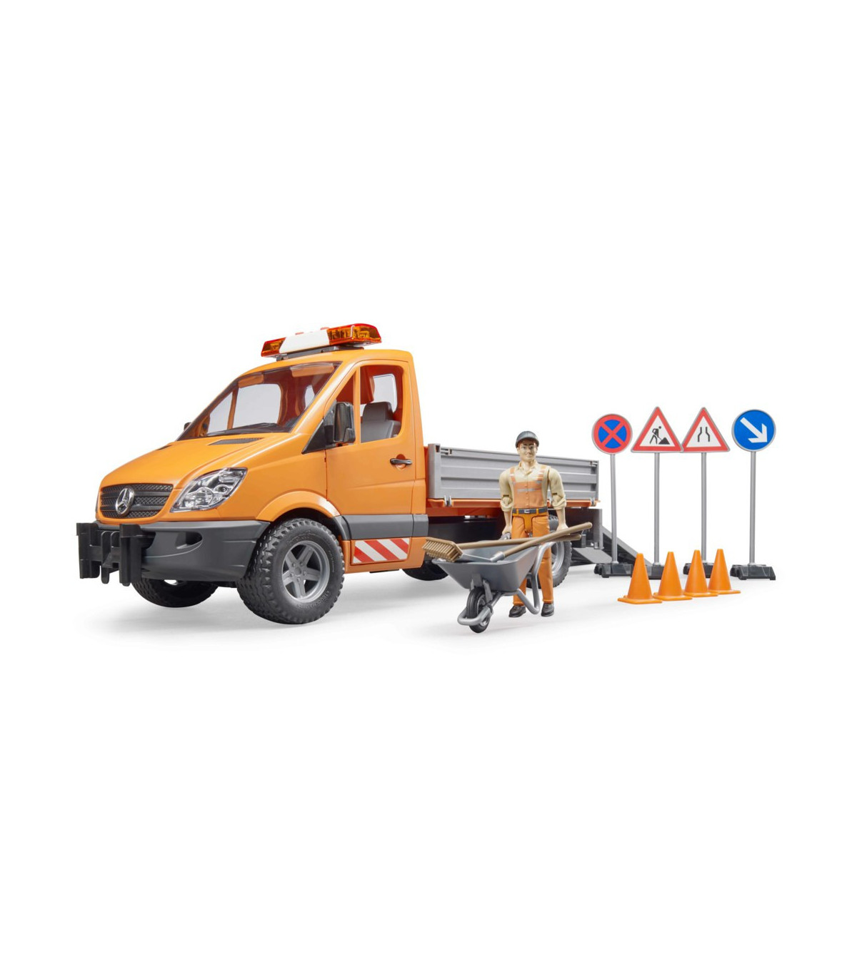 Los trabajos de reparación y mantenimiento en calles, aceras y parques forman parte de la vida diaria de cualquier ciudad o municipio. Debido a su tamaño y versatilidad, la furgoneta Mercedes-Benz Sprinter es el vehículo preferido para estos trabajos en muchos municipios. Este vehículo auxiliar imprescindible es una de las novedades de la gama Bruder en la conocida escala 1:16. Posee una caja de carga abatible y los laterales pueden abrirse. Para el transporte de vehículos pequeños, incluye rampas de acceso acoplables. Para que la diversión de juego pueda comenzar de inmediato, el vehículo ya viene con el trabajador de la construcción Bruder junto con su carretilla, herramientas, señales y pilones. Para mayor visibilidad, el Sprinter está equipado con un módulo de luces y sonido. Además de tres diferentes sonidos de sirena, también se puede generar el ruido del motor del vehículo. Con todo esto, ya no hay ningún obstáculo para que los niños se diviertan iniciando las obras en su habitación.