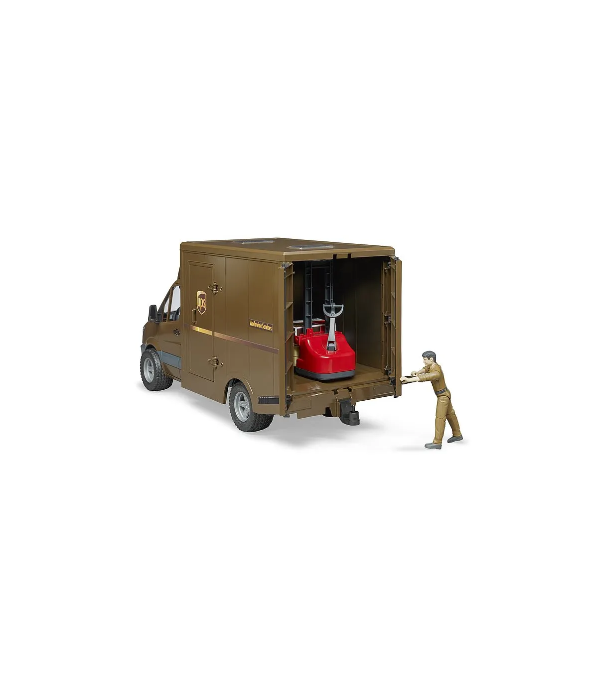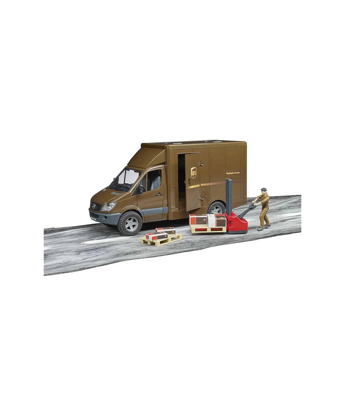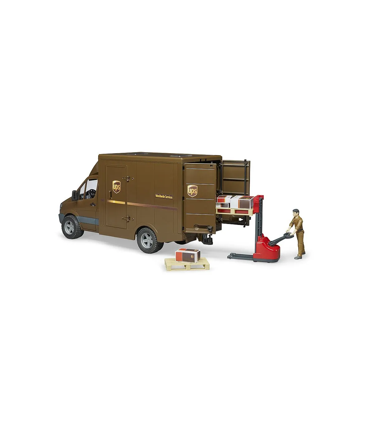 El camión Mercedes-Benz Sprinter es uno de los vehículos más importantes en el segmento de camiones de transporte pequeños. Las posibilidades de utilización universales en combinación con las estructuras más diversas lo hacen imprescindible para el gremio artesanal, en la industria de la construcción, en servicios municipales y en el sector de logística. También UPS, una de las empresas de servicios de envío y transporte más importantes del mundo, apuesta por este camión Sprinter como vehículo de reparto. Este vehículo, que tanto caracteriza la imagen urbana actual, se incorpora ahora como una novedad a la gama de Bruder. Dispone de una puerta trasera de dos piezas cuyas hojas pueden abrirse hasta el tope en la estructura de maletero. A través de una puerta lateral se pueden sacar paquetes pequeños para ahorrar tiempo. El camión incluye como accesorios una carretilla elevadora manual con dos europalés con la que se pueden cargar y descargar mercancías pesadas o voluminosas. Para completar este magnífico set, el conductor del camión UPS está vestido con su uniforme típico. Asimismo, se incluyen las cajas de transporte típicas de UPS en diferentes tamaños.