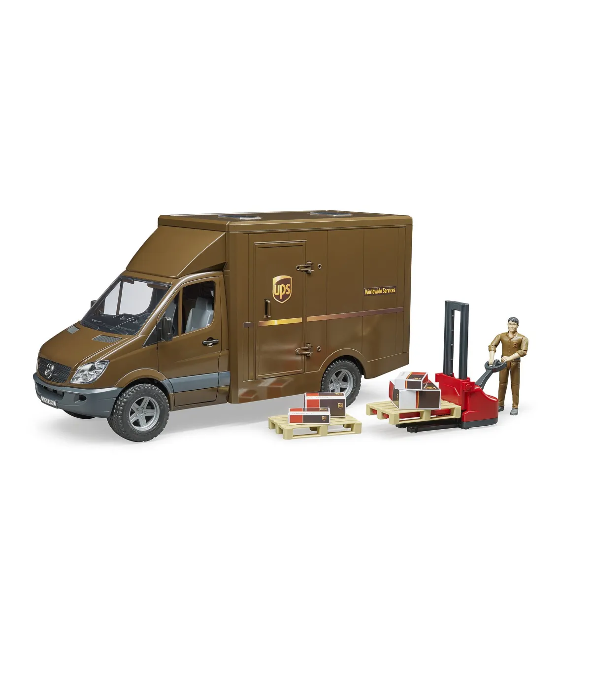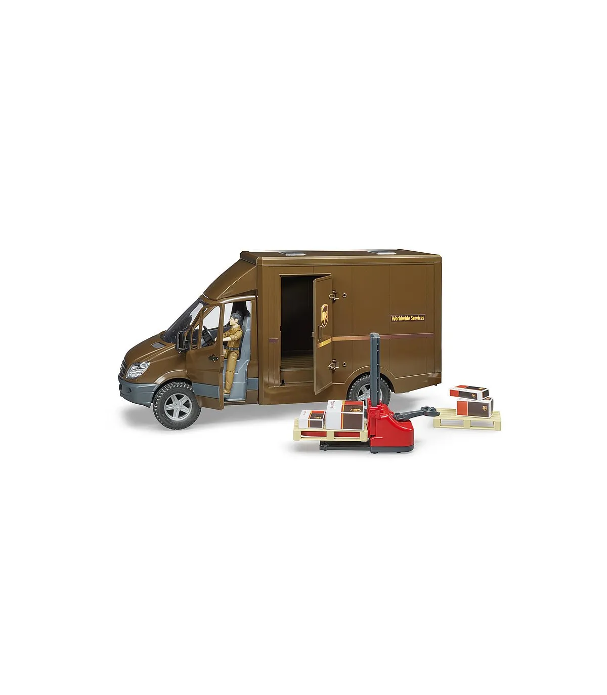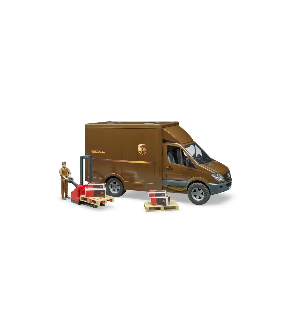 El camión Mercedes-Benz Sprinter es uno de los vehículos más importantes en el segmento de camiones de transporte pequeños. Las posibilidades de utilización universales en combinación con las estructuras más diversas lo hacen imprescindible para el gremio artesanal, en la industria de la construcción, en servicios municipales y en el sector de logística. También UPS, una de las empresas de servicios de envío y transporte más importantes del mundo, apuesta por este camión Sprinter como vehículo de reparto. Este vehículo, que tanto caracteriza la imagen urbana actual, se incorpora ahora como una novedad a la gama de Bruder. Dispone de una puerta trasera de dos piezas cuyas hojas pueden abrirse hasta el tope en la estructura de maletero. A través de una puerta lateral se pueden sacar paquetes pequeños para ahorrar tiempo. El camión incluye como accesorios una carretilla elevadora manual con dos europalés con la que se pueden cargar y descargar mercancías pesadas o voluminosas. Para completar este magnífico set, el conductor del camión UPS está vestido con su uniforme típico. Asimismo, se incluyen las cajas de transporte típicas de UPS en diferentes tamaños.