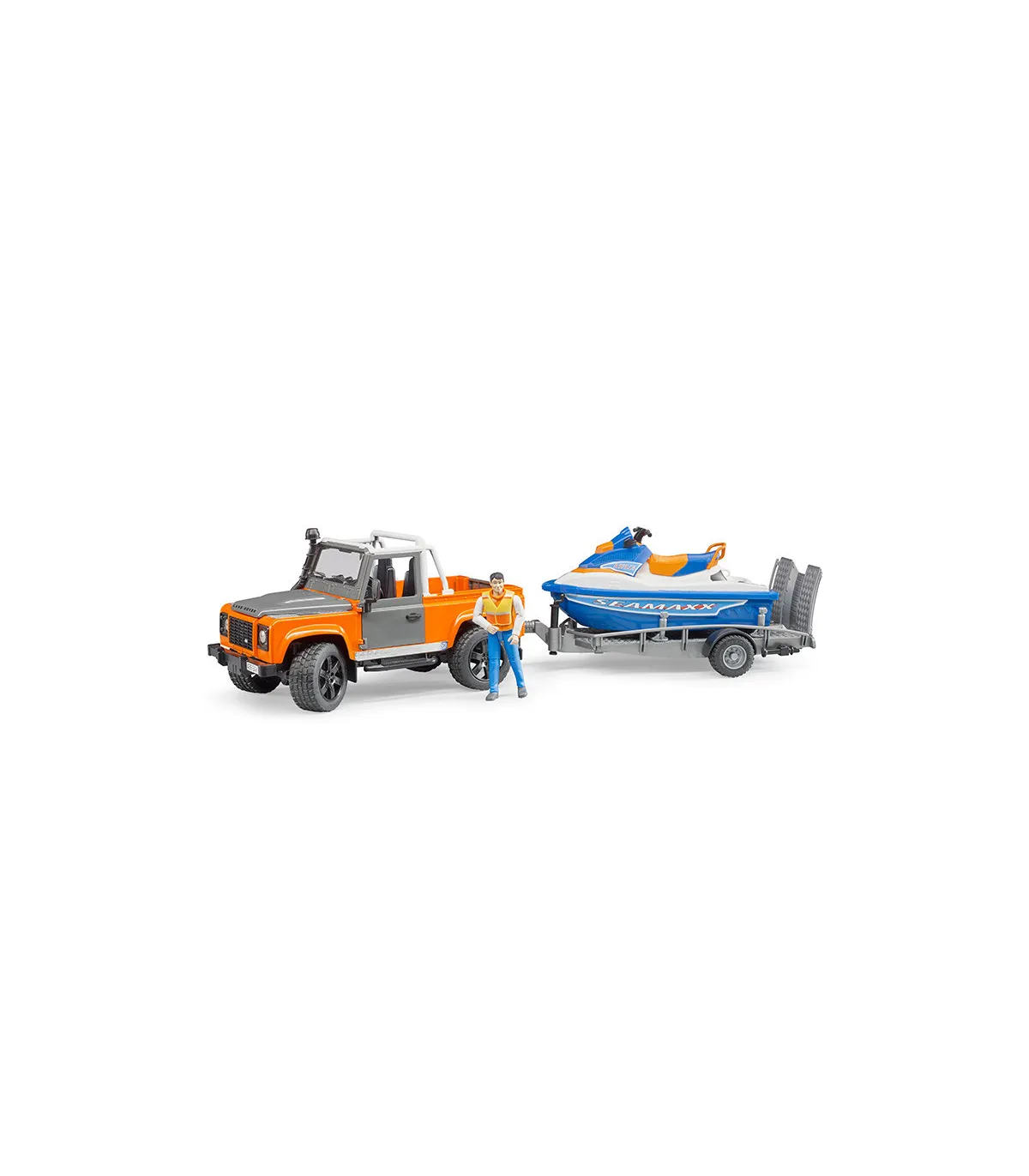 Land Rover Def. Pick Up con remolque moto acuática y piloto.