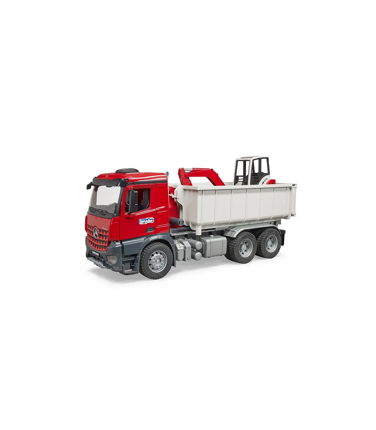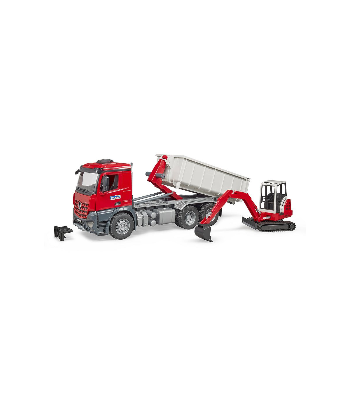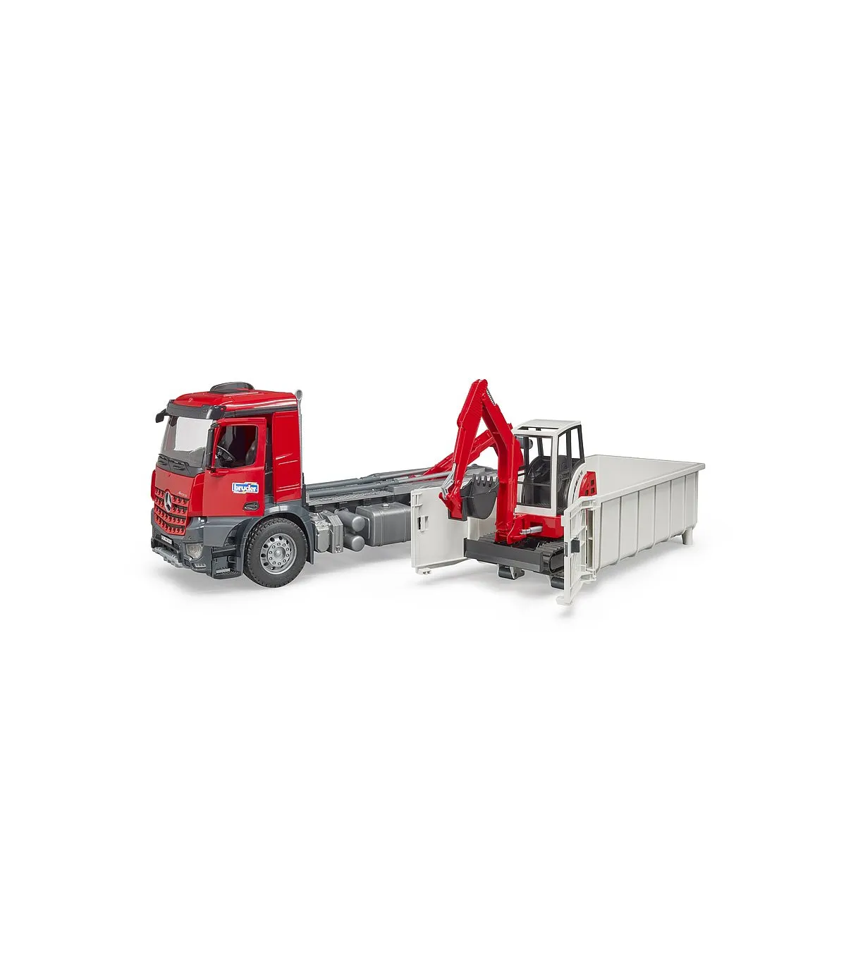 La fuerza, la robustez y la eficiencia suelen ser decisivas en un día de trabajo en carreteras y obras. Por ello, el nuevo Mercedes-Benz Arocs se ha desarrollado especialmente para cubrir esas necesidades. Además de estas características técnicas se desarrolló también un diseño equivalente. En el modelo se ha adoptado el diseño y se ha valorado mucho la robustez que caracteriza a BRUDER, y se ha equipado la cabina del conductor con puertas que se pueden abrir para que las figuras de juguete BRUDER se puedan montar. El contenedor cuenta con dos puertas batientes en el extremo y puede colocarse hacia atrás y recogerse de nuevo con el brazo de agarre. Si el contenedor está en el suelo con las puertas abiertas, pueden introducirse en él los vehículos más pequeños de BRUDER y transportarse con el camión portacontenedores. Esta posibilidad también se utiliza muy a menudo en la realidad en las obras de construcción y los pequeños constructores podrán explorar todas estas posibilidades desde casa. La popular miniexcavadora de Schaeff se incluye ahora en esta gran combinación