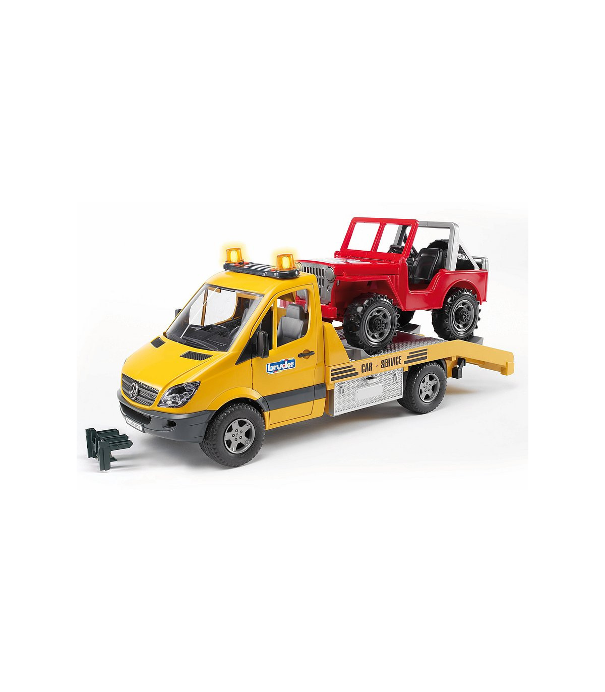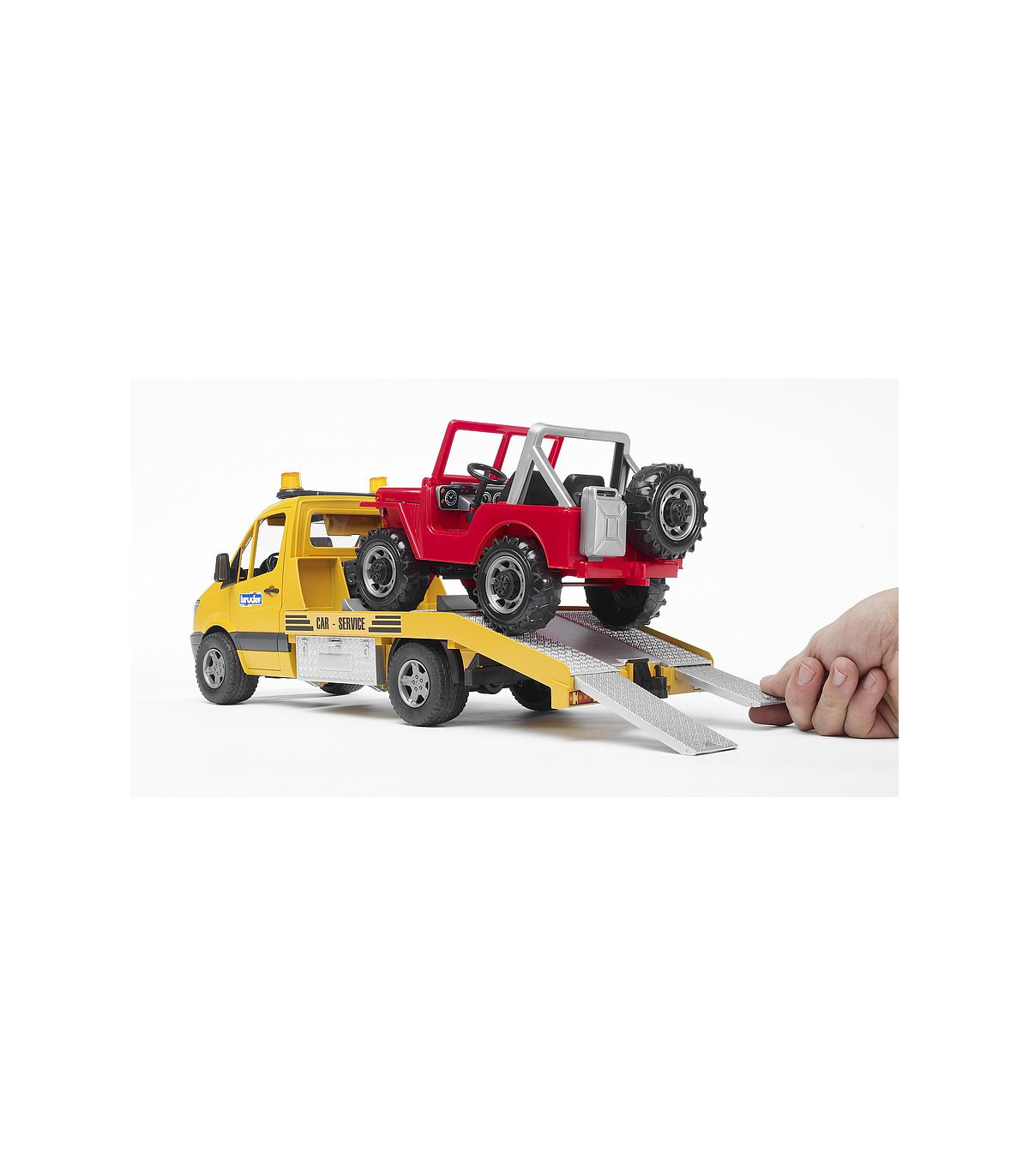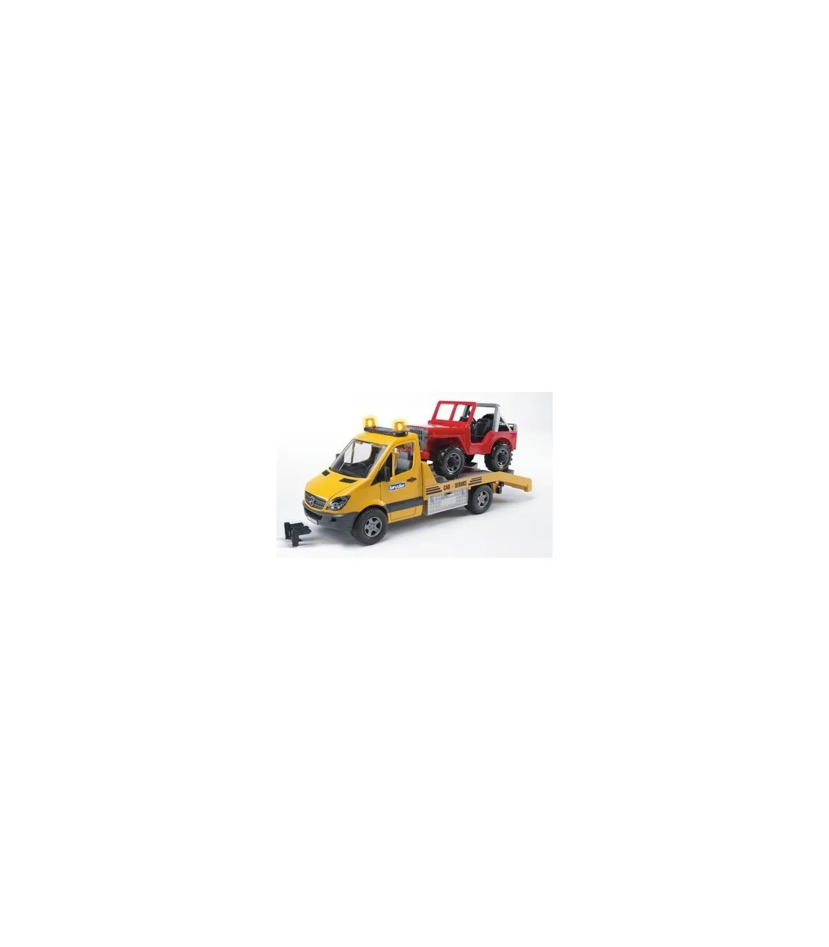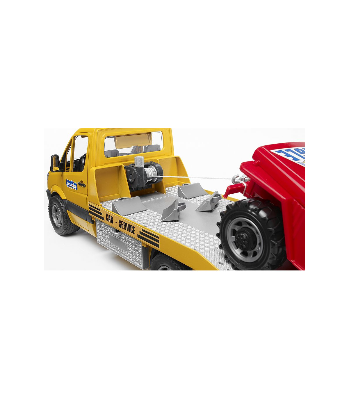 El elegante y moderno diseño del transportador de coches Mercedes Benz llama la atención a primera vista. Se siente al menos la misma fascinación al observar detenidamente el modelo de BRUDER. El transportador de coches tiene una plataforma que (como es habitual en BRUDER) imita en detalle a la original. Además de las puertas de alta calidad con revestimiento interior y el Light and Sound Module, llama especialmente la atención el torno de cable diseñado para este vehículo. Con este torno de cable es posible rescatar vehículos en caso de emergencia aunque se encuentren en una situación de lo más peligrosa. Las cajas de herramientas colocadas a los lados sirven para guardar los calces y también se pueden meter las rampas de acceso directamente en el chasis.