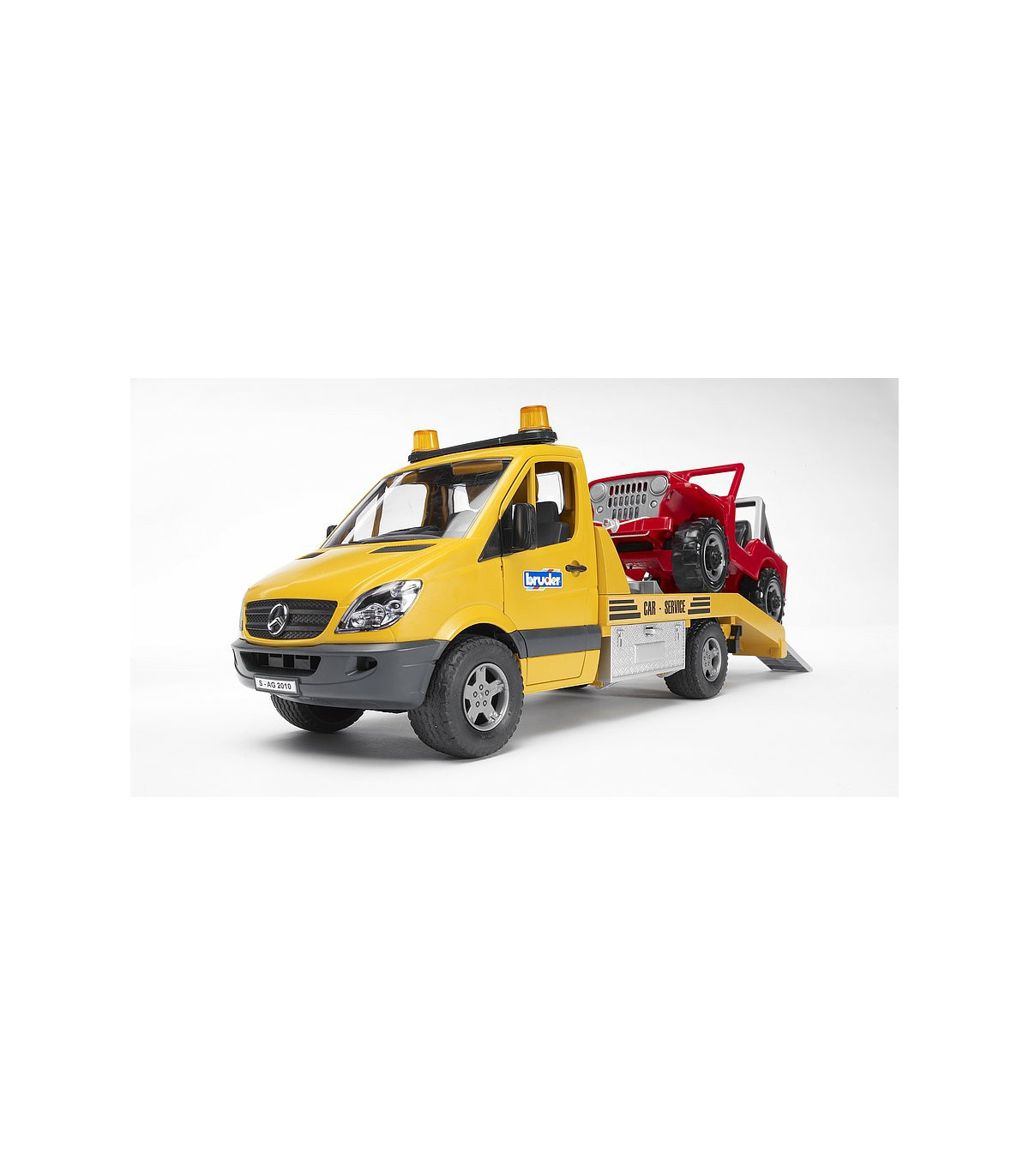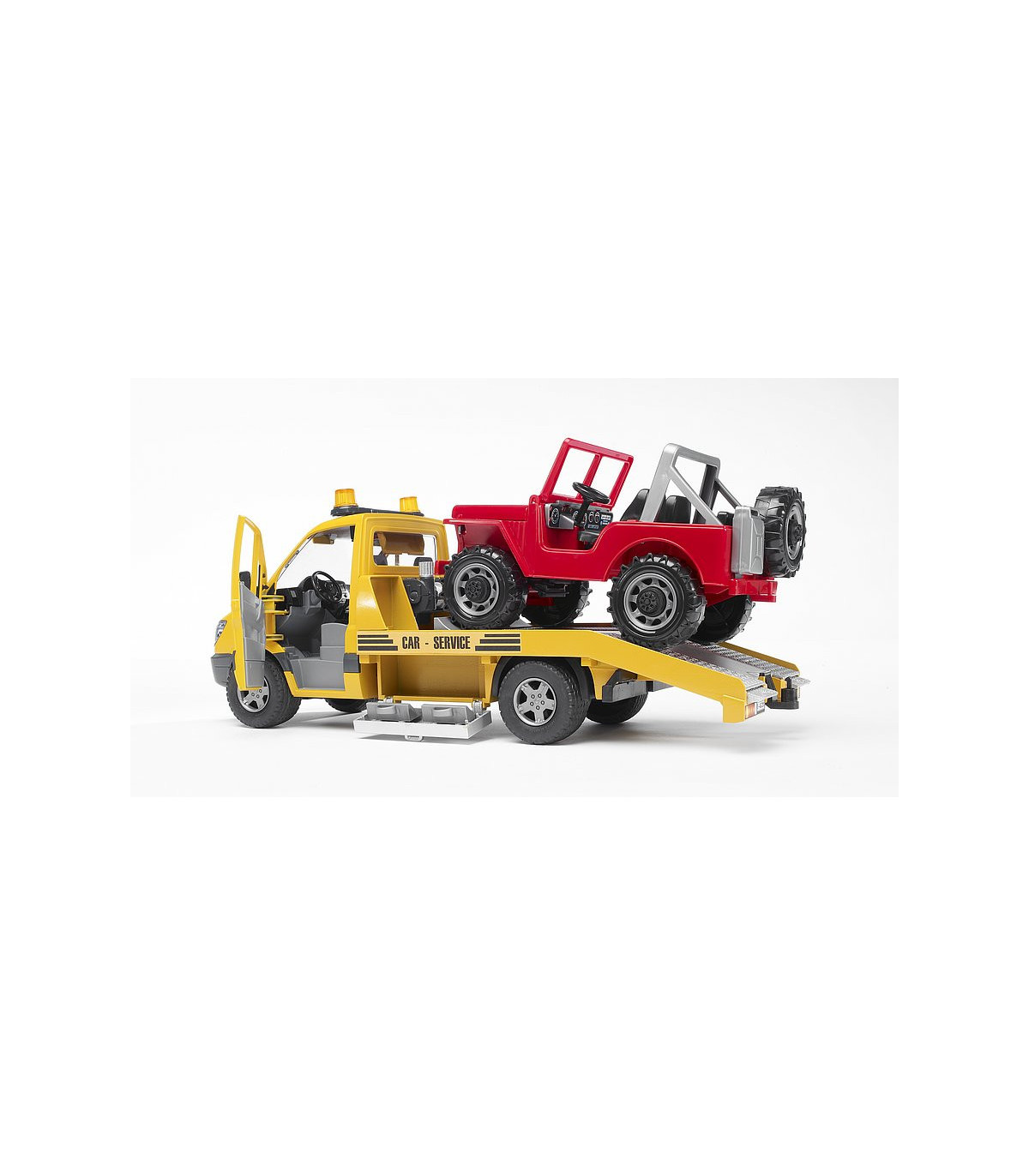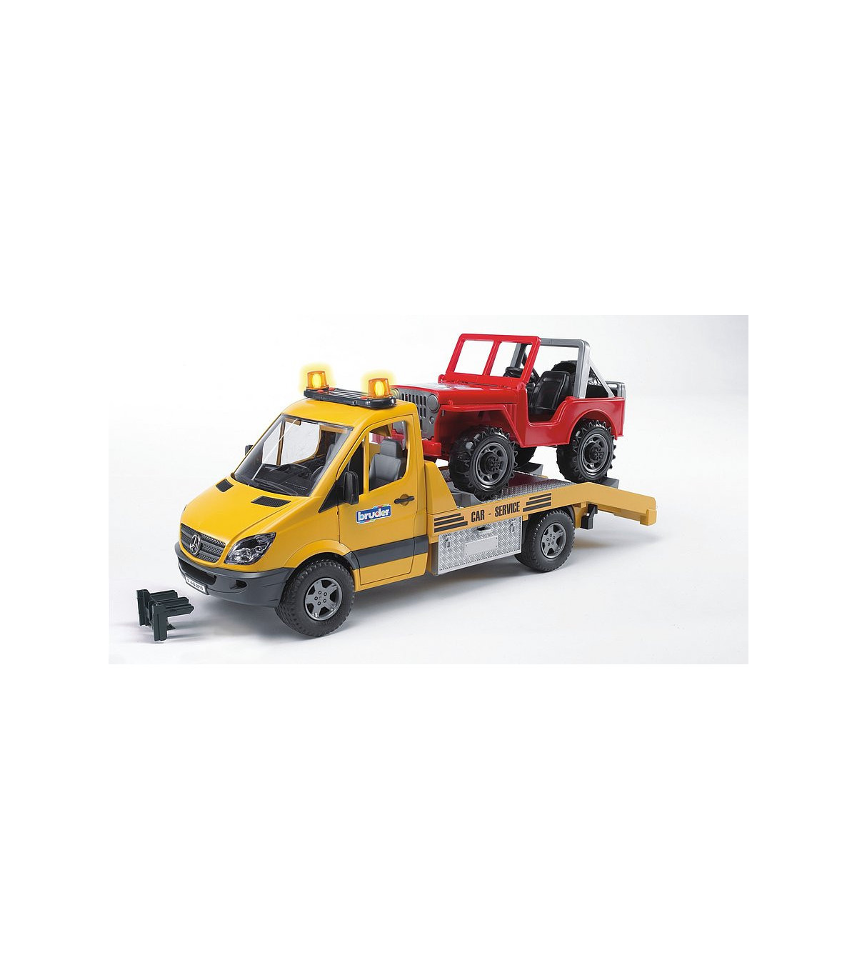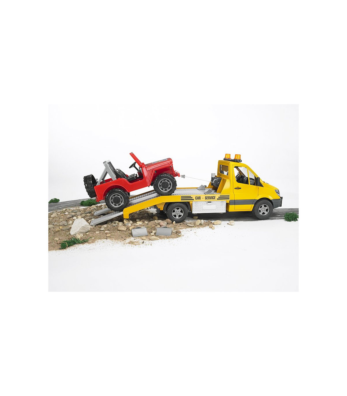 El elegante y moderno diseño del transportador de coches Mercedes Benz llama la atención a primera vista. Se siente al menos la misma fascinación al observar detenidamente el modelo de BRUDER. El transportador de coches tiene una plataforma que (como es habitual en BRUDER) imita en detalle a la original. Además de las puertas de alta calidad con revestimiento interior y el Light and Sound Module, llama especialmente la atención el torno de cable diseñado para este vehículo. Con este torno de cable es posible rescatar vehículos en caso de emergencia aunque se encuentren en una situación de lo más peligrosa. Las cajas de herramientas colocadas a los lados sirven para guardar los calces y también se pueden meter las rampas de acceso directamente en el chasis.