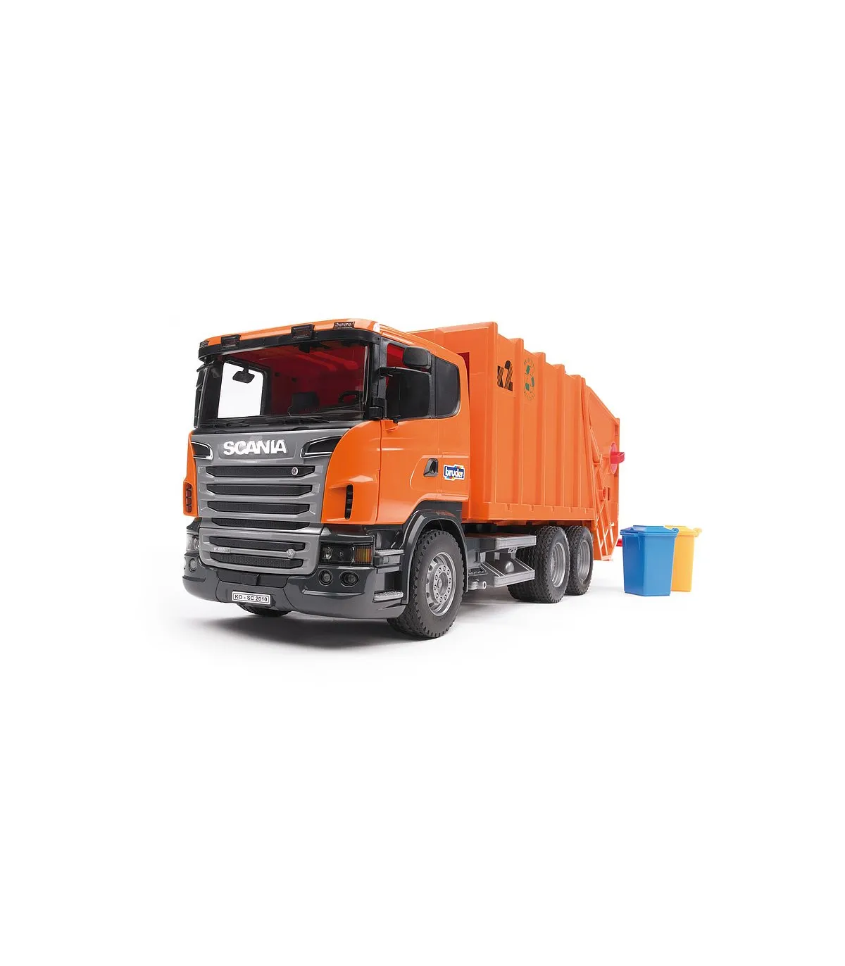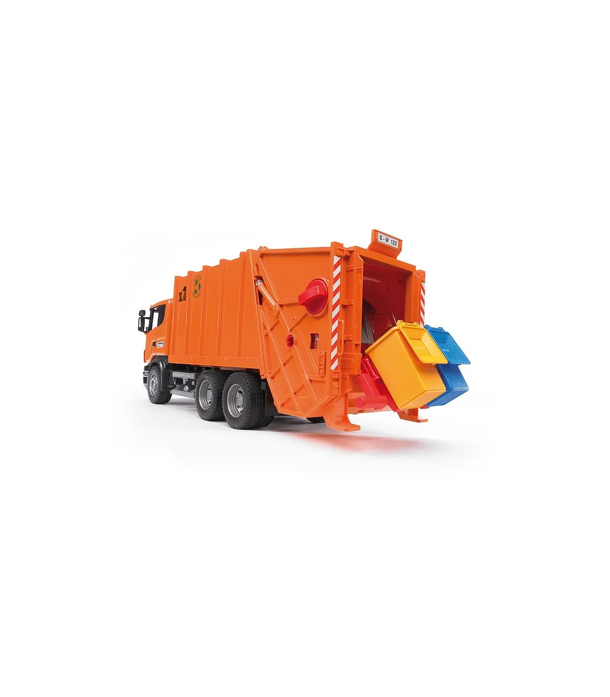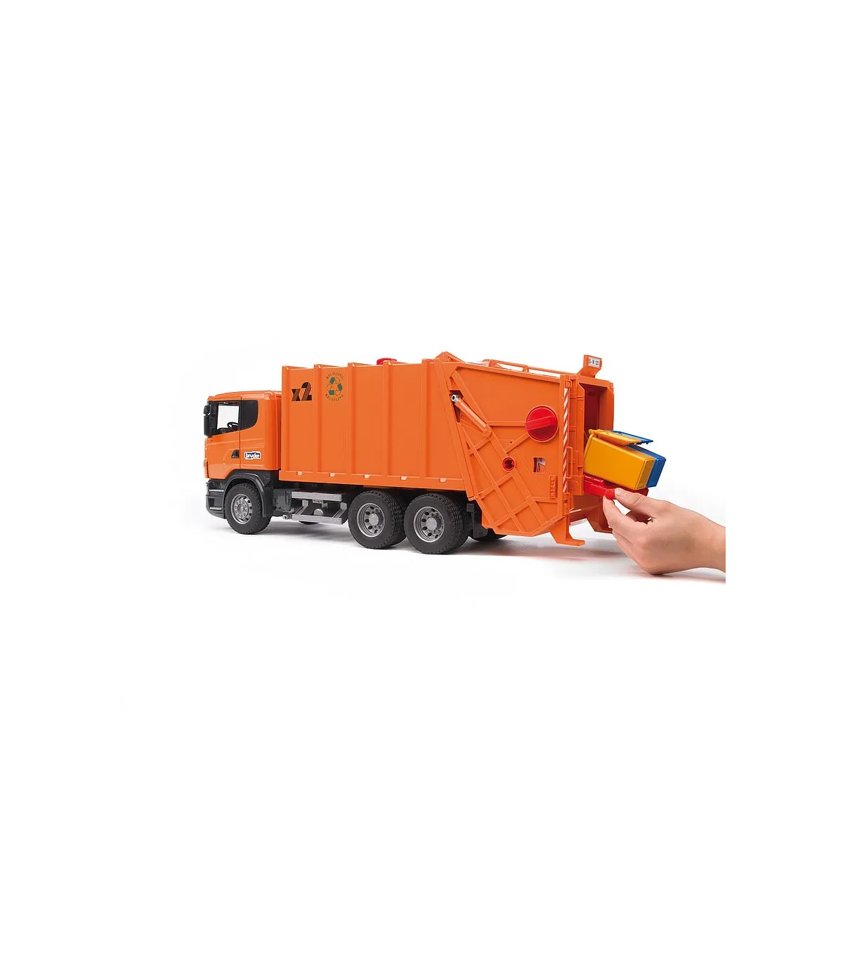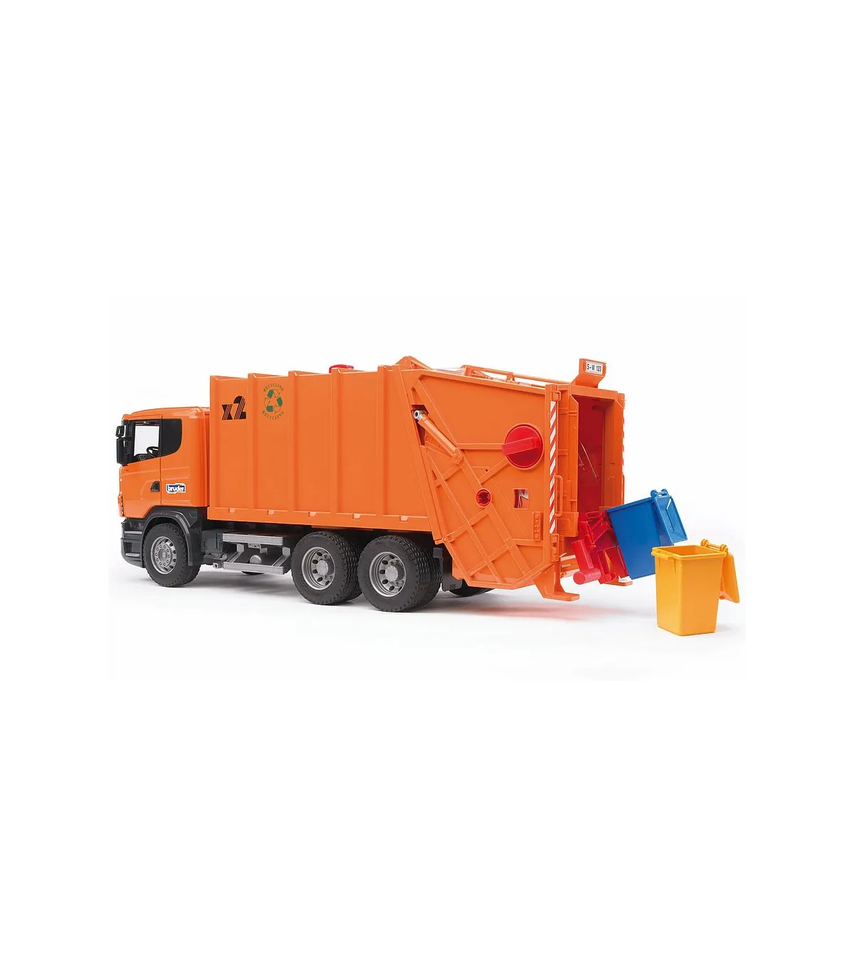 Máxima calidad en todos los detalles: este es el lema de la serie R de SCANIA. La funcionalidad, el acabado y el diseño de esta cabina hablan por sí solos. Así pues, no resulta nada sorprendente que este vehículo se haya convertido en la estrella de entre los camiones de la serie profesional de BRUDER. La cabina, fabricada siguiendo el original hasta en el último detalle, como es habitual, tiene un parabrisas de policarbonato resistente a las roturas y ofrece la posibilidad de incorporar el módulo de luz y sonido disponible para muchos artículos (nº de ref. 02801). Los retrovisores del camión SCANIA se pueden plegar y las puertas se pueden abrir. El proceso completo de carga y descarga del camión de la basura se controla a través de un sistema mecánico único de rueda giratoria, que permite el vaciado simultáneo de dos cubos de basura. La consola de soporte flexible posibilita el mismo proceso para el contenedor de basura. El procedimiento: los cubos de basura son empujados hasta quedar colocados sobre la consola de soporte, y al levantarlos, la basura se vacía en la caja. Mientras la rueda gira, la basura se introduce en la prensa mecánica funcional, donde se comprime y por último, se transporta hasta el depósito de basura. Este proceso se representa a través de una ventanilla de inspección. Para descargar la basura, se utiliza el asa situada en la parte superior del depósito de basura. Girando este mango, la basura es desplazada hacia atrás mediante unas correderas de descarga, pasa por delante de la unidad de carga y descarga elevada y es transportada hacia fuera. Dos pequeños contenedores de basura y ruedas perfiladas completan la imagen. El camión de la basura de SCANIA puede equiparse con el set de contenedores de basura (3 pequeños, 1 grande), nº de ref. 02606 (no incluidos).