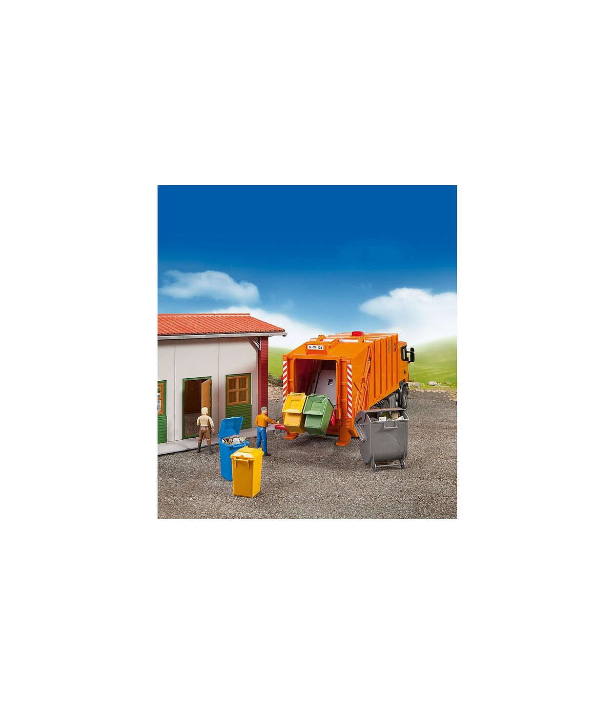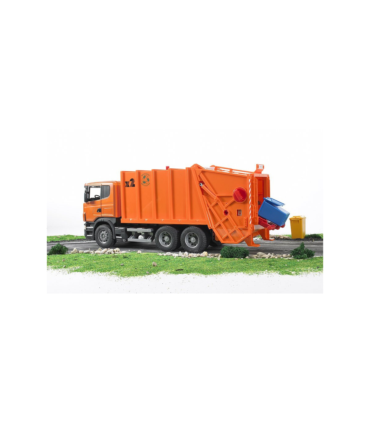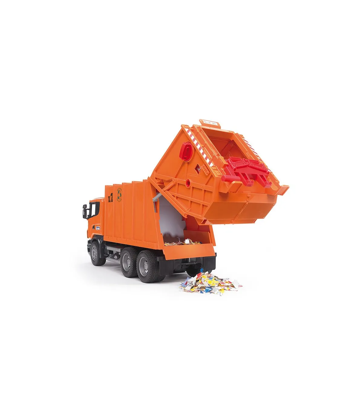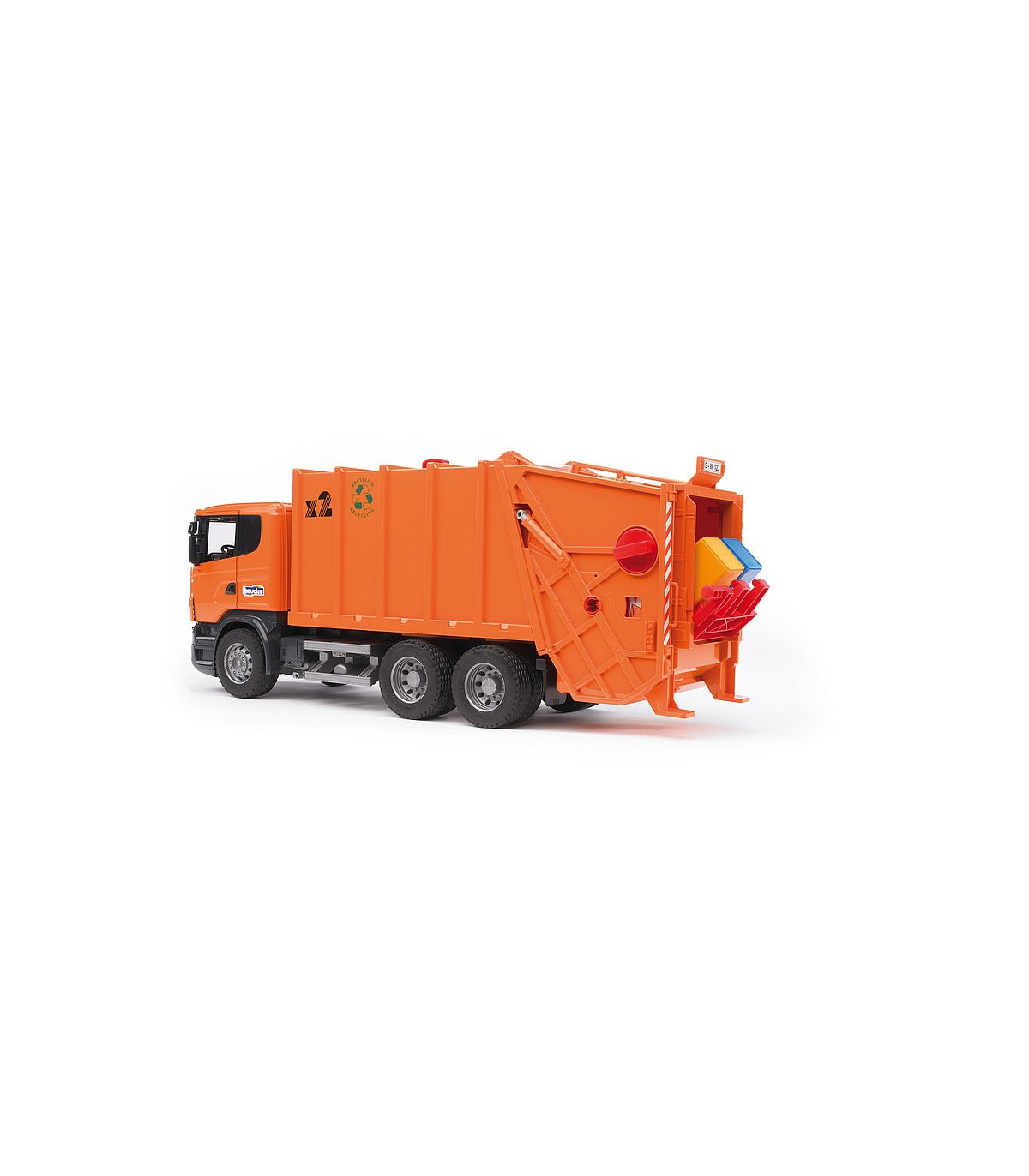 Máxima calidad en todos los detalles: este es el lema de la serie R de SCANIA. La funcionalidad, el acabado y el diseño de esta cabina hablan por sí solos. Así pues, no resulta nada sorprendente que este vehículo se haya convertido en la estrella de entre los camiones de la serie profesional de BRUDER. La cabina, fabricada siguiendo el original hasta en el último detalle, como es habitual, tiene un parabrisas de policarbonato resistente a las roturas y ofrece la posibilidad de incorporar el módulo de luz y sonido disponible para muchos artículos (nº de ref. 02801). Los retrovisores del camión SCANIA se pueden plegar y las puertas se pueden abrir. El proceso completo de carga y descarga del camión de la basura se controla a través de un sistema mecánico único de rueda giratoria, que permite el vaciado simultáneo de dos cubos de basura. La consola de soporte flexible posibilita el mismo proceso para el contenedor de basura. El procedimiento: los cubos de basura son empujados hasta quedar colocados sobre la consola de soporte, y al levantarlos, la basura se vacía en la caja. Mientras la rueda gira, la basura se introduce en la prensa mecánica funcional, donde se comprime y por último, se transporta hasta el depósito de basura. Este proceso se representa a través de una ventanilla de inspección. Para descargar la basura, se utiliza el asa situada en la parte superior del depósito de basura. Girando este mango, la basura es desplazada hacia atrás mediante unas correderas de descarga, pasa por delante de la unidad de carga y descarga elevada y es transportada hacia fuera. Dos pequeños contenedores de basura y ruedas perfiladas completan la imagen. El camión de la basura de SCANIA puede equiparse con el set de contenedores de basura (3 pequeños, 1 grande), nº de ref. 02606 (no incluidos).