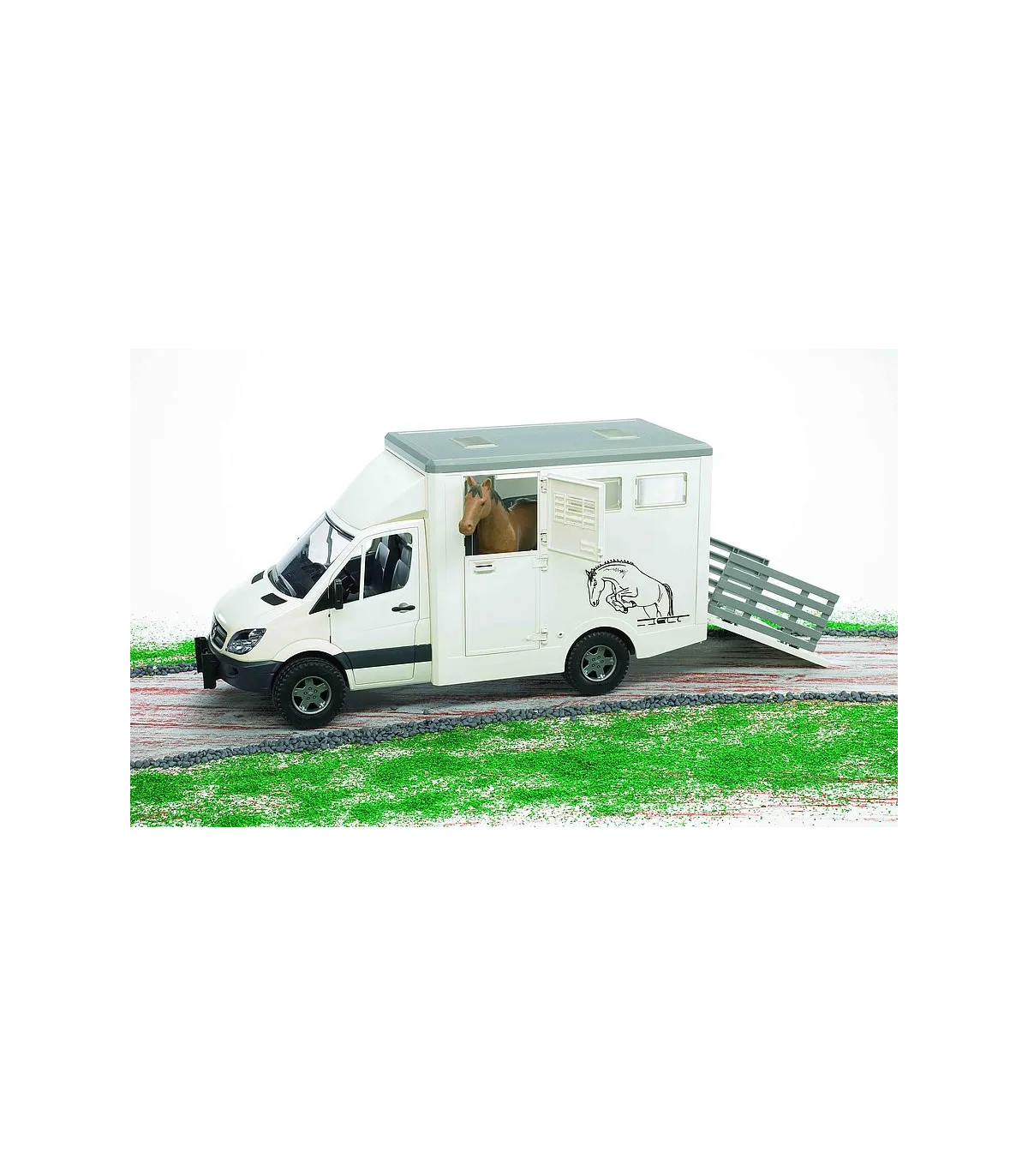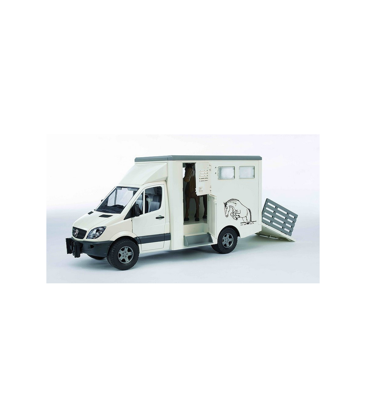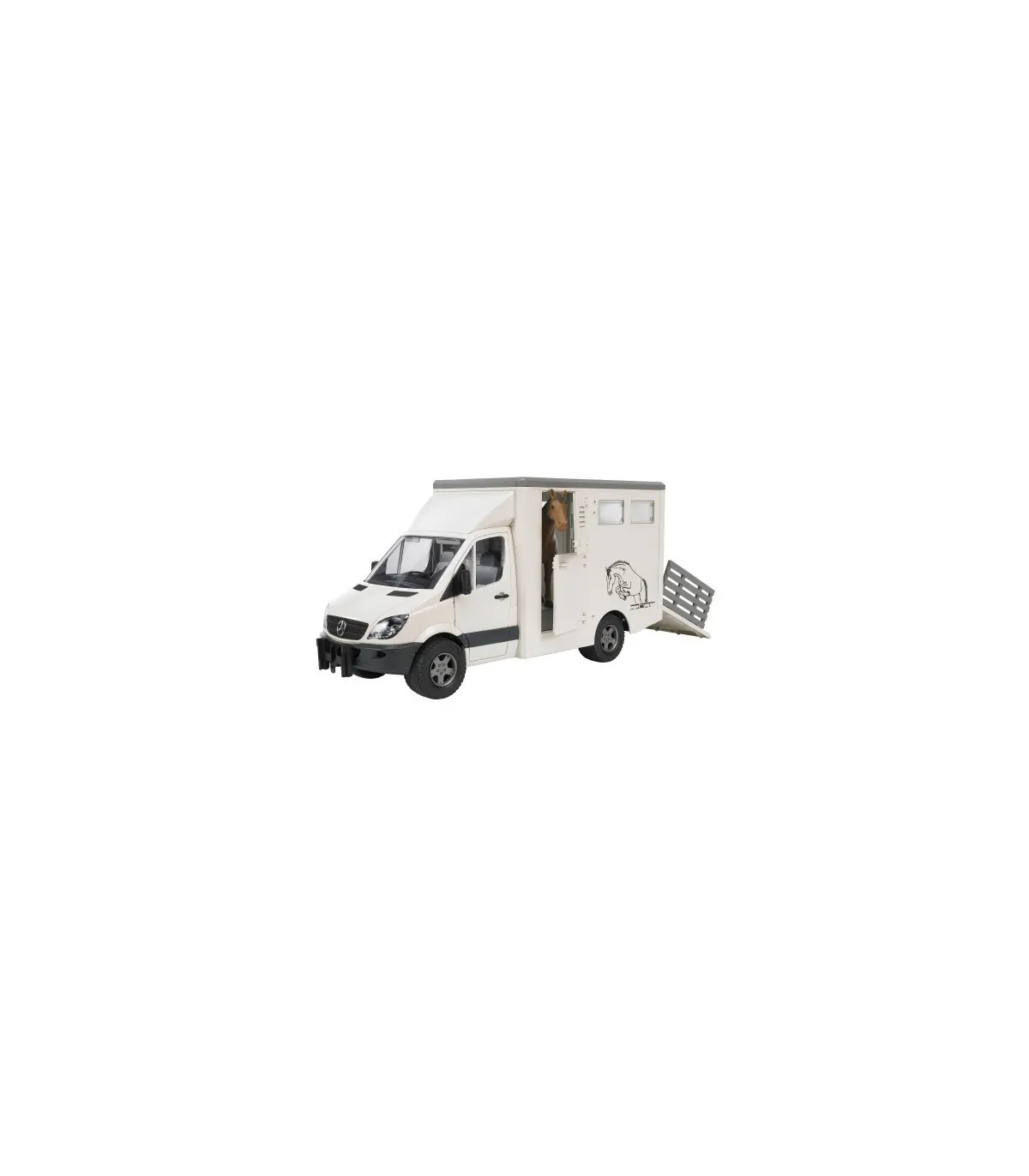 El Mercedes Benz Sprinter sigue siendo uno de los modelos más exitosos en la categoría de furgonetas. Las posibilidades de aplicación universales en combinación con las estructuras más diversas lo hacen imprescindible para el gremio artesanal, en la industria de la construcción, en municipios, en arquitectura paisajística y horticultura, como vehículos de sustitución de la policía, los bomberos y otros servicios de salvamento. El vehículo para el transporte de animales dispone de una estructura de maletero moderna y adecuada con pared de separación interior y dos abrevaderos de agua. Para subir y bajar los caballos se puede abatir la rampa, la rejilla de la rampa sirve para que los animales sean dirigidos hacia el vehículo o fuera del mismo con cuidado. Se incluye un caballo a escala, se pueden adquirir más bajo el número de artículo 02306. En este vehículo se pueden transportar un máximo de dos caballos. El remolque de caballos (nº de art. 02028) se adapta de forma ideal a esta furgoneta.