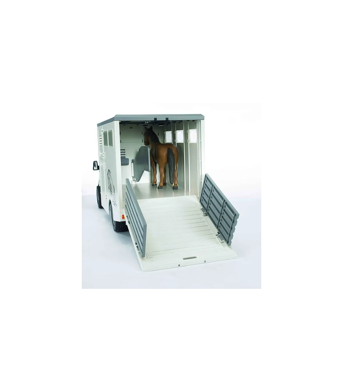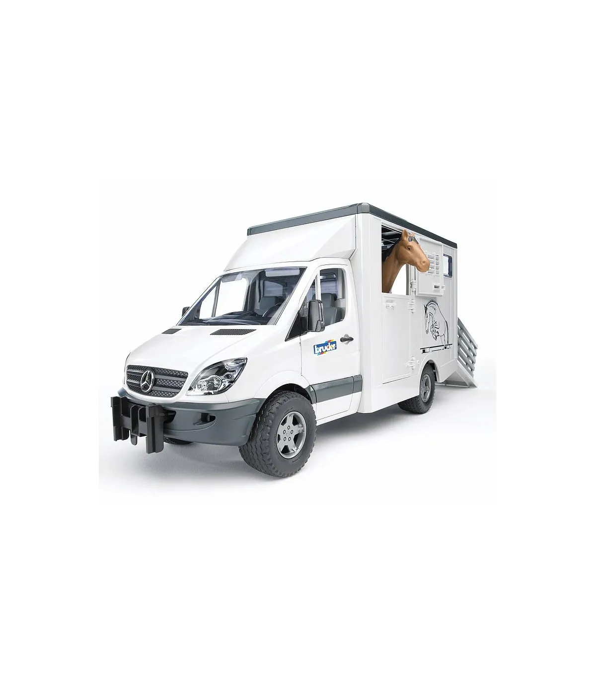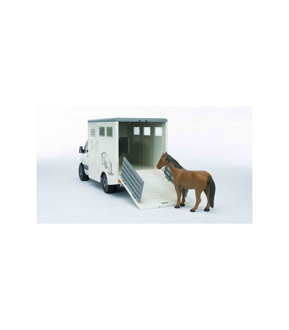El Mercedes Benz Sprinter sigue siendo uno de los modelos más exitosos en la categoría de furgonetas. Las posibilidades de aplicación universales en combinación con las estructuras más diversas lo hacen imprescindible para el gremio artesanal, en la industria de la construcción, en municipios, en arquitectura paisajística y horticultura, como vehículos de sustitución de la policía, los bomberos y otros servicios de salvamento. El vehículo para el transporte de animales dispone de una estructura de maletero moderna y adecuada con pared de separación interior y dos abrevaderos de agua. Para subir y bajar los caballos se puede abatir la rampa, la rejilla de la rampa sirve para que los animales sean dirigidos hacia el vehículo o fuera del mismo con cuidado. Se incluye un caballo a escala, se pueden adquirir más bajo el número de artículo 02306. En este vehículo se pueden transportar un máximo de dos caballos. El remolque de caballos (nº de art. 02028) se adapta de forma ideal a esta furgoneta.