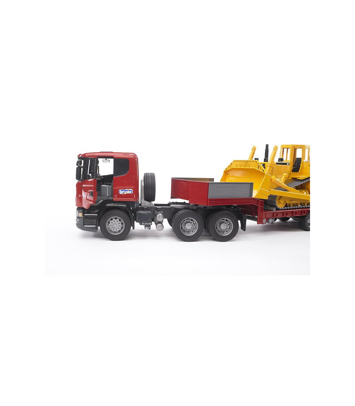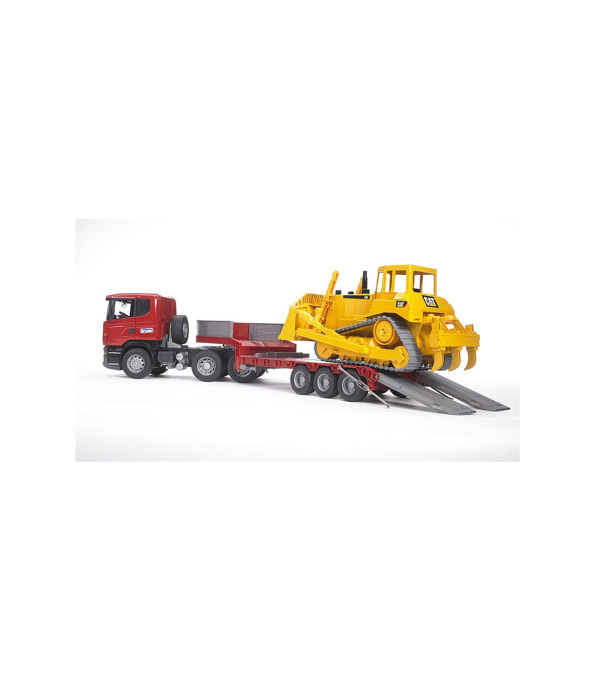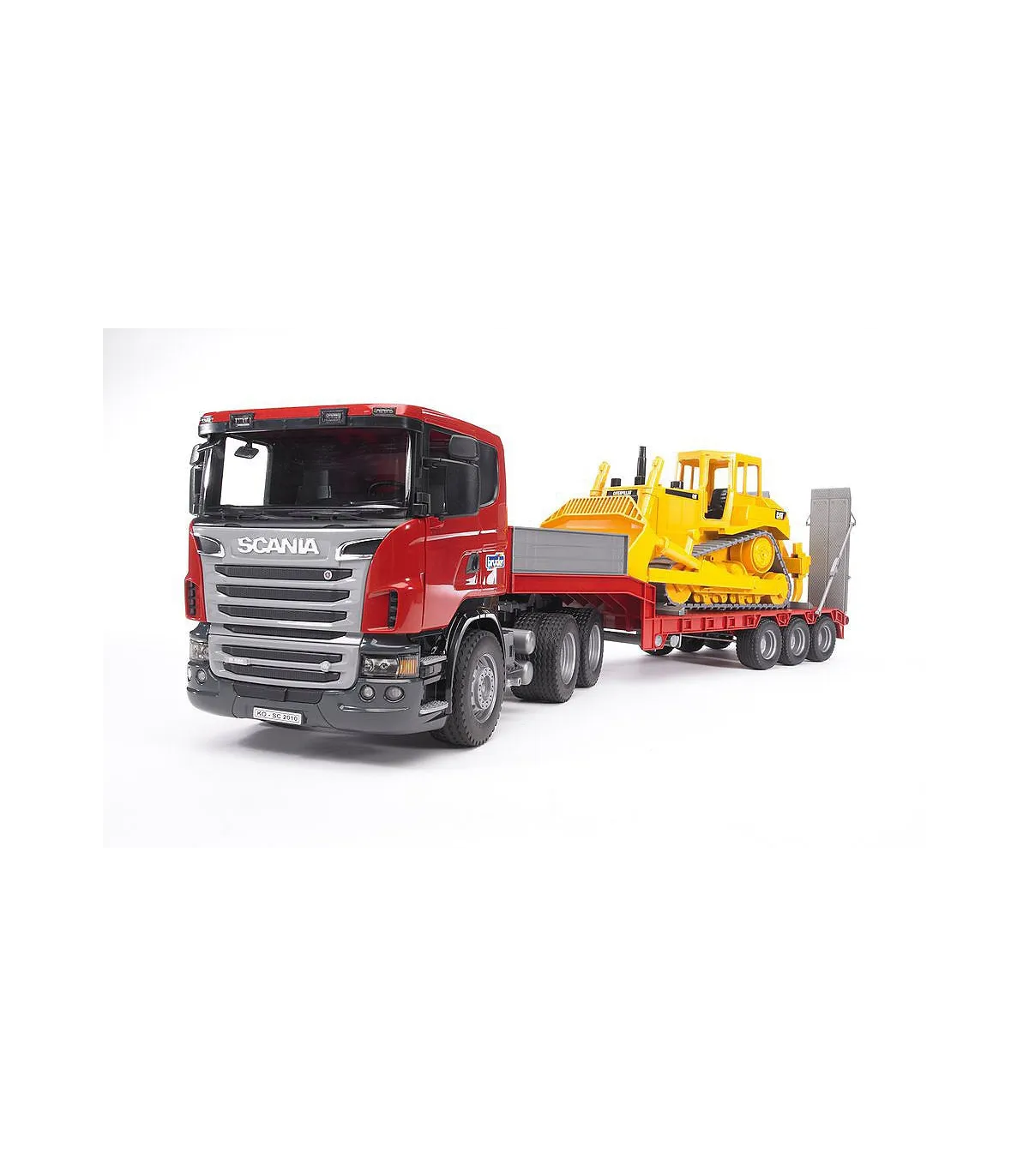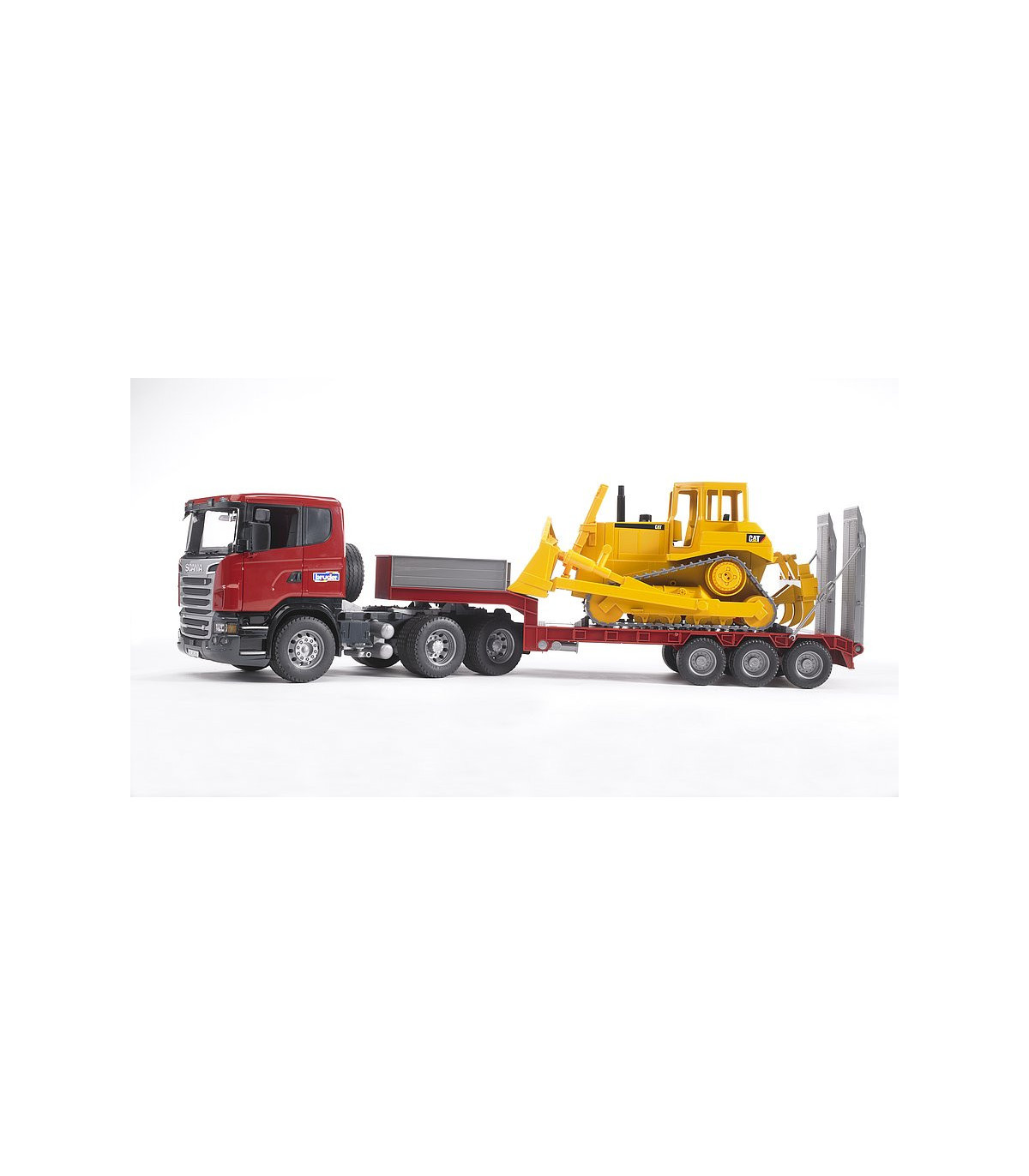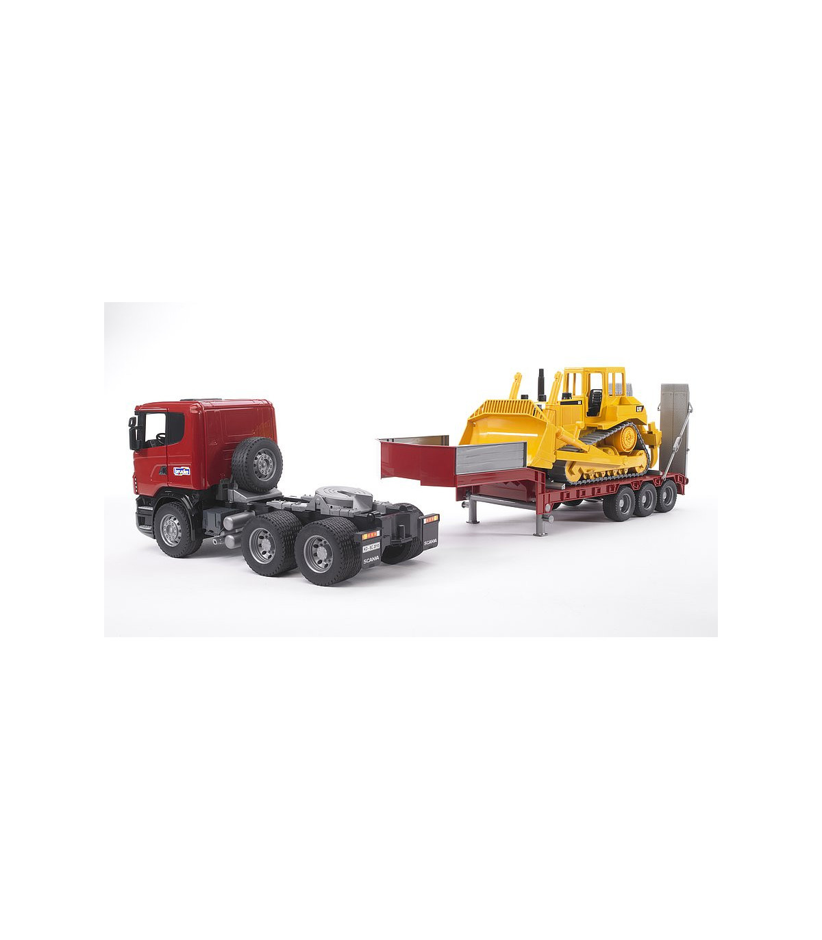 Premium hasta en los detalles: ése es el lema de la serie R de SCANIA. La funcionalidad, el acabado y el diseño de la cabina del conductor hablan por sí mismos. Tampoco es ninguna sorpresa que este vehículo sea la estrella de los camiones de la serie Profi de BRUDER. La reproducción de la cabina del conductor es muy detallada como de costumbre y tiene un parabrisas de policarbonato resistente, además ofrece la posibilidad de utilizar el módulo Light and Sound (nº de art.: 02801) disponible para muchos artículos. Los espejos de los camiones SCANIA se pueden abatir y las puertas se pueden abrir. El semirremolque del camión de plataforma baja tiene un acoplamiento por traviesa giratoria completamente funcional y los pies de apoyo abatibles ofrecen una fijación segura. Las rampas de acceso se pueden abatir y el bloqueo del vehículo para asegurarlo durante la carga se puede regular. La pala niveladora del Bulldozer CATERPILLAR se puede tanto ajustar en altura y asentar, como abatir y bloquear. Ademas, la escarificadora se puede asentar. Las orugas sirven para que el Bulldozer CATERPILLAR se mueva más fácilmente.
