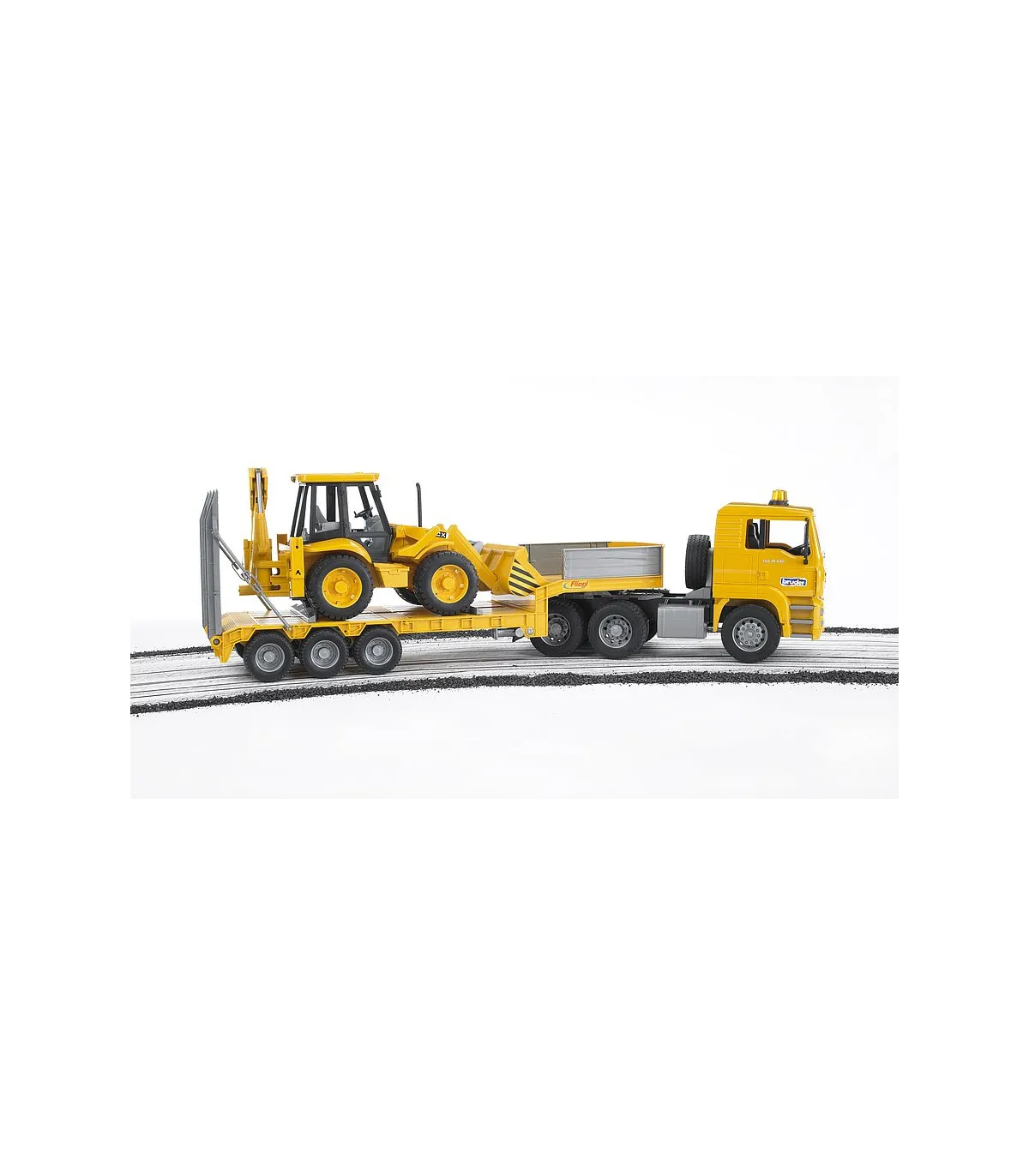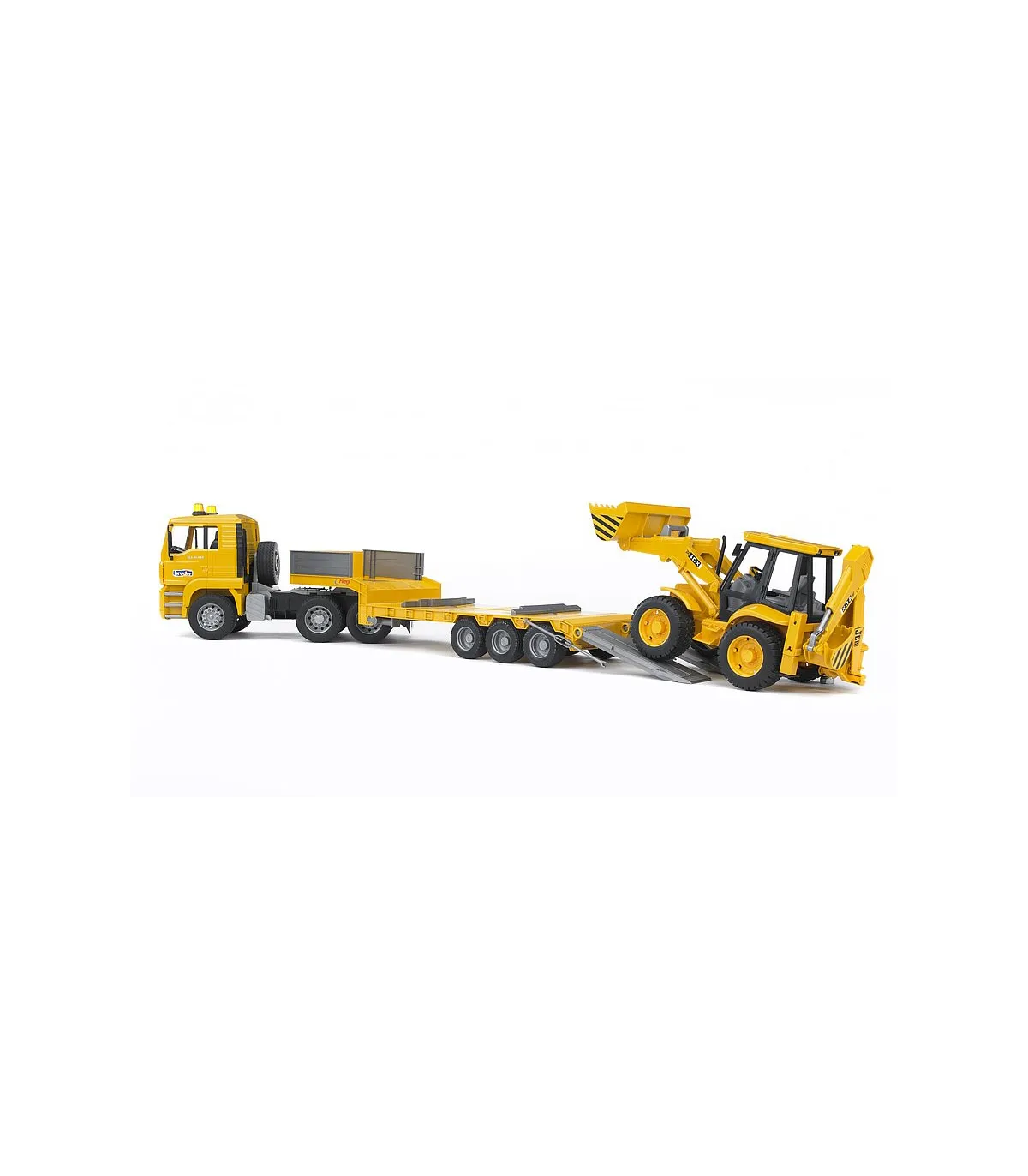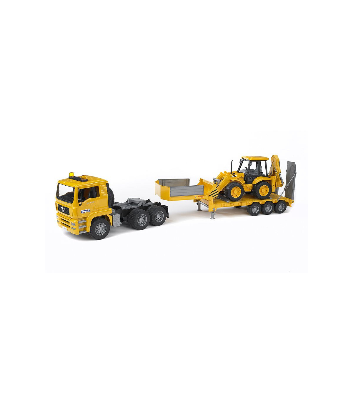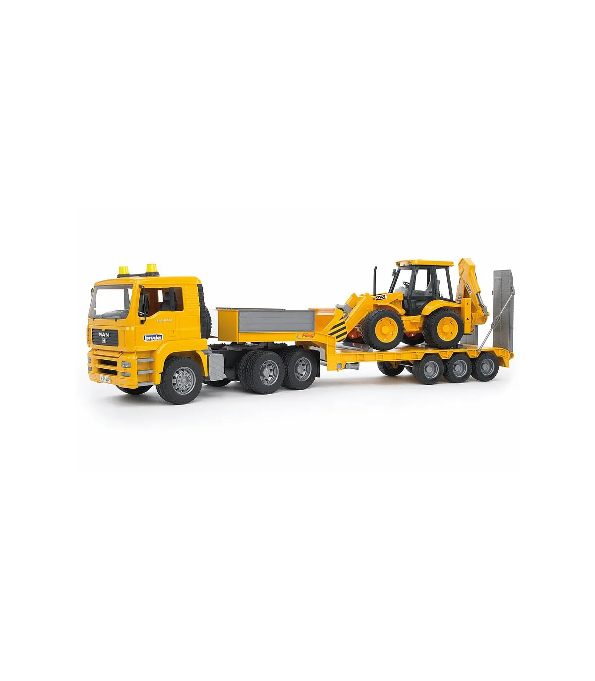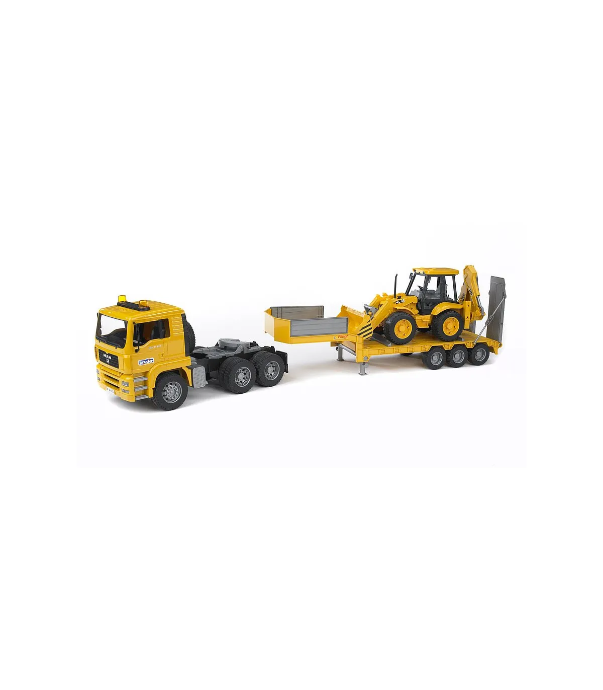 Las góndolas de carga rebajada se utilizan a menudo para resolver tareas de transporte difíciles, como el transporte de grandes máquinas de construcción de un sitio de construcción a otro. Como otro vehículo de esta serie de modelos, BRUDER trae la góndola rebajada MAN TGA cargada con una retroexcavadora 4CX del fabricante inglés JCB. Este imponente vehículo tiene las conocidas propiedades de la góndola de cama rebajada MAN, como el acoplamiento giratorio del remolque completamente funcional, los soportes plegables y las rampas de acceso. La retroexcavadora JCB 4CX se puede utilizar para trabajos delanteros y traseros y el asiento del conductor se puede girar 360 grados para este propósito.
