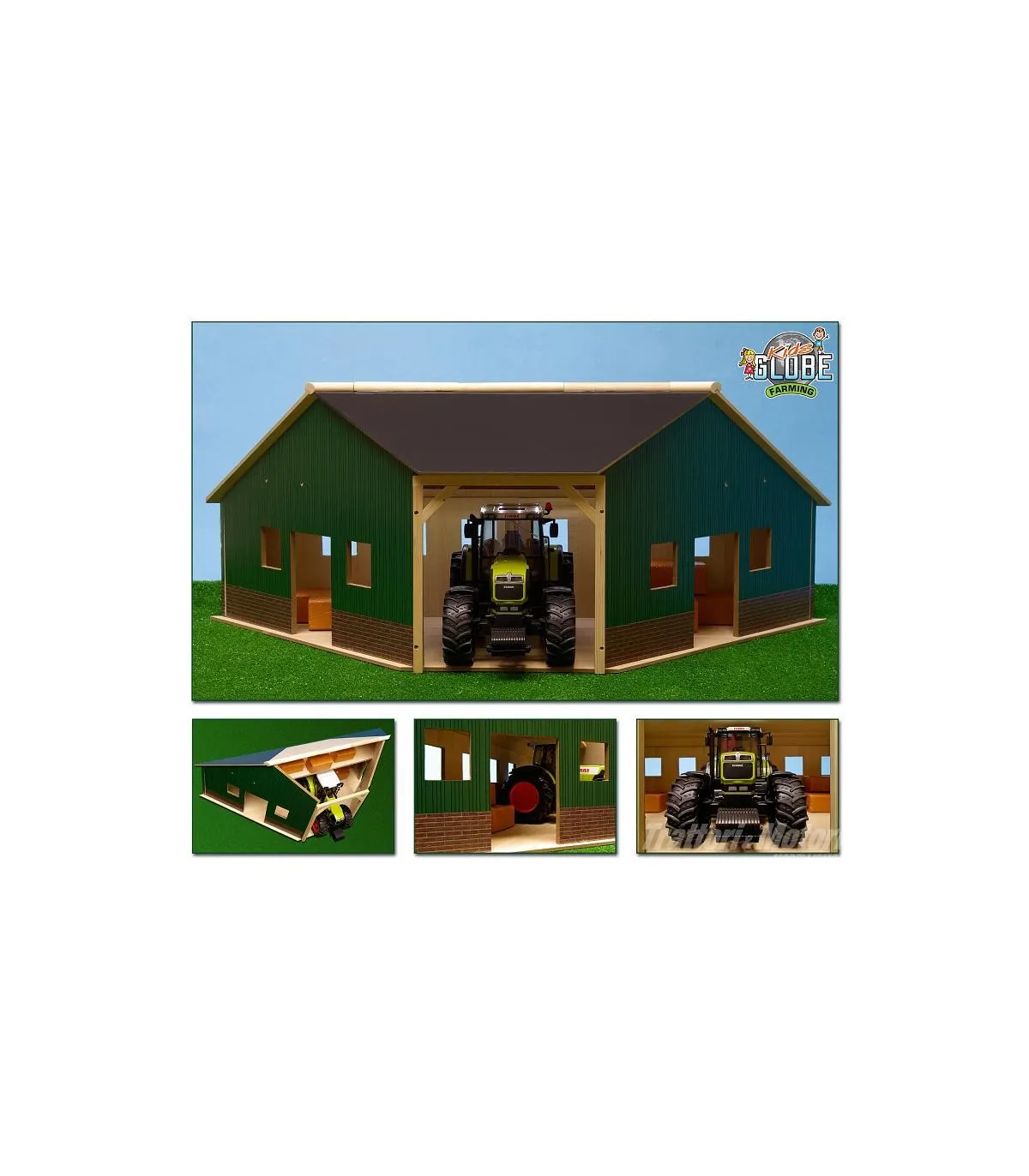 Este cobertizo esquinero tiene capacidad para un vehículo a escala 1:16, como un tractor Bruder. Se pueden guardar objetos pequeños a ambos lados. Este cobertizo también combina a la perfección con los cobertizos para tractores, que pueden acomodar dos o tres vehículos, creando un cobertizo amplio y hermoso, perfecto para un rincón de la habitación infantil.