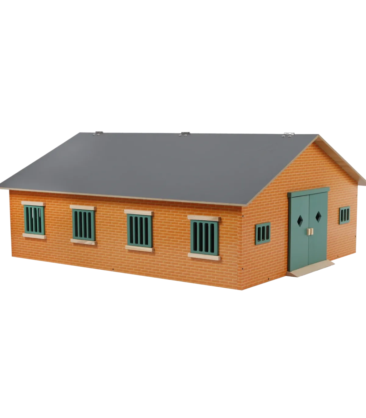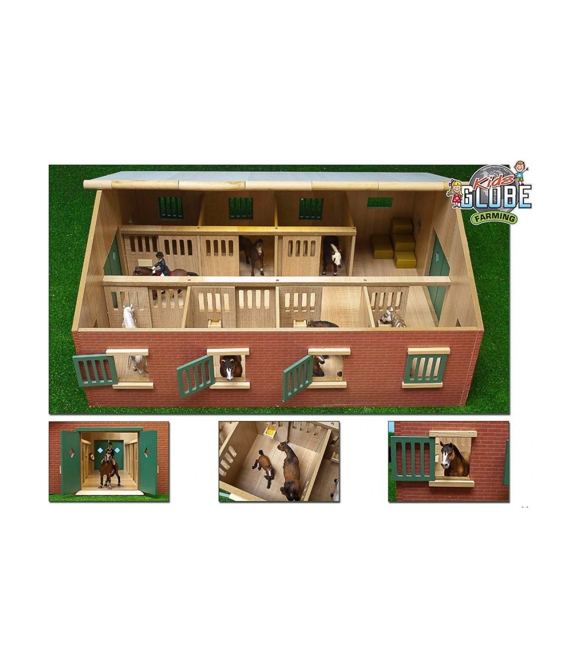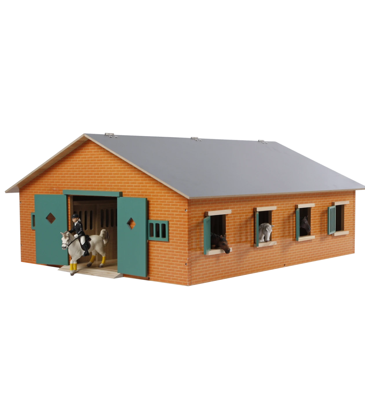 Este establo tiene una escala 1:24, lo que lo hace especialmente adecuado para caballos Schleich. Su diseño de madera y acabado en piedra crean un modelo más rústico. Las puertas y contraventanas son de color verde oscuro, lo que realza el ambiente rústico.
