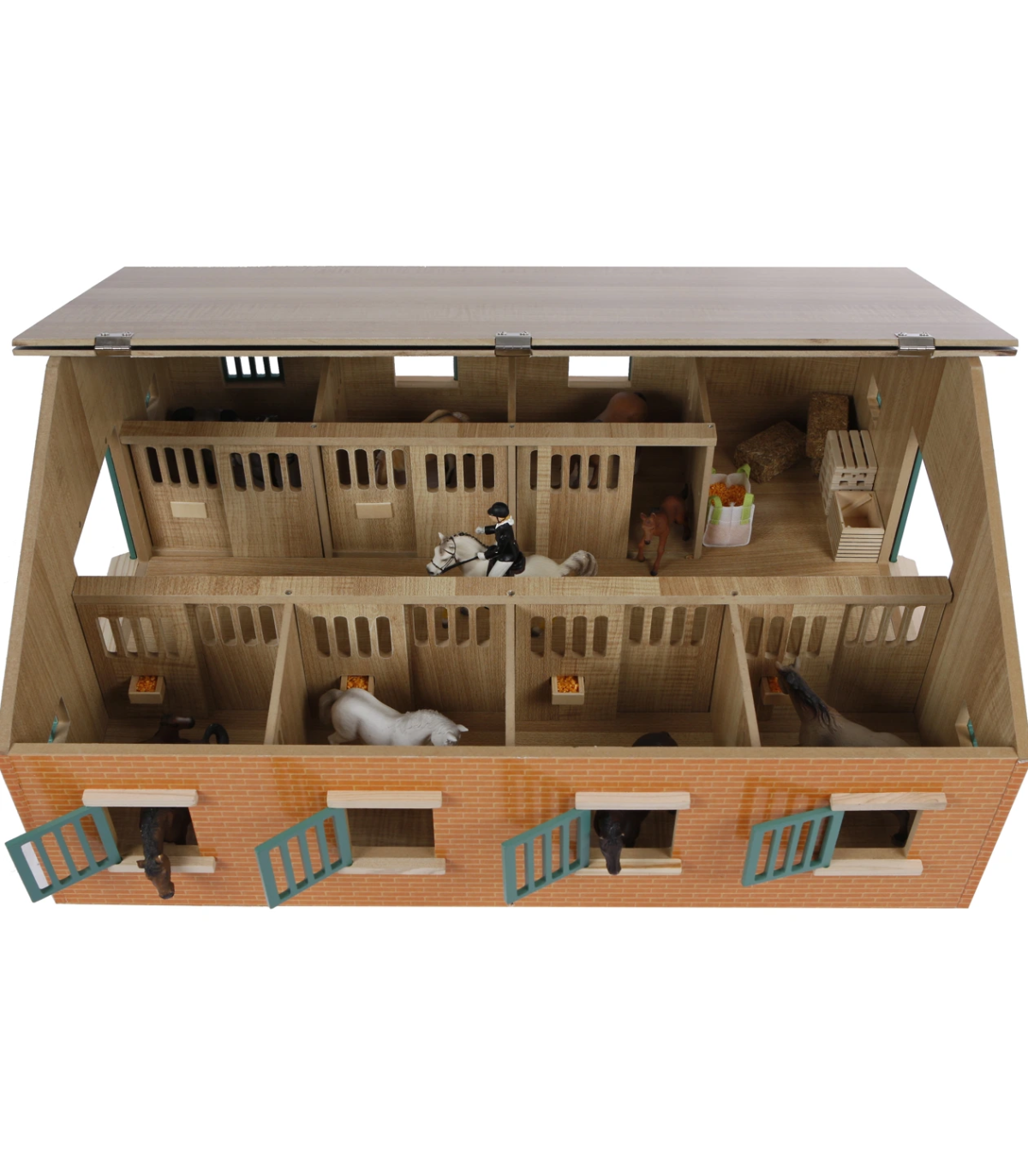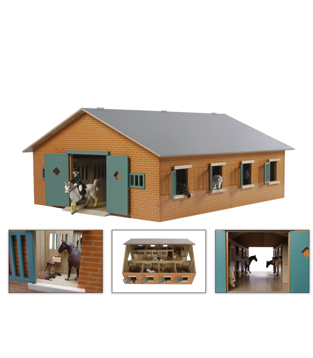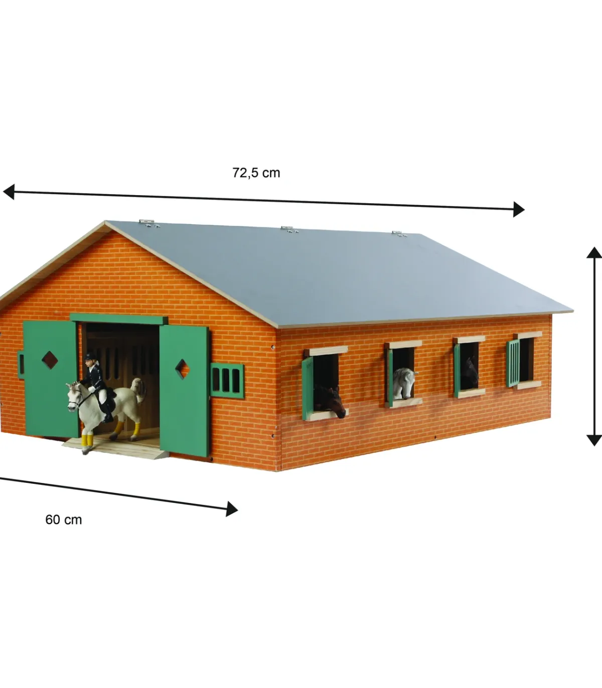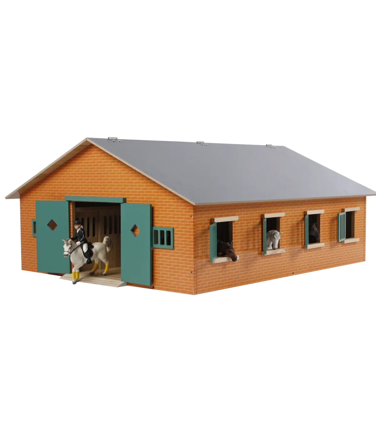 Este establo tiene una escala 1:24, lo que lo hace especialmente adecuado para caballos Schleich. Su diseño de madera y acabado en piedra crean un modelo más rústico. Las puertas y contraventanas son de color verde oscuro, lo que realza el ambiente rústico.