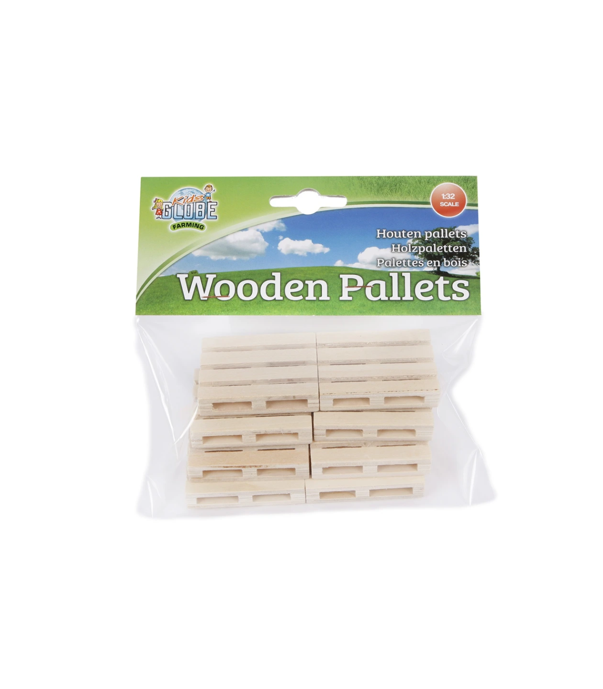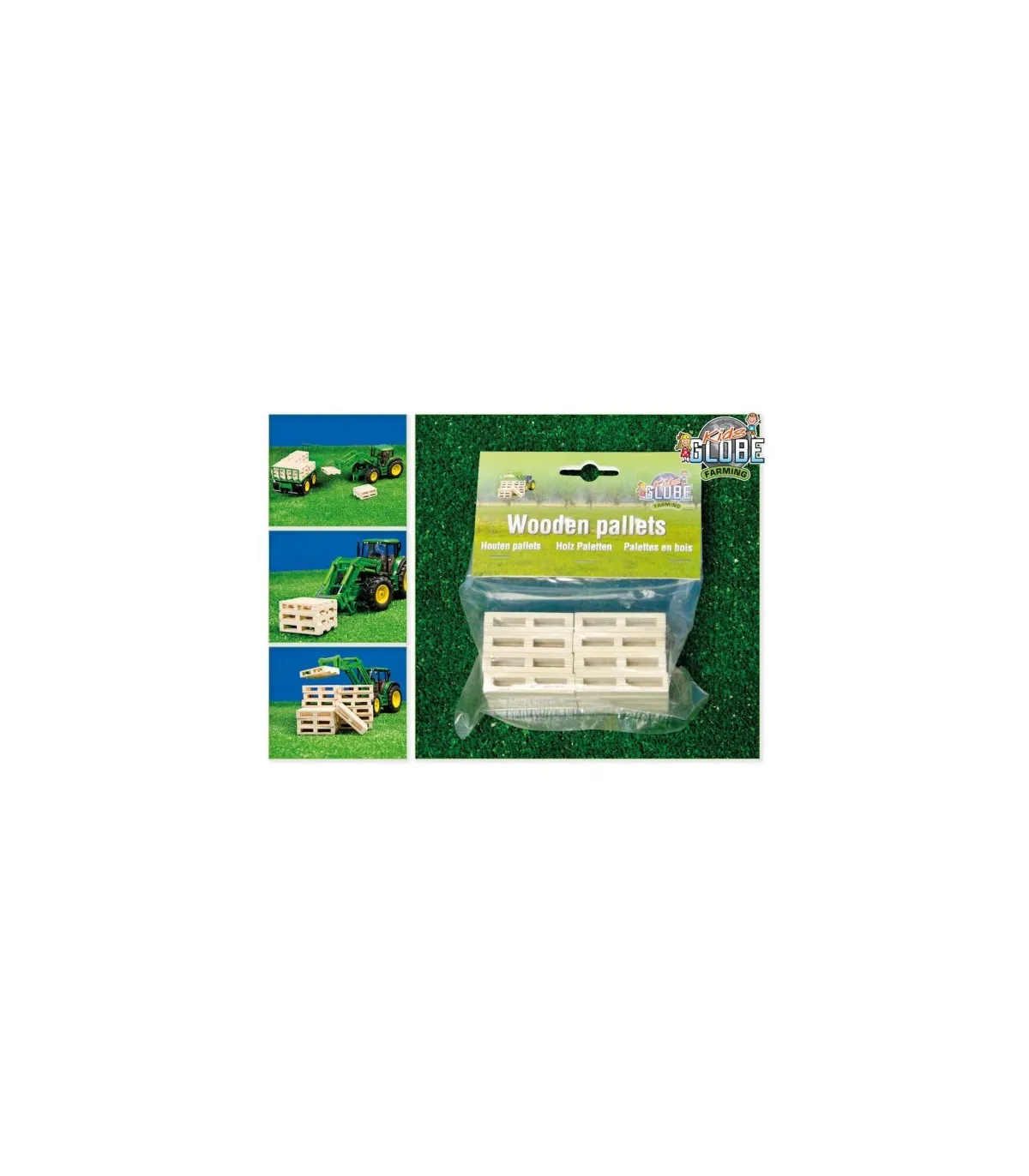 Para transportar las pacas de heno con el tractor lo más fácilmente posible, conviene colocarlas sobre palés. Estos se pueden apilar y transportar cómodamente al granero con el portapalets acoplado al tractor. Un divertido complemento para el juego imaginativo. Se puede transportar todo tipo de cosas con los palés. Los palés son de madera y tienen una escala 1:32, lo que los convierte en la combinación perfecta para los vehículos Siku y los establos/cobertizos de Kids Globe Farming.