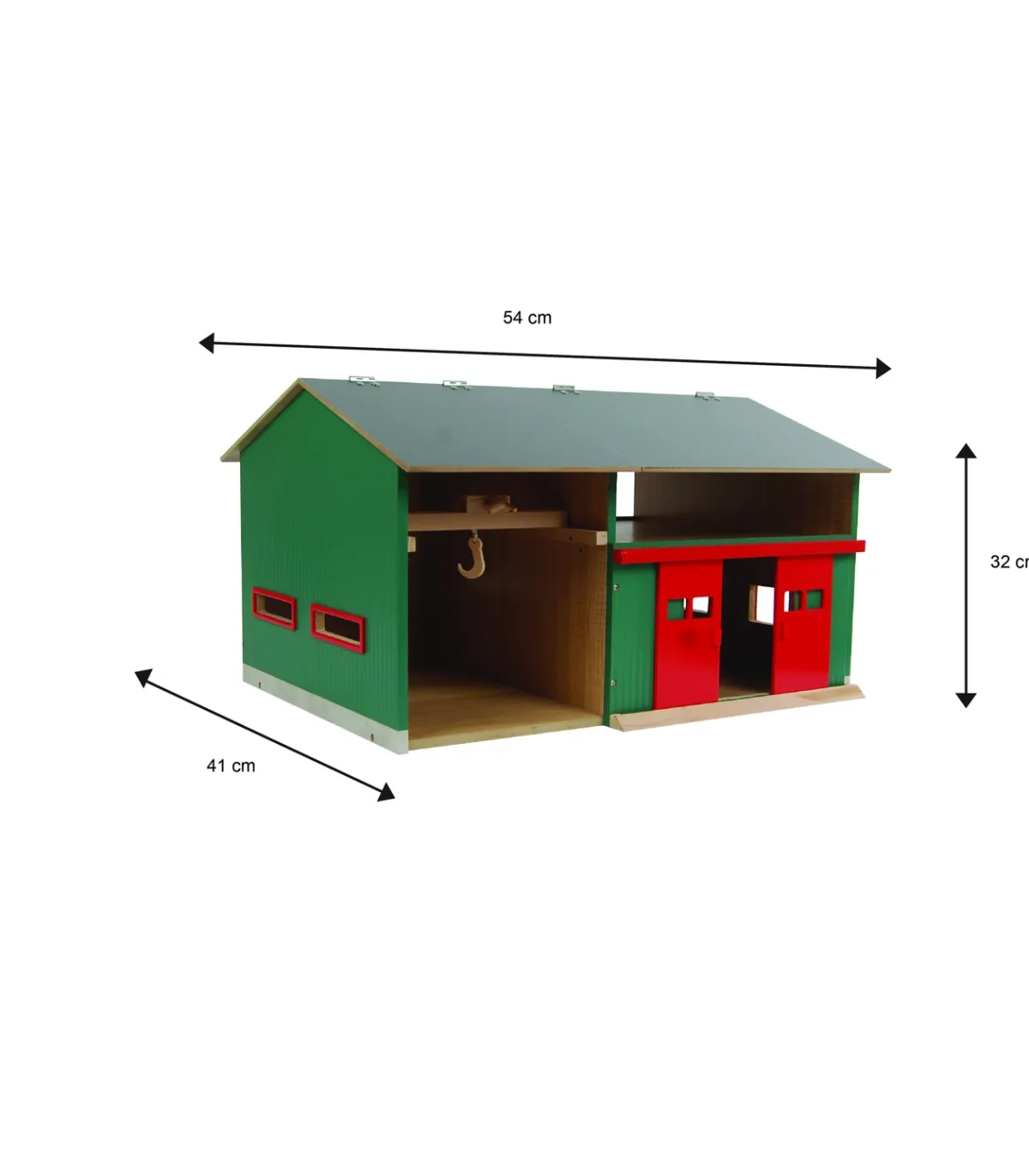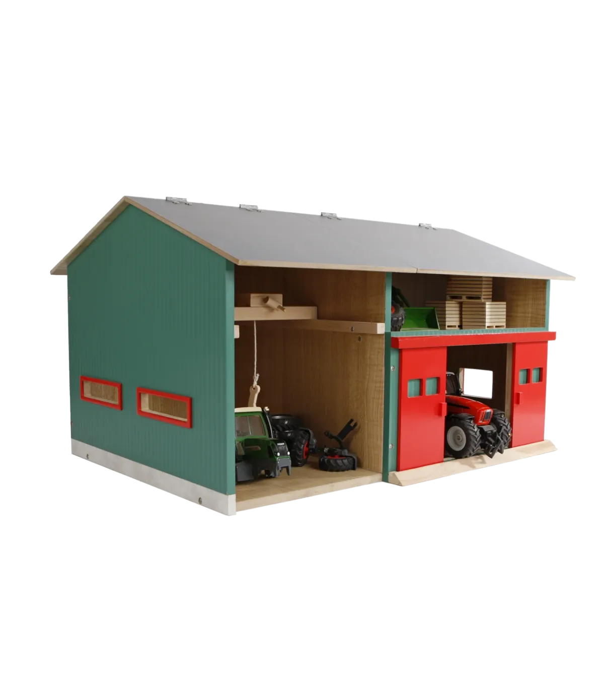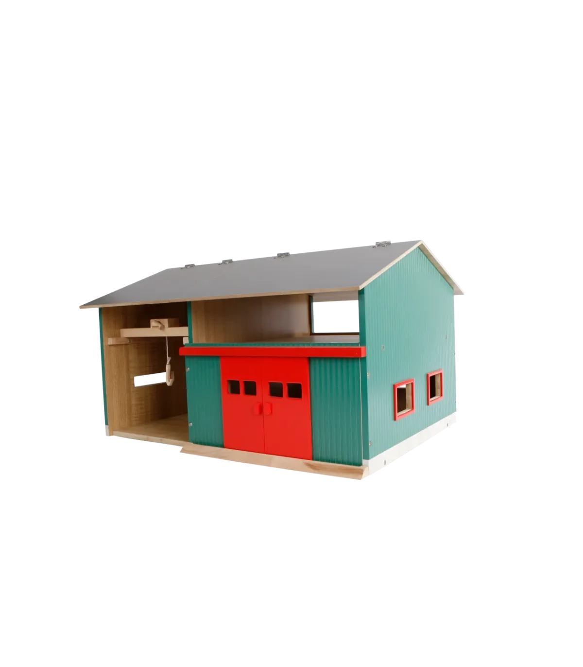 La idea básica es que puedas almacenar y reparar tus tractores agrícolas. La combinación de colores es llamativa: tablestacas verdes con puertas y ventanas rojas.