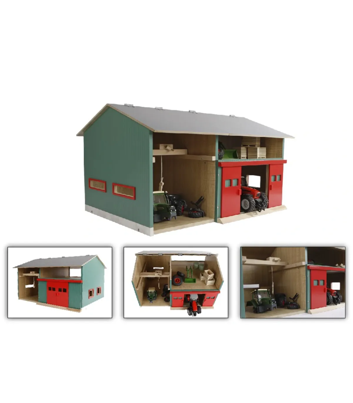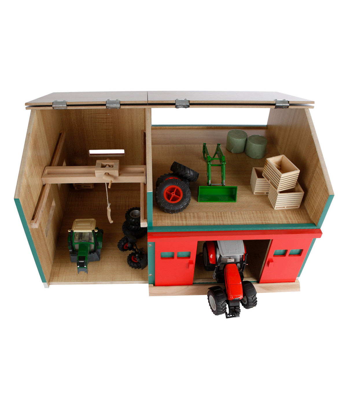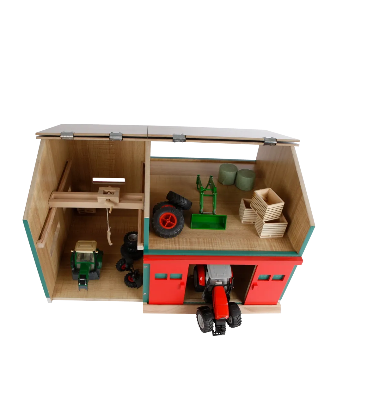 La escala es 1:32, por lo que tus tractores Siku y Britains encajarán a la perfección. El taller también cuenta con una grúa puente que te permite elevar componentes pesados.