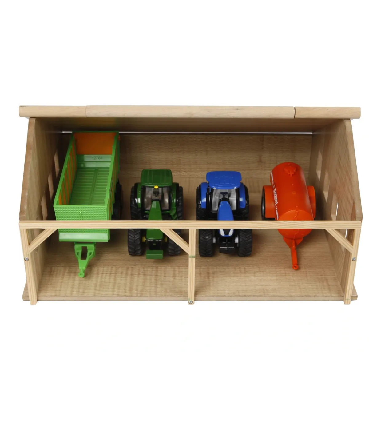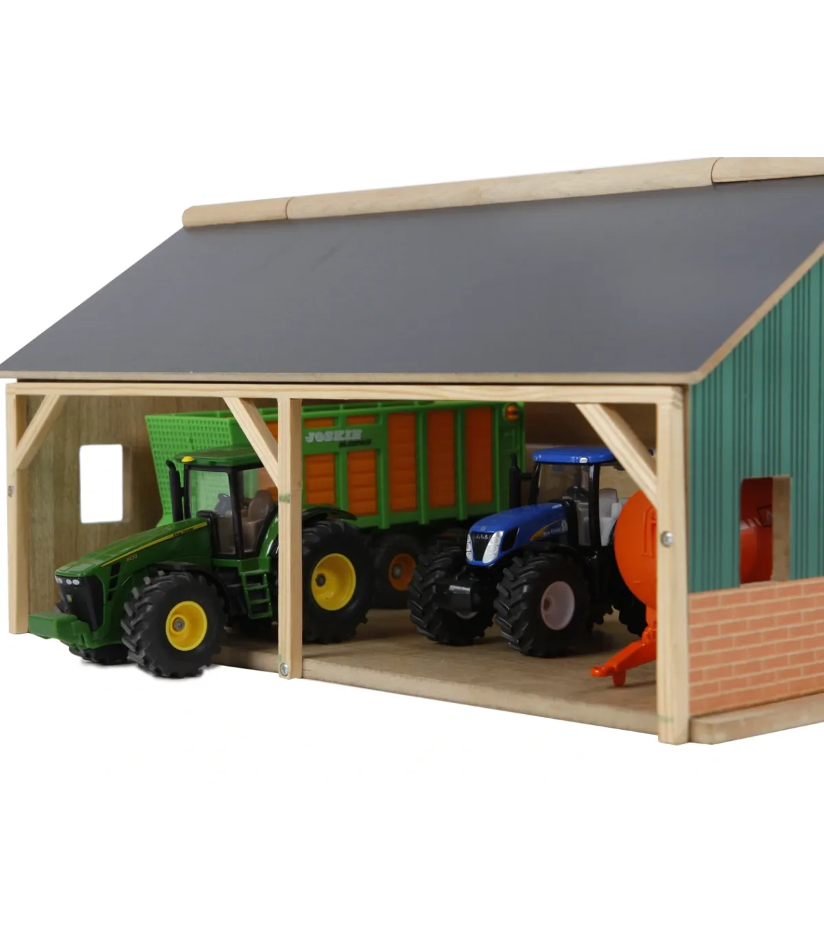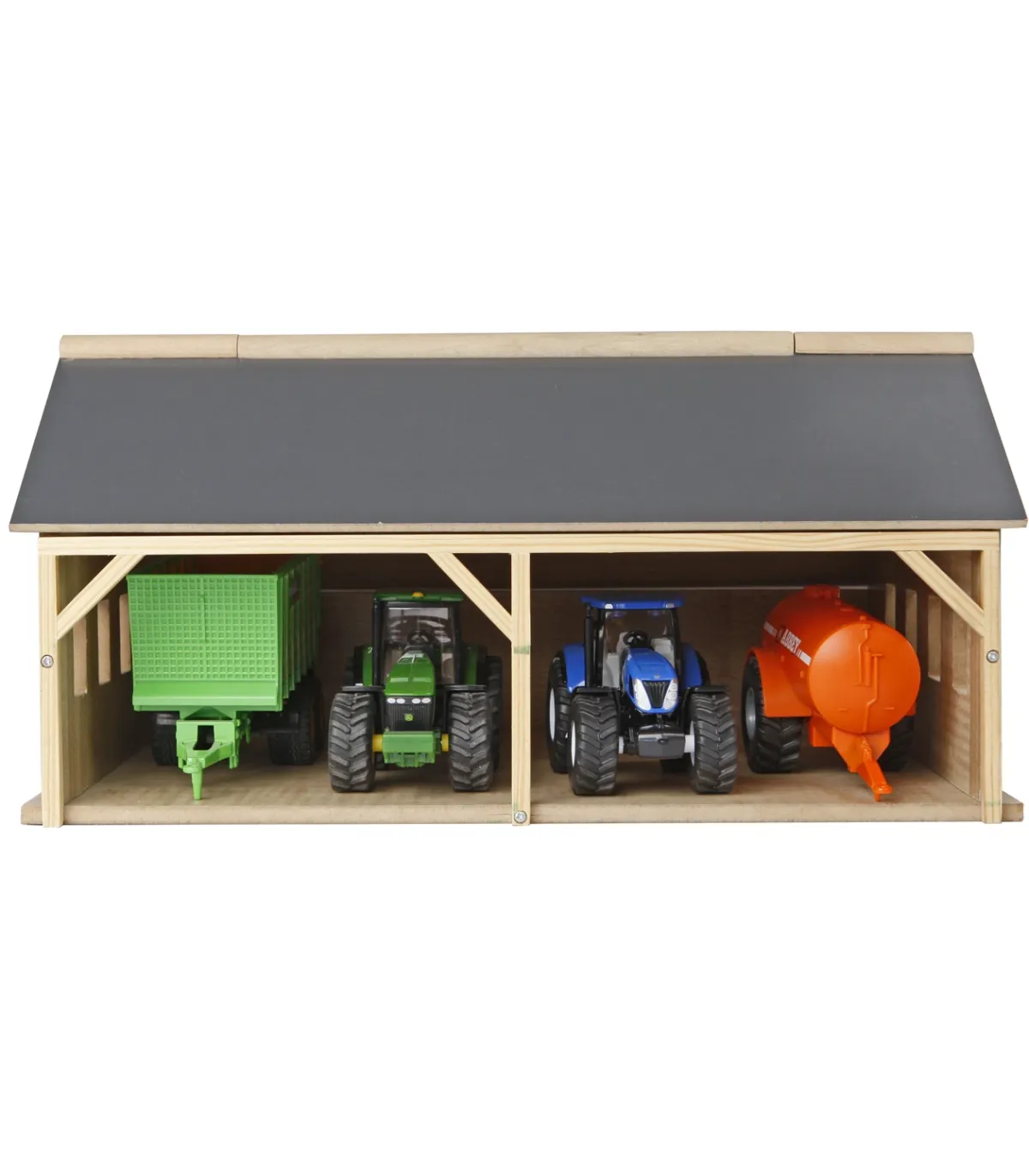 Una granja necesita un cobertizo adecuado donde se pueda guardar ordenadamente toda la maquinaria agrícola, como el tractor y los remolques. El cobertizo está hecho completamente de madera. Gracias a la apertura del techo frontal, los niños pueden acceder fácilmente a los vehículos y remolques.