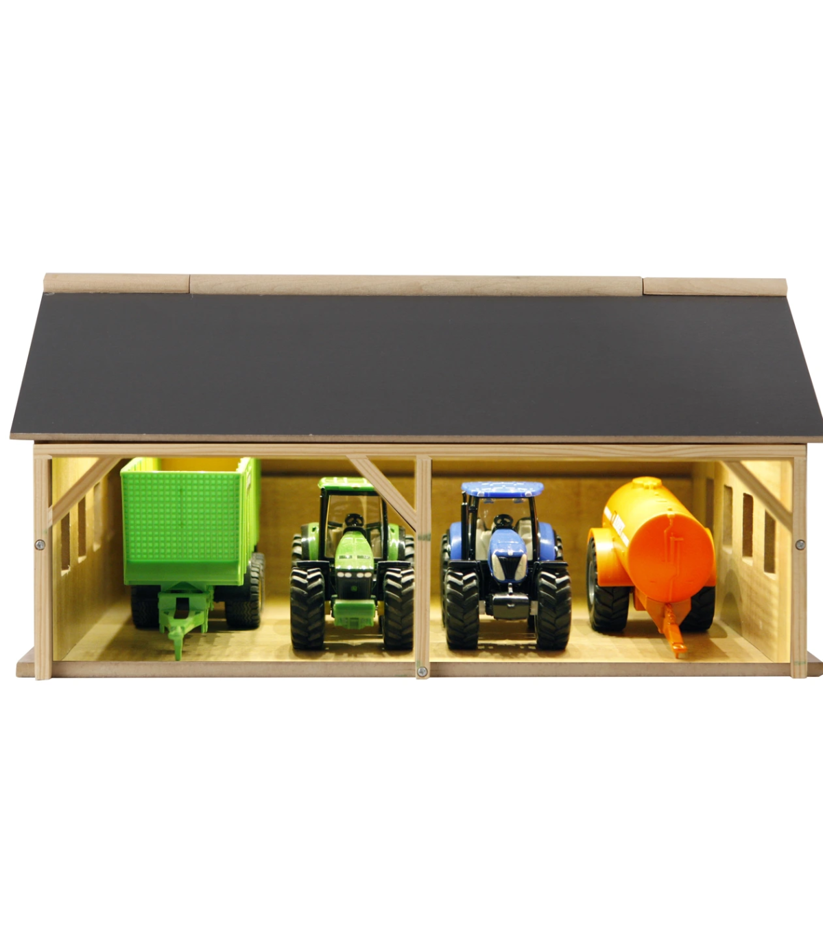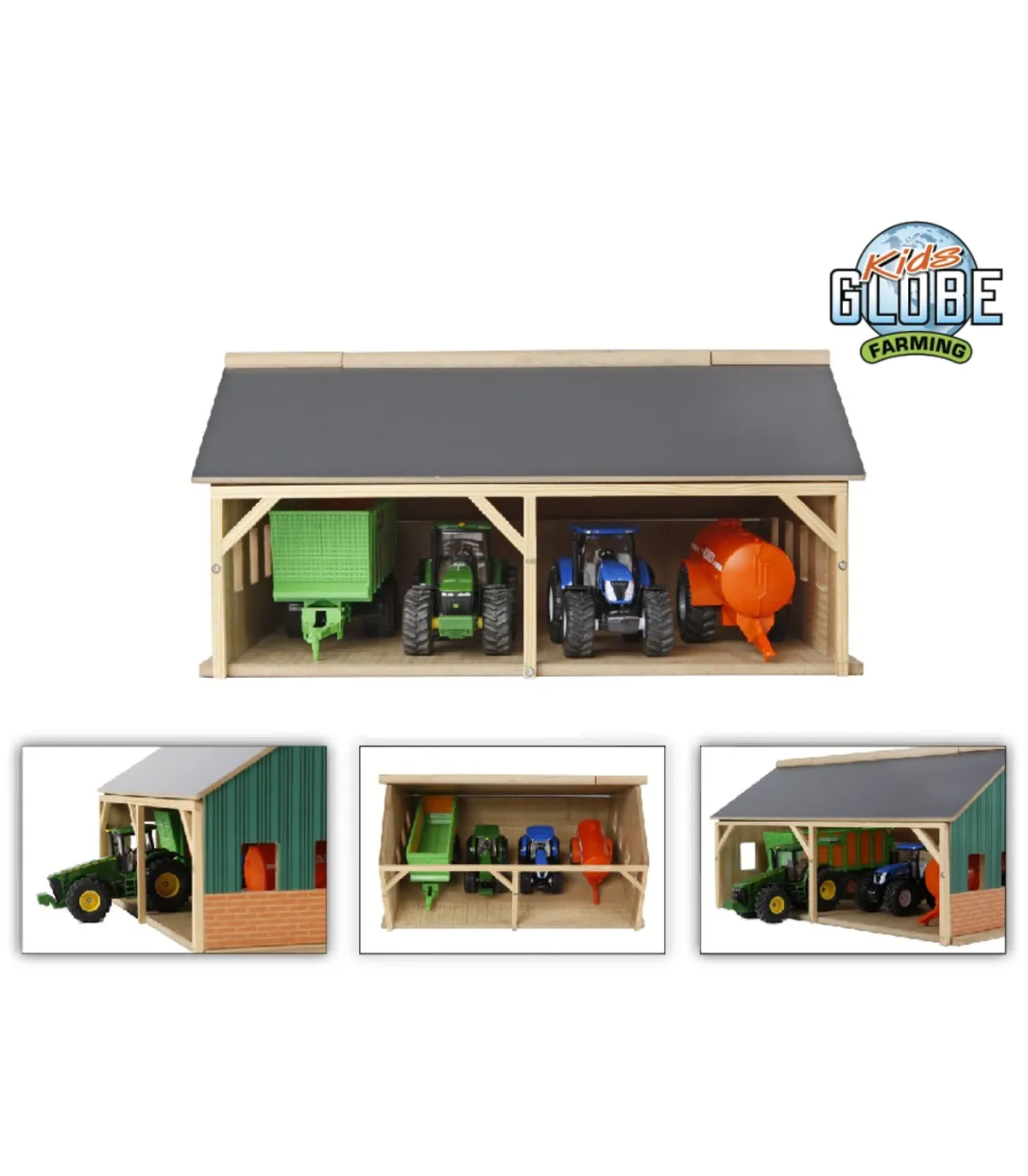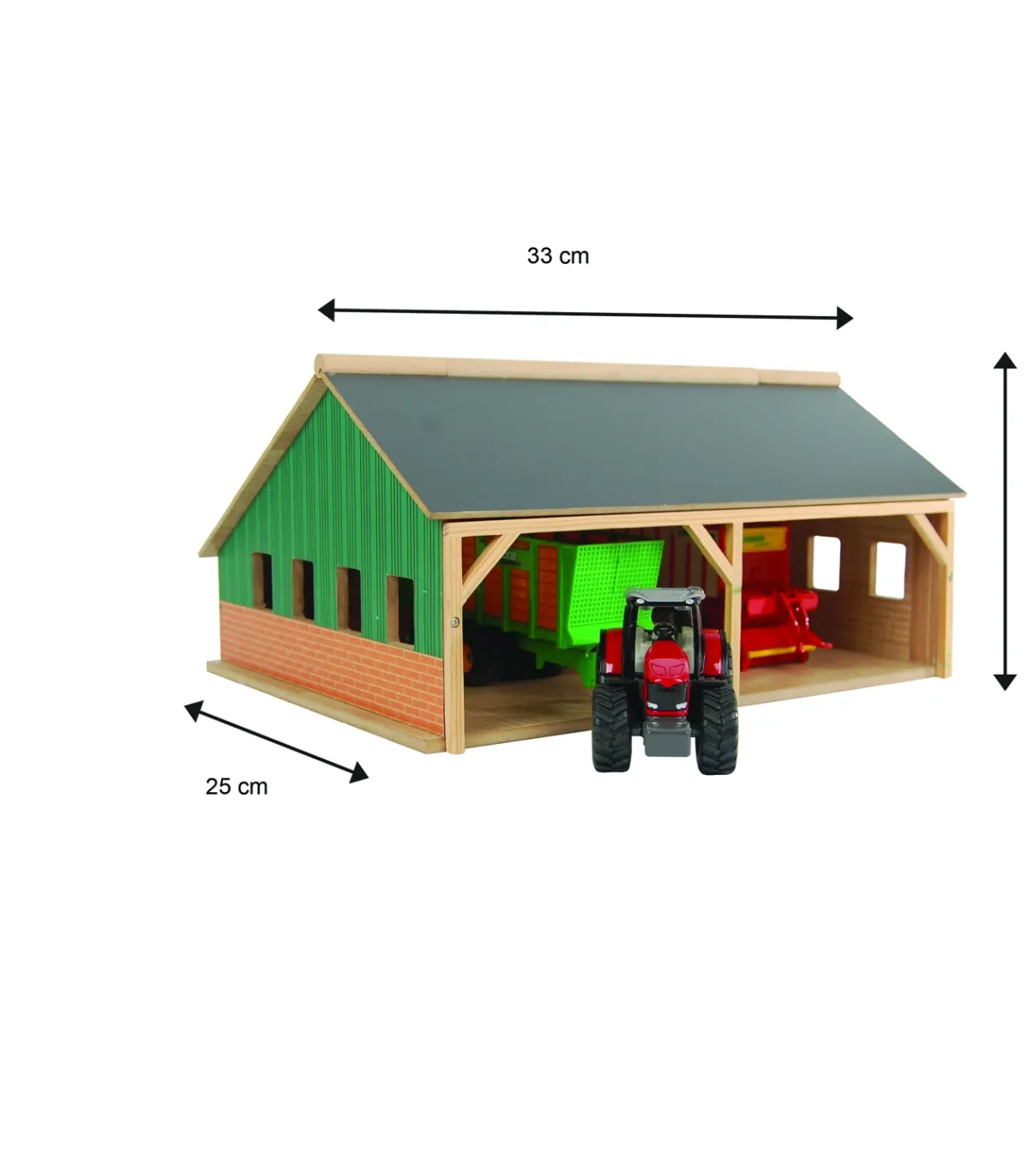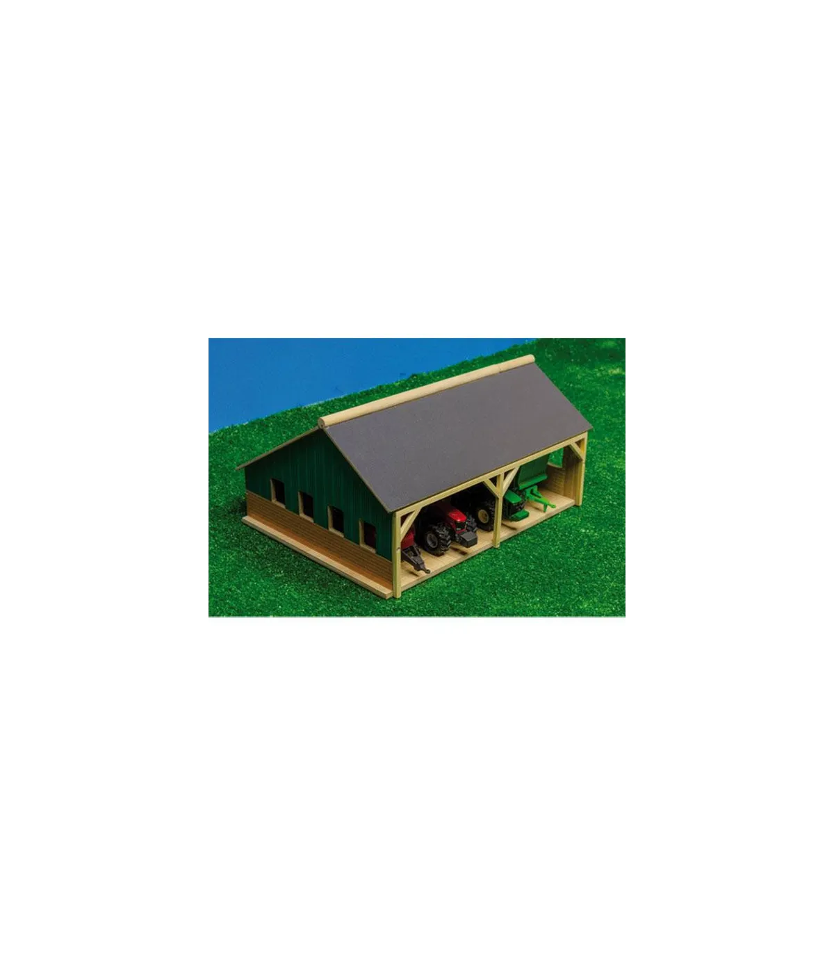 Una granja necesita un cobertizo adecuado donde se pueda guardar ordenadamente toda la maquinaria agrícola, como el tractor y los remolques. El cobertizo está hecho completamente de madera. Gracias a la apertura del techo frontal, los niños pueden acceder fácilmente a los vehículos y remolques.