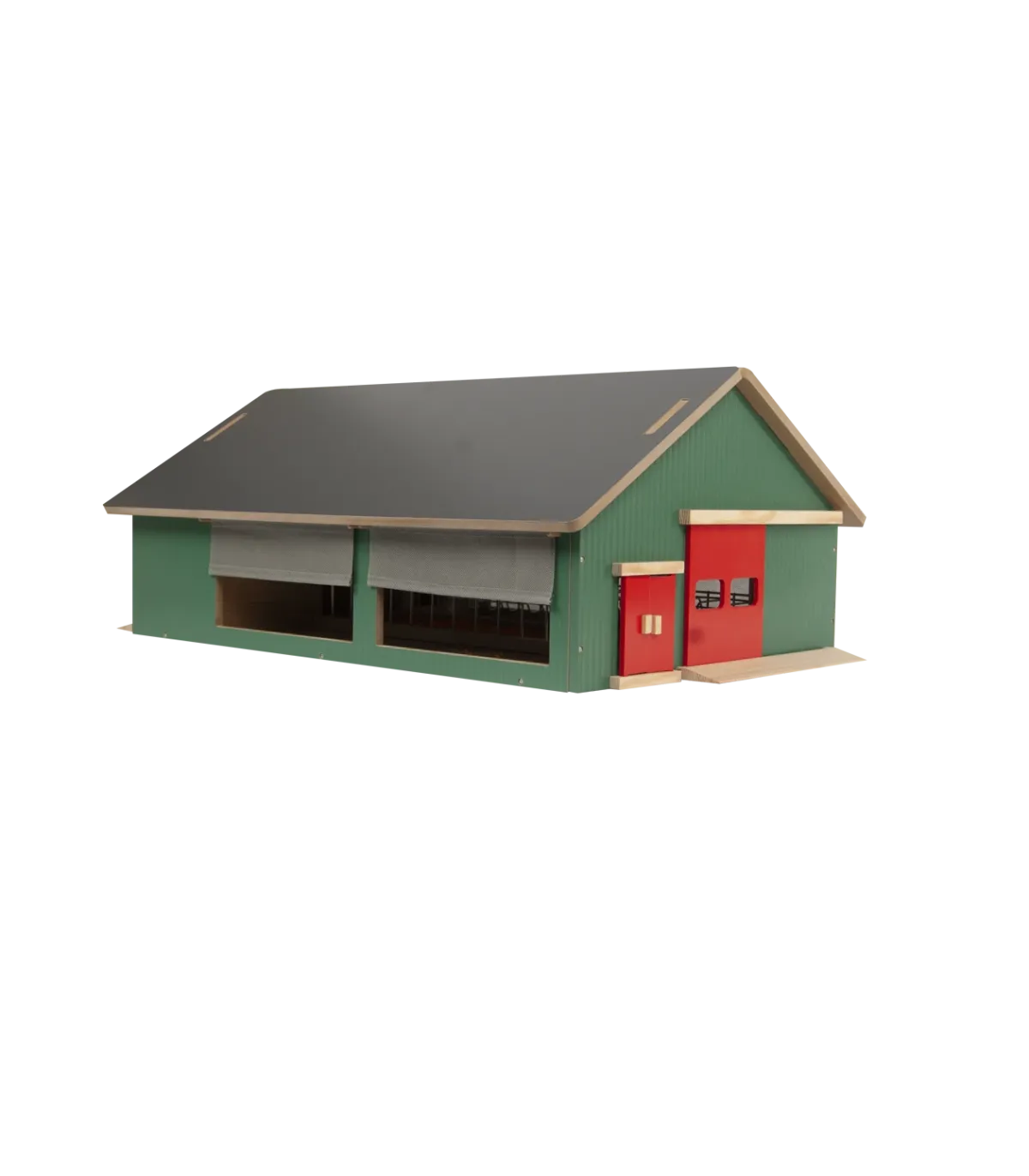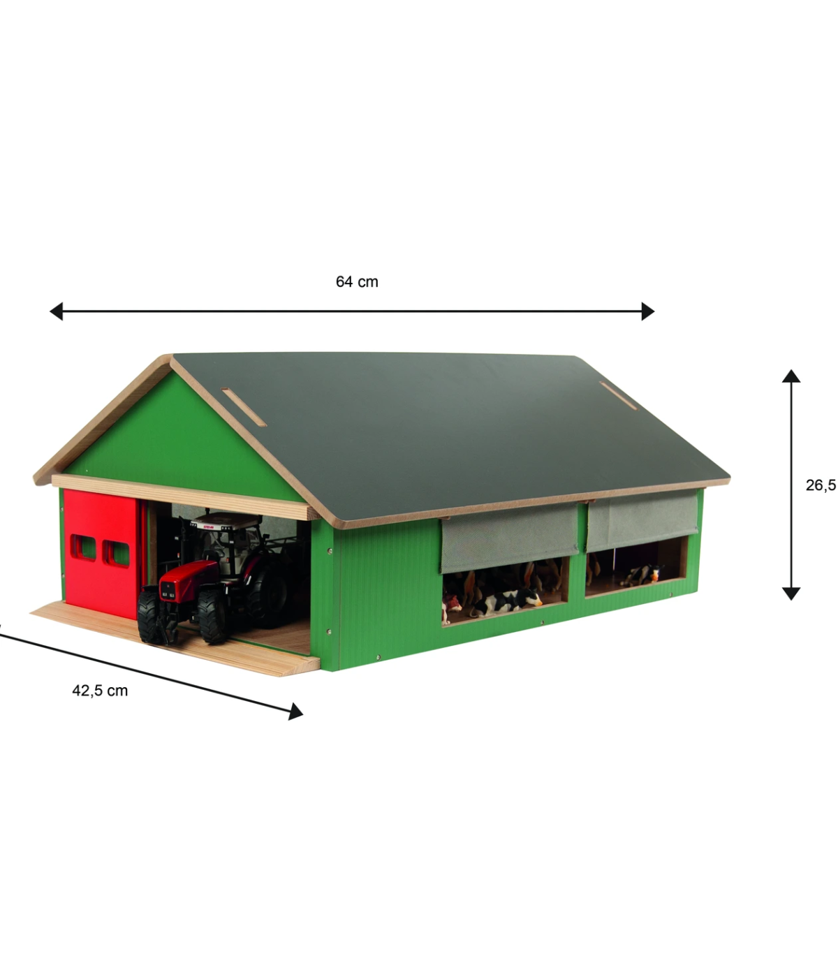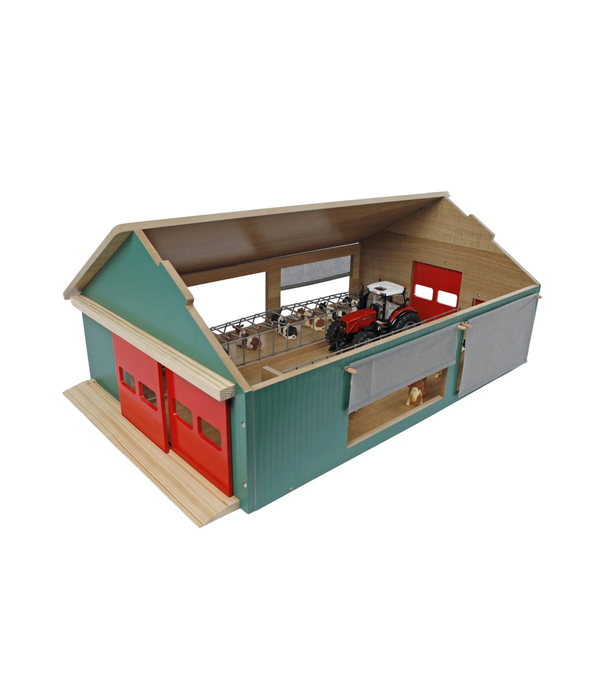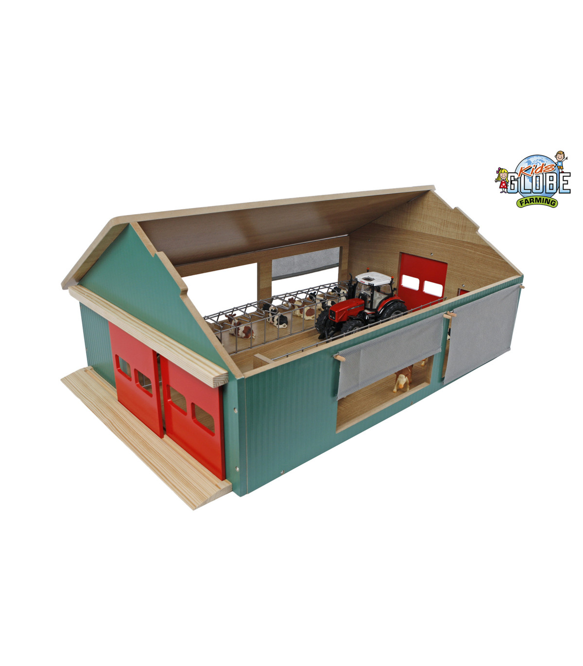 El establo Kids Globe es un robusto establo de juguete de madera, diseñado para niños pequeños que disfrutan jugando a una granja real. El techo es desmontable para facilitar el acceso a los animales y accesorios. La malla cortavientos está montada a los lados del establo, como en una granja real, para proteger a las vacas del frío y el viento. Este establo tiene una escala 1:32, lo que lo convierte en la combinación perfecta para vehículos y accesorios de marcas como Siku y Britains. ¡Completa tu mundo de granja con este establo!