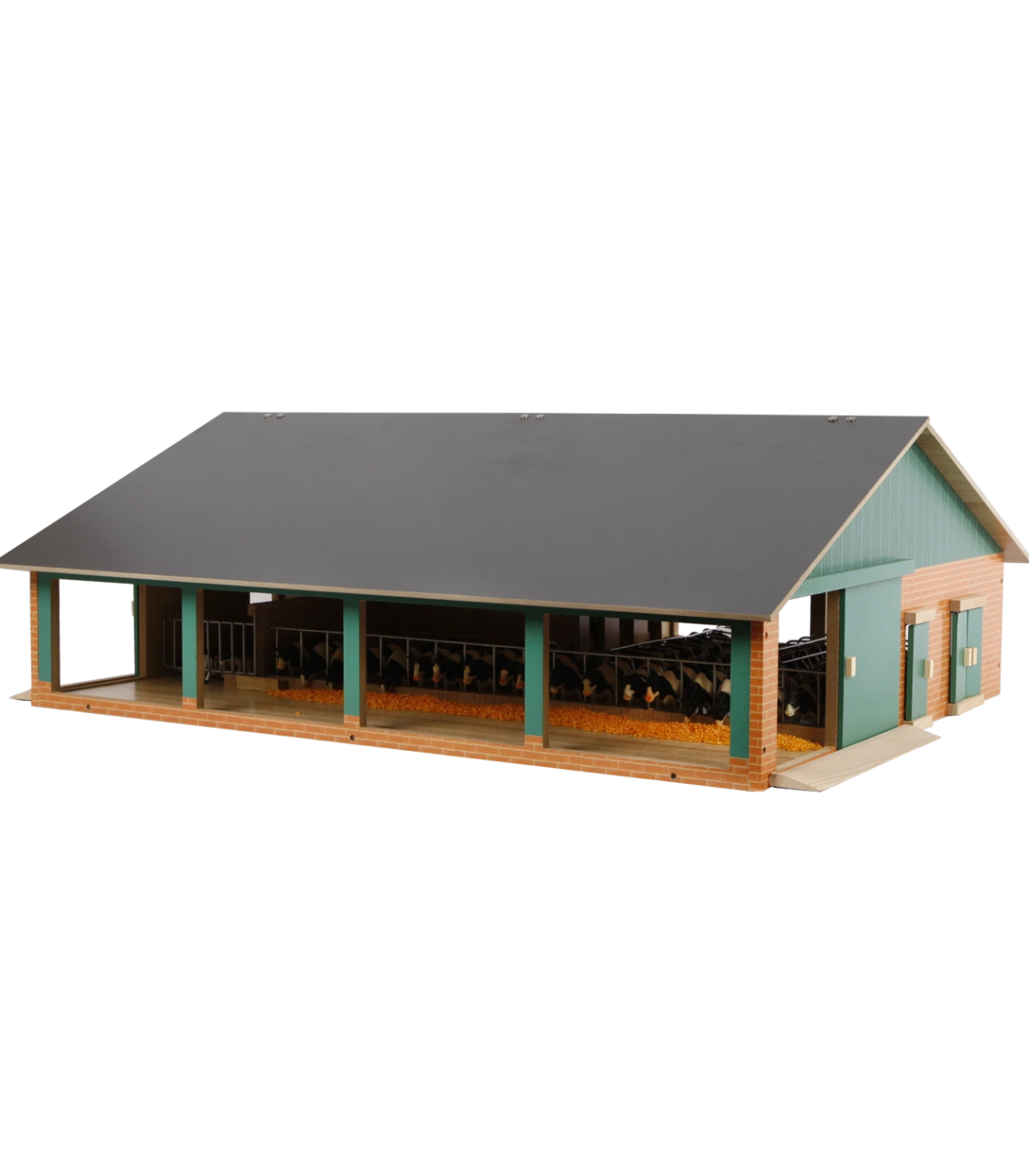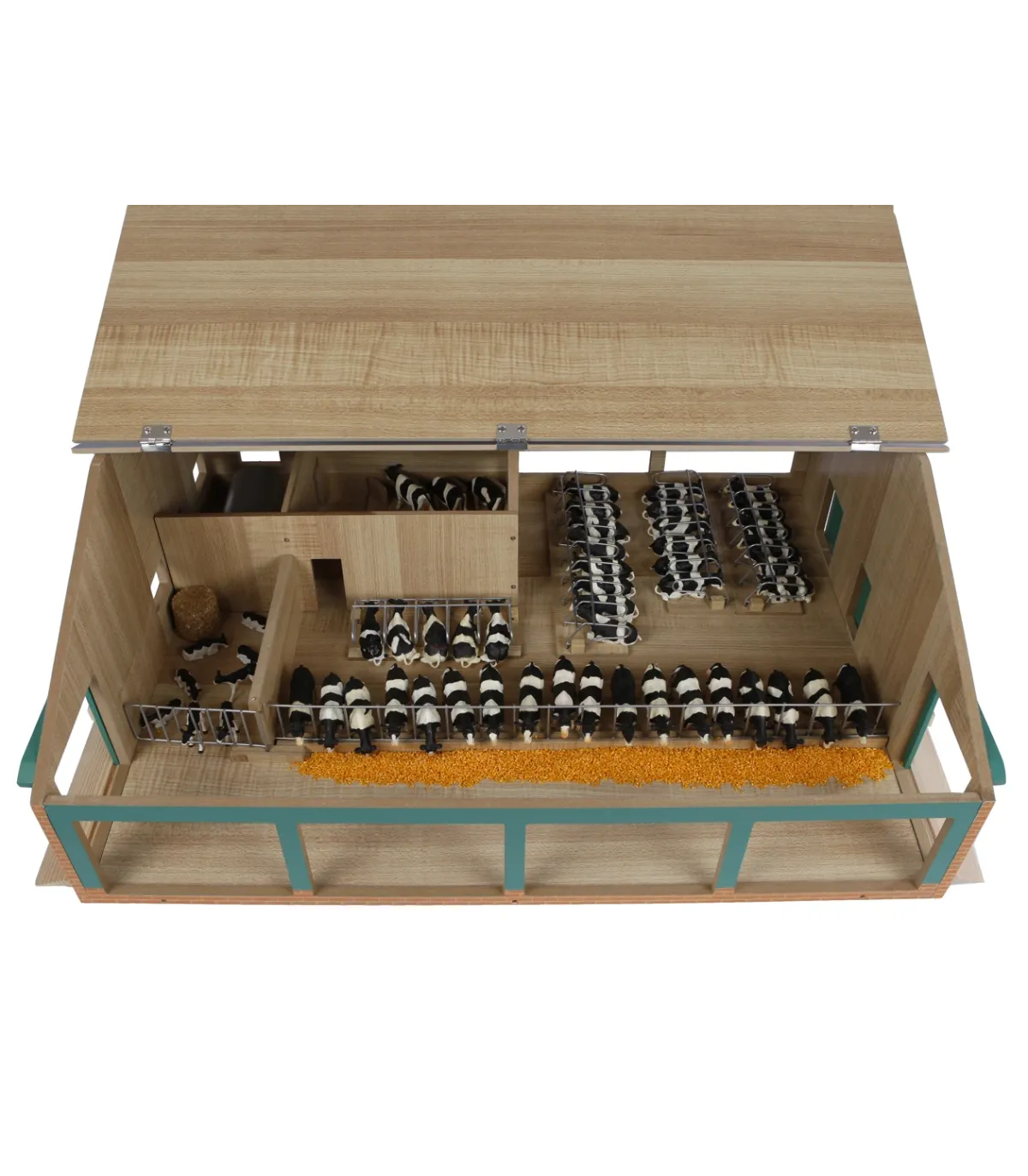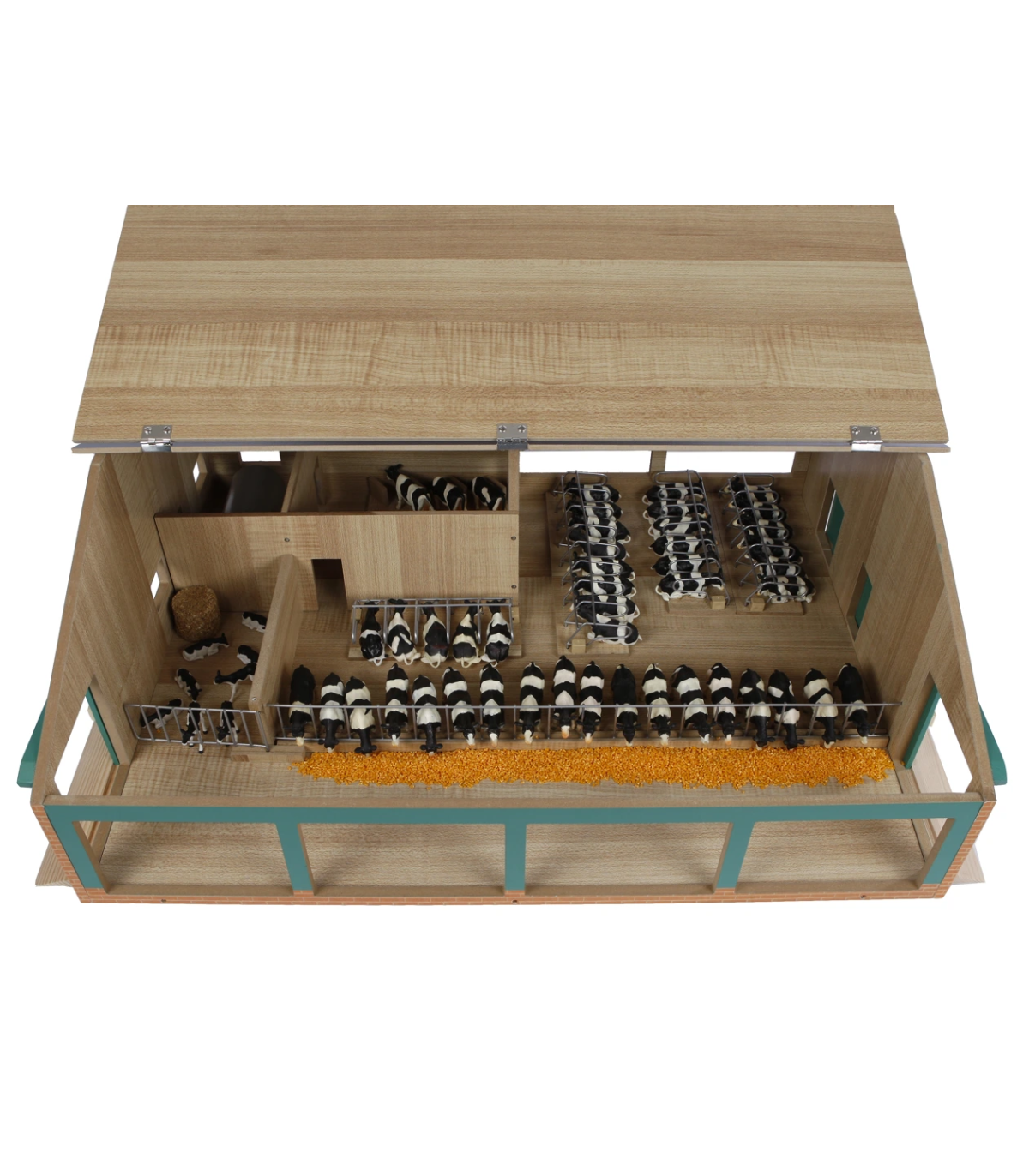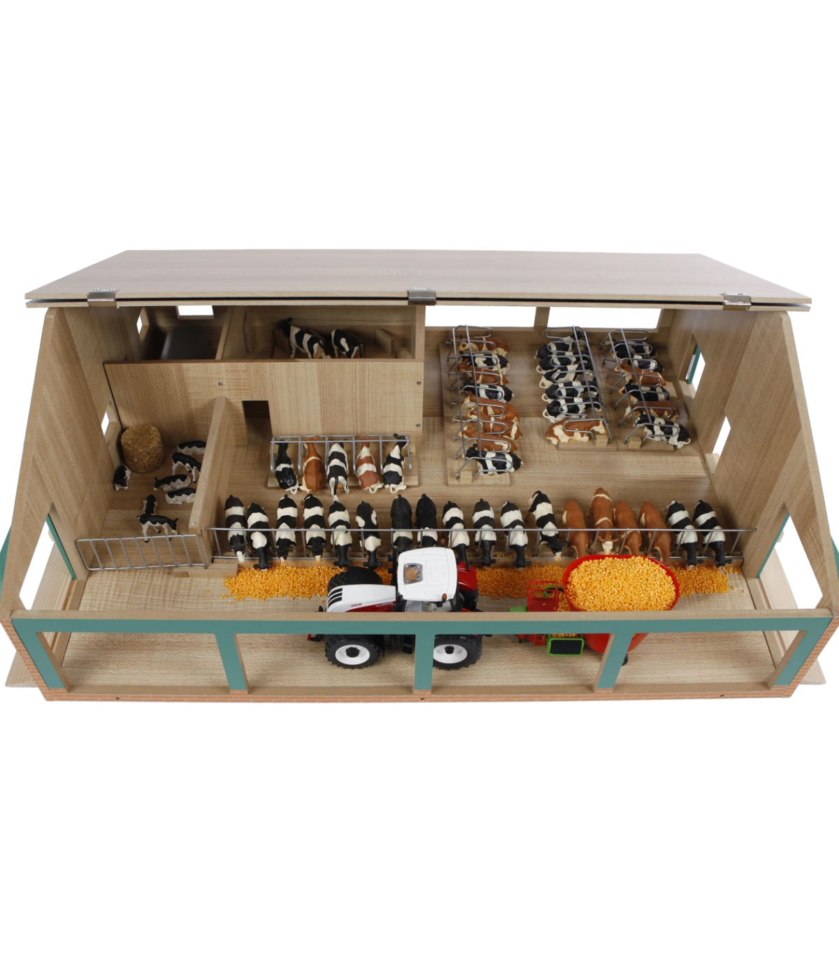 El tractor entra directamente por las grandes puertas corredizas para distribuir el alimento con precisión en la cerca, por ejemplo, utilizando un mezclador. El techo del establo se puede cerrar por completo. Para jugar, simplemente levante una sección del techo, lo que facilita el acceso a todo.