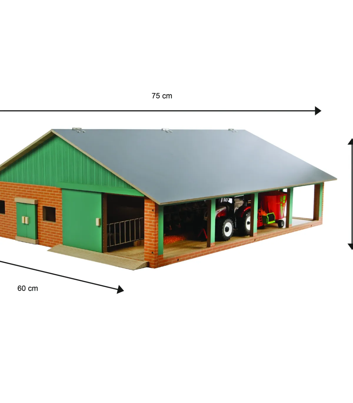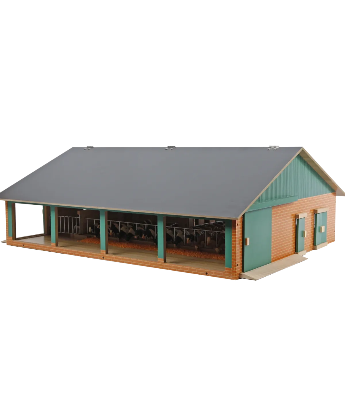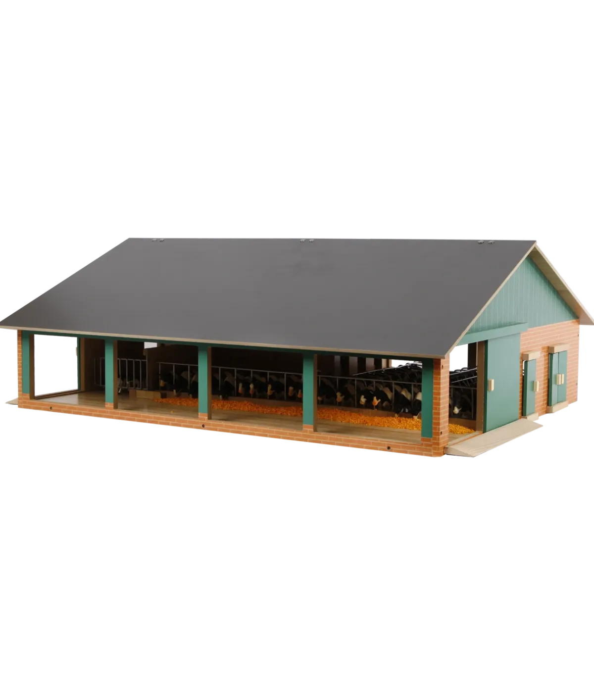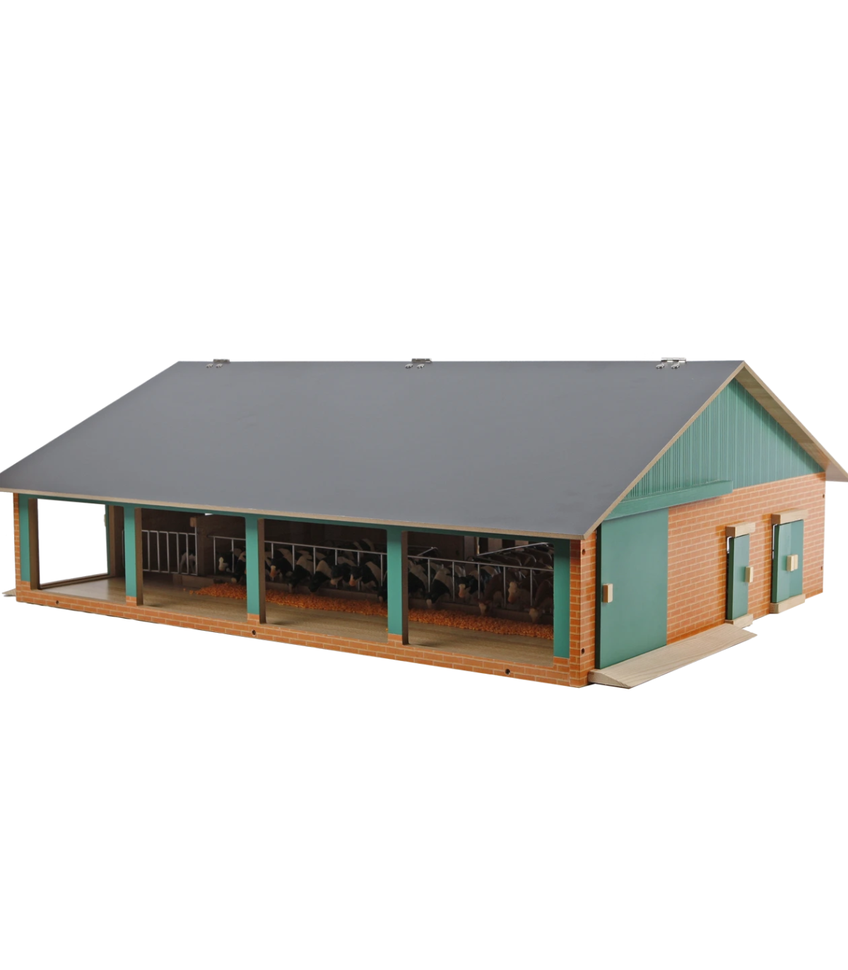El tractor entra directamente por las grandes puertas corredizas para distribuir el alimento con precisión en la cerca, por ejemplo, utilizando un mezclador. El techo del establo se puede cerrar por completo. Para jugar, simplemente levante una sección del techo, lo que facilita el acceso a todo.