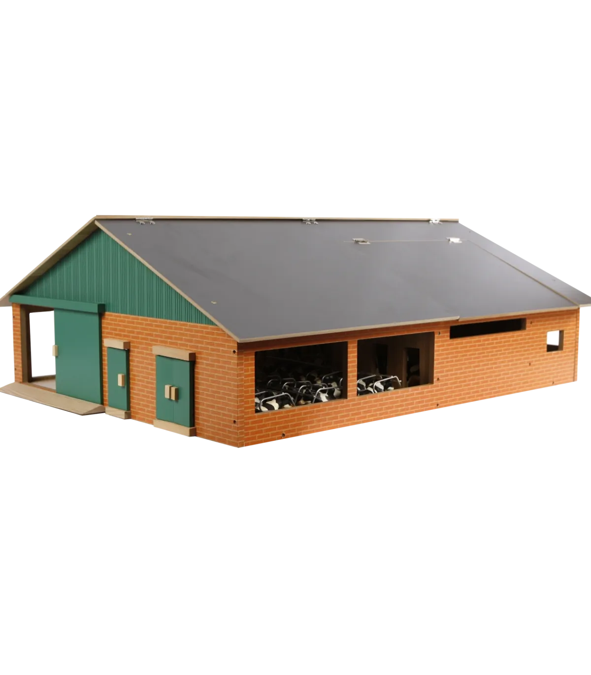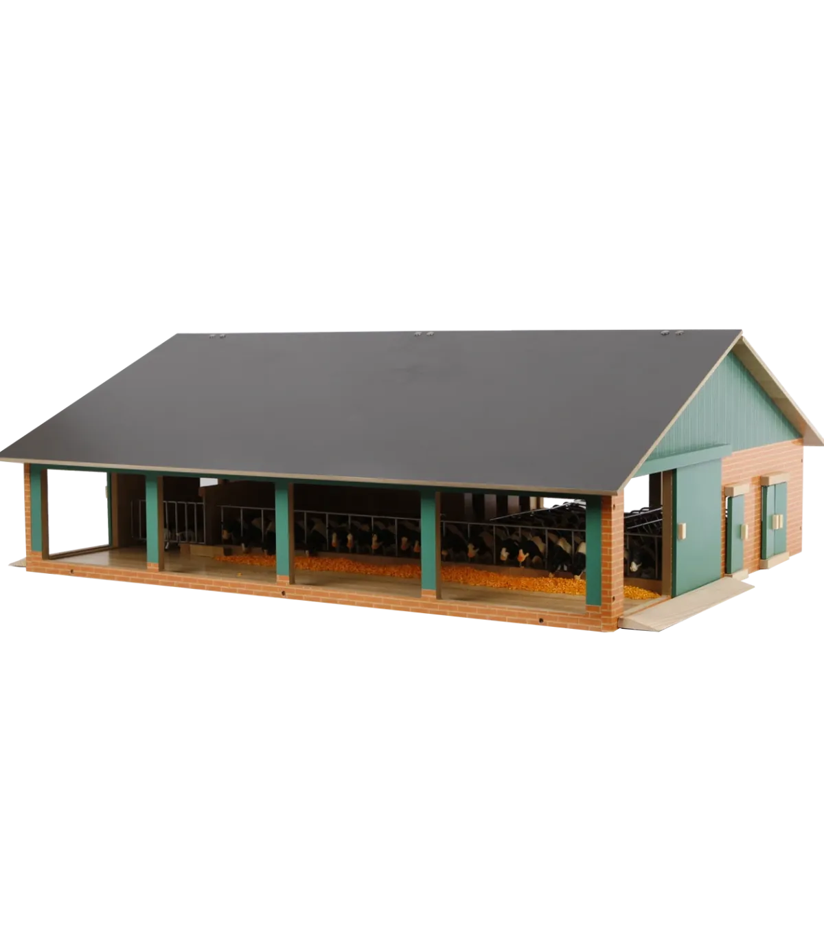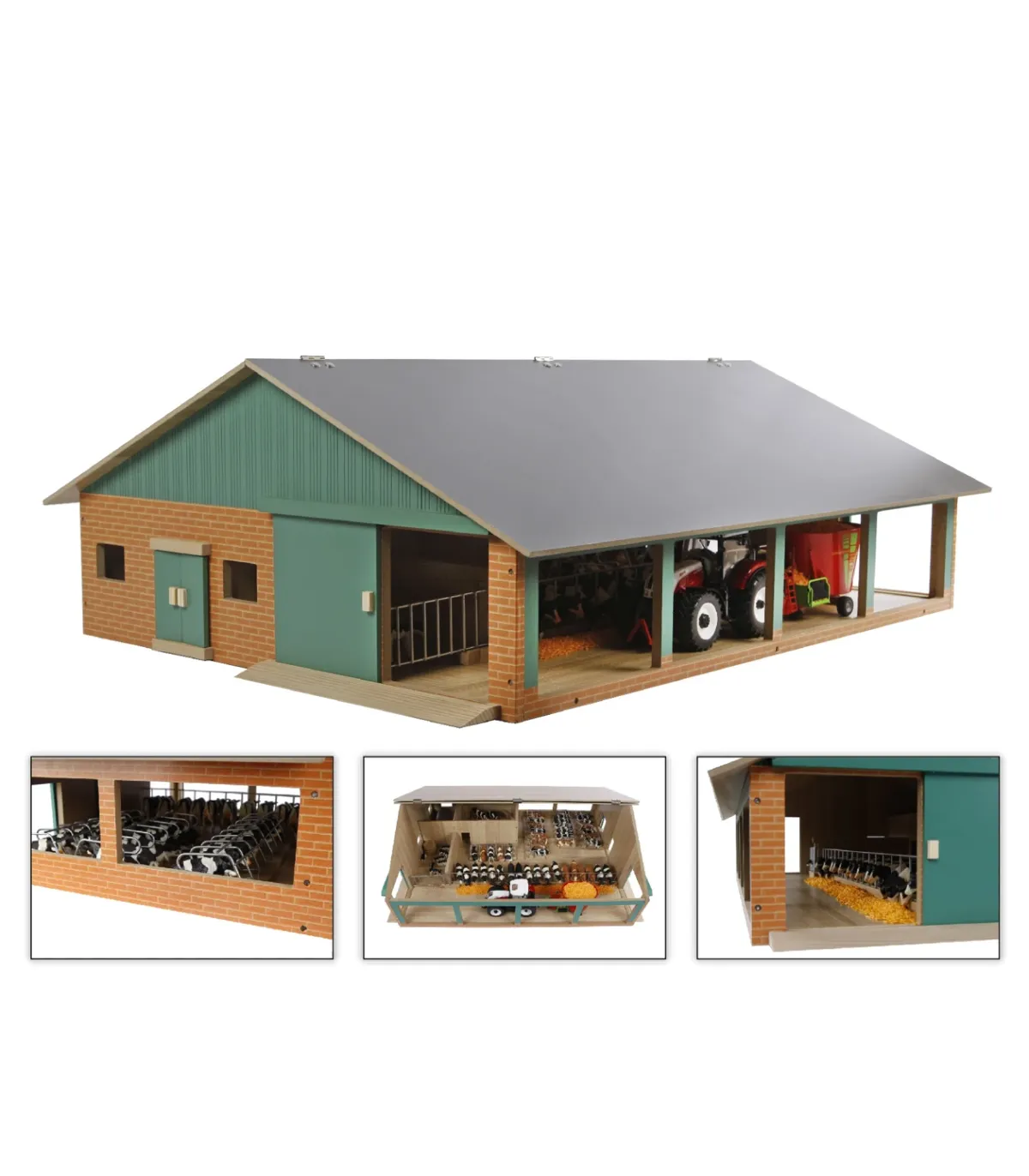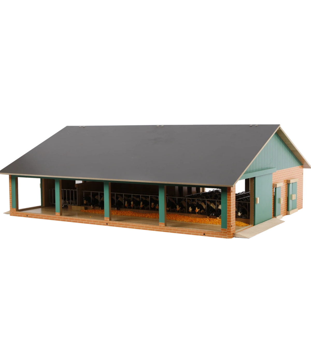 El tractor entra directamente por las grandes puertas corredizas para distribuir el alimento con precisión en la cerca, por ejemplo, utilizando un mezclador. El techo del establo se puede cerrar por completo. Para jugar, simplemente levante una sección del techo, lo que facilita el acceso a todo.