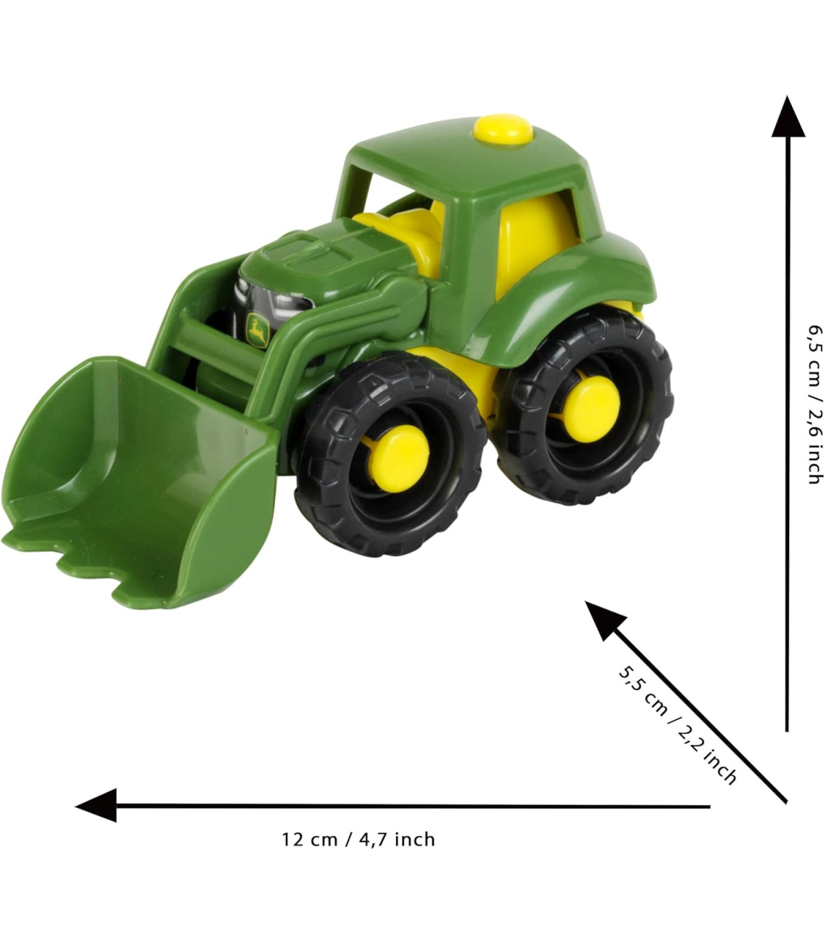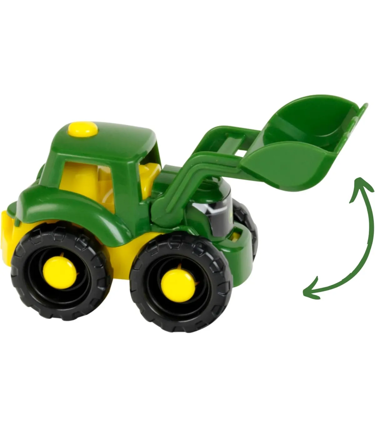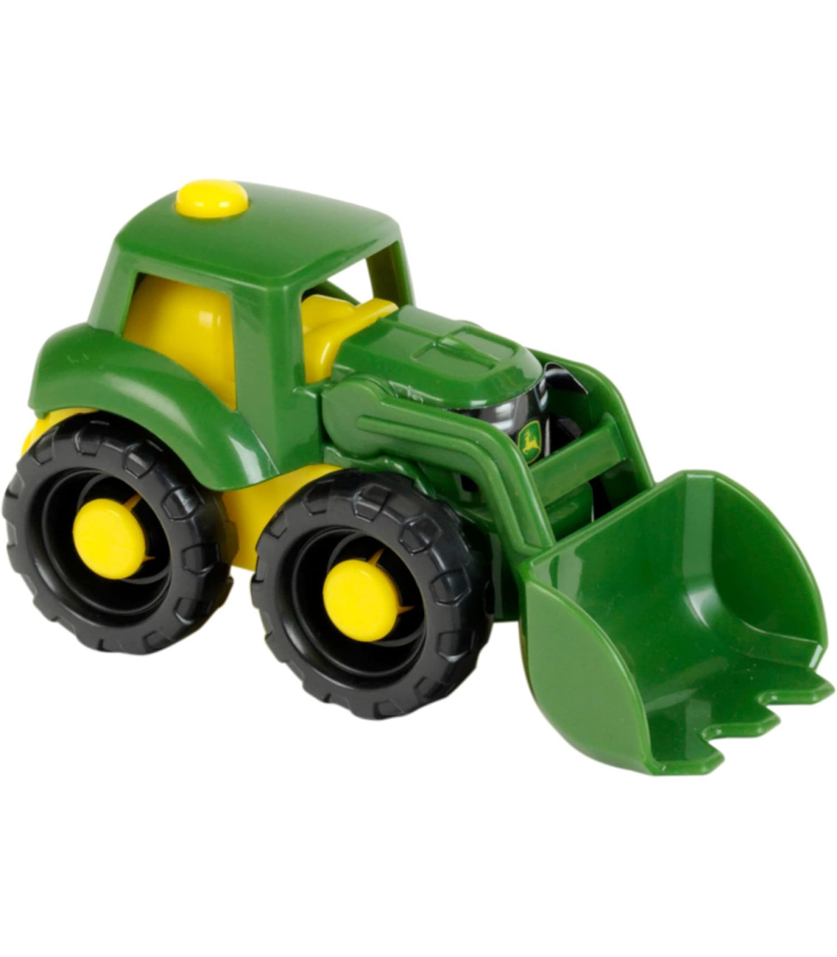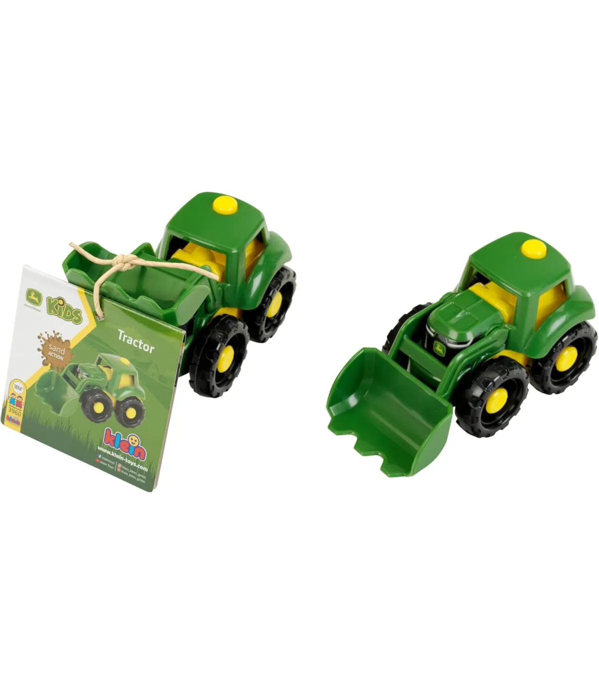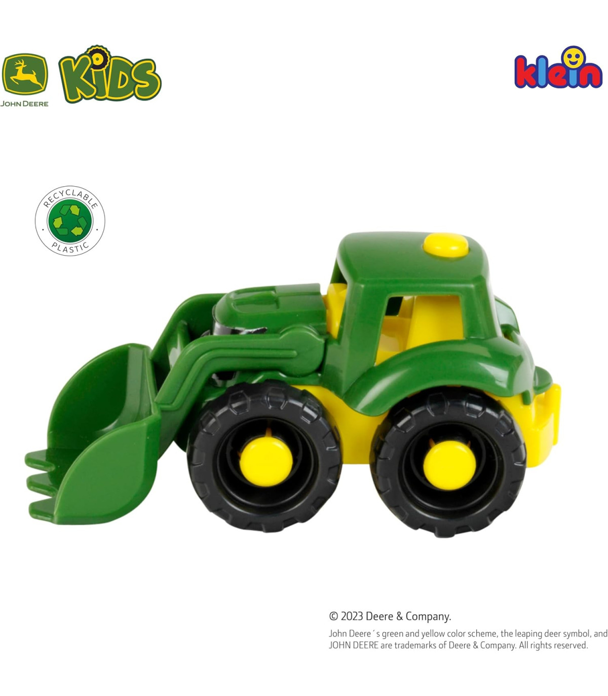 El pequeño tractor verde con un moderno diseño de John Deere es el robusto compañero de todos los amantes del aire libre y del arenero.
