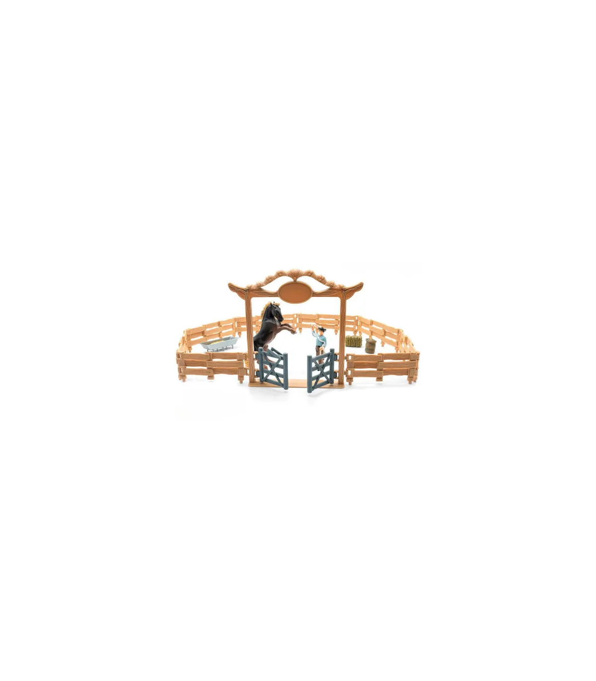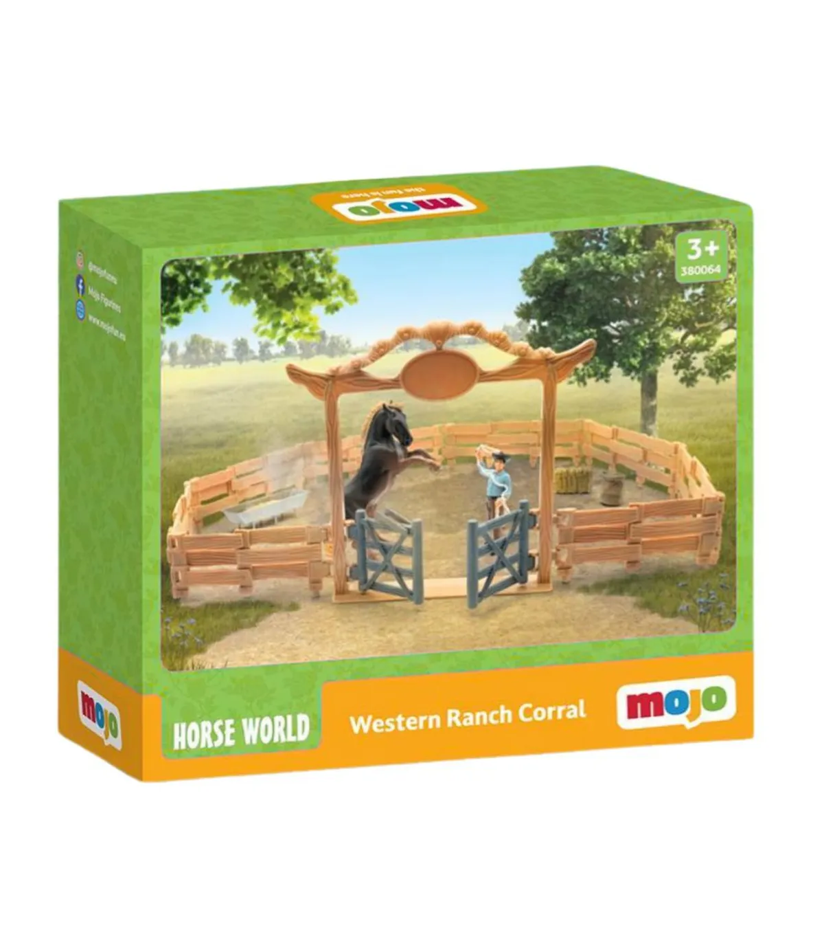 El juego de corral Mojo Western Ranch es el complemento perfecto para los mundos de juego de tu granja o rancho. Tus caballos más salvajes pueden aprender y entrenarse en el ring antes de recibir un premio por su arduo trabajo. Este juego incluye piezas de valla marrón, arco de puerta de rancho, vaquero con lazo, cría de semental Brumby, fardo de heno, bolsa de alimento y comedero.