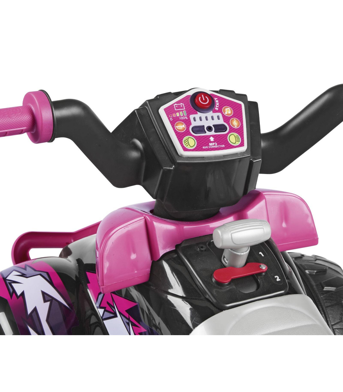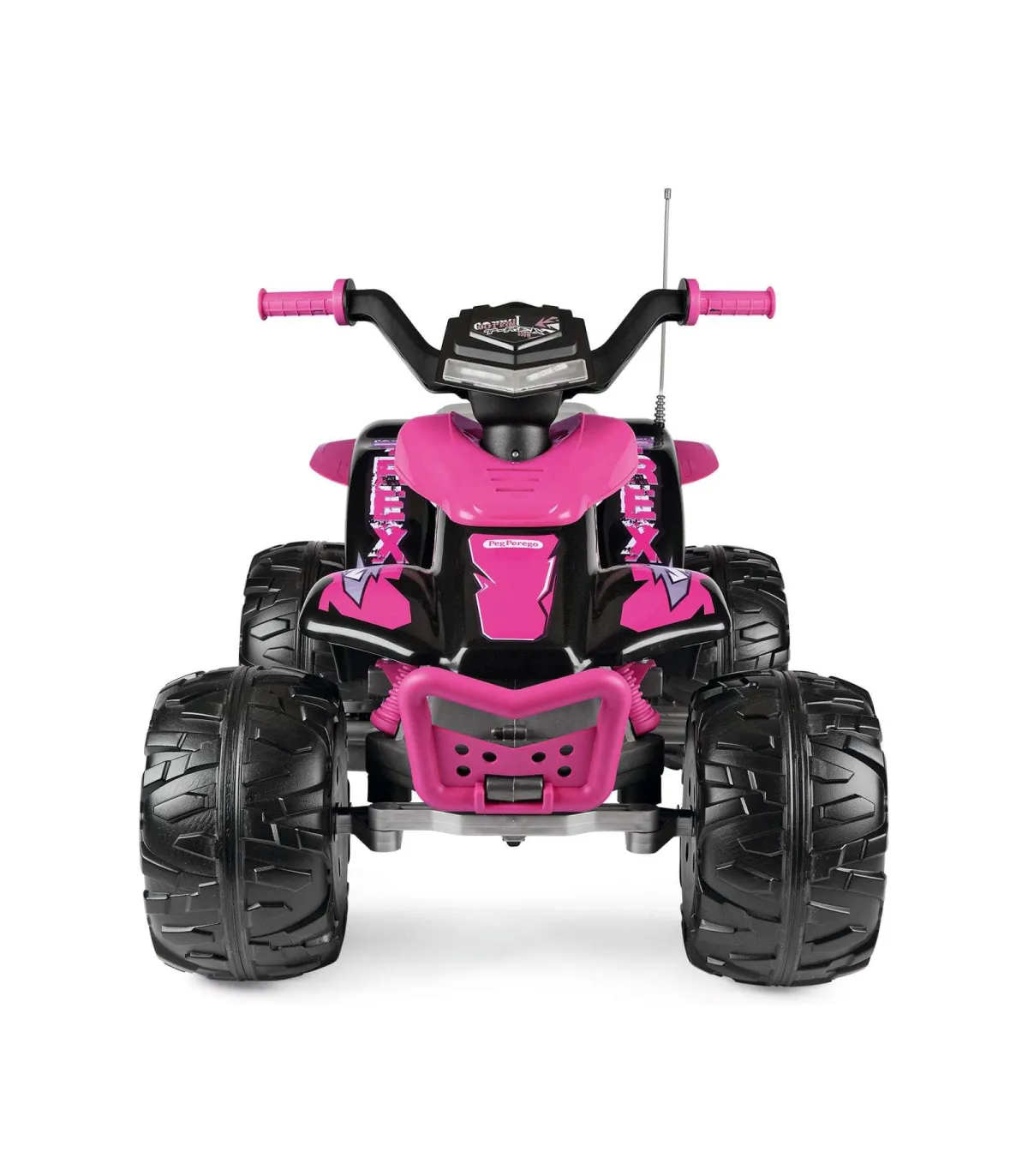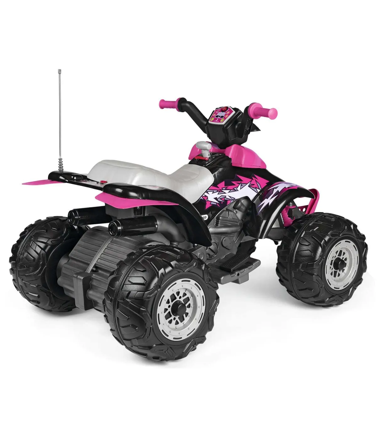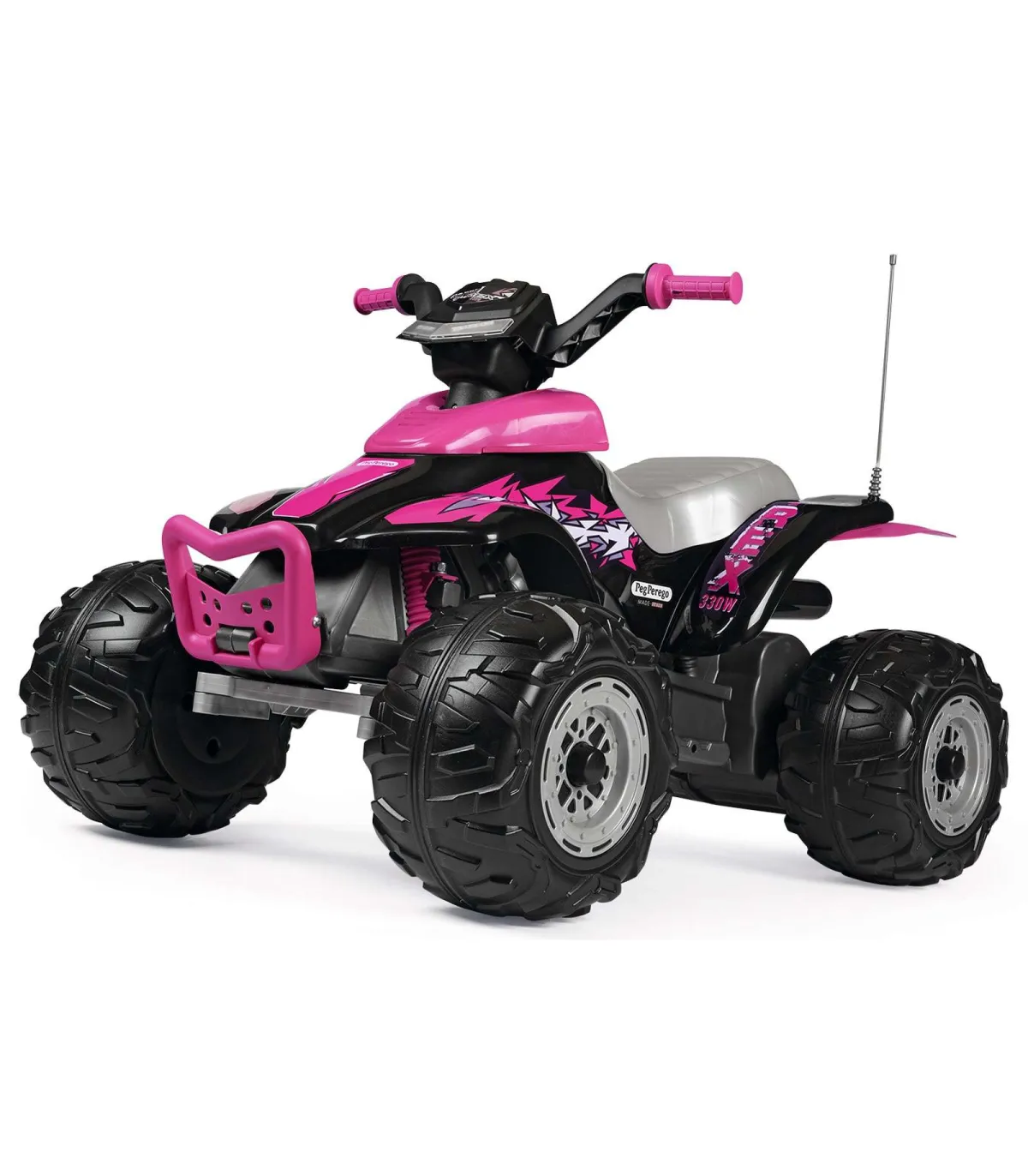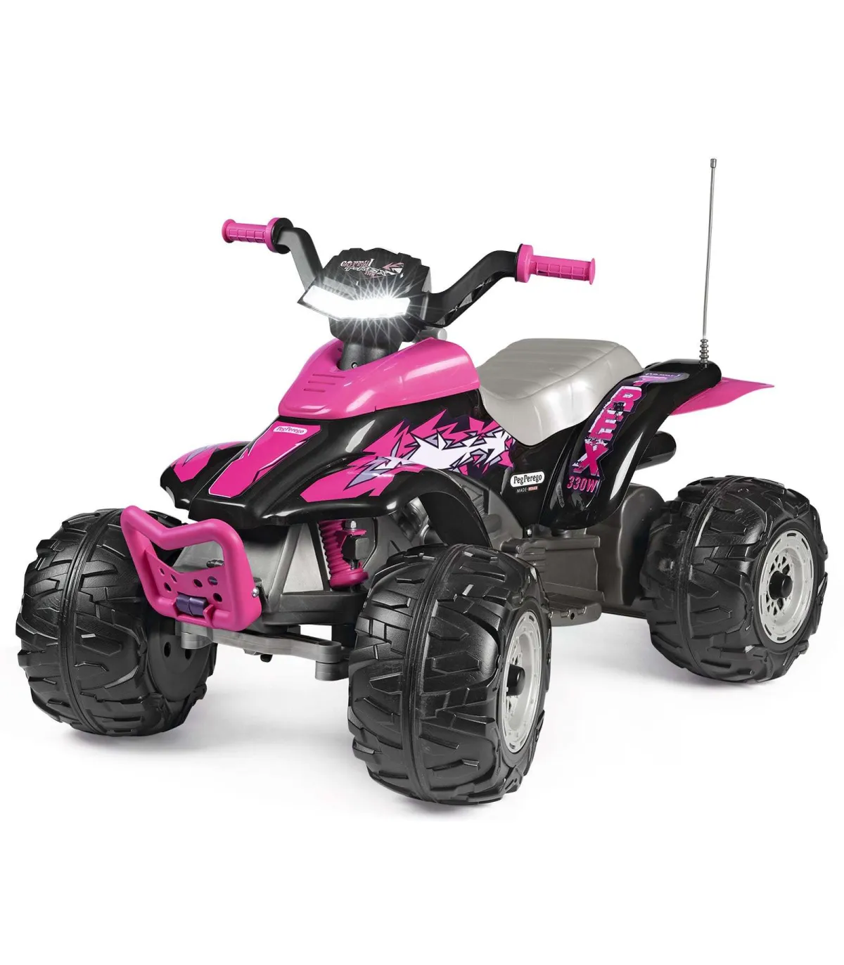 El marchoso quad eléctrico con luces y sonidos más glamuroso.Corral T-Rex 330W Pink es la edición de color rosa que ofrece una conducción deportiva con estilo. Calidad Made in Italy y características de alto rendimiento como luces, sonidos, melodías y claxon, para divertirse a partir de 3 años. Este quad eléctrico funciona con una batería recargable de 12 V - 8Ah y 100 Wh.