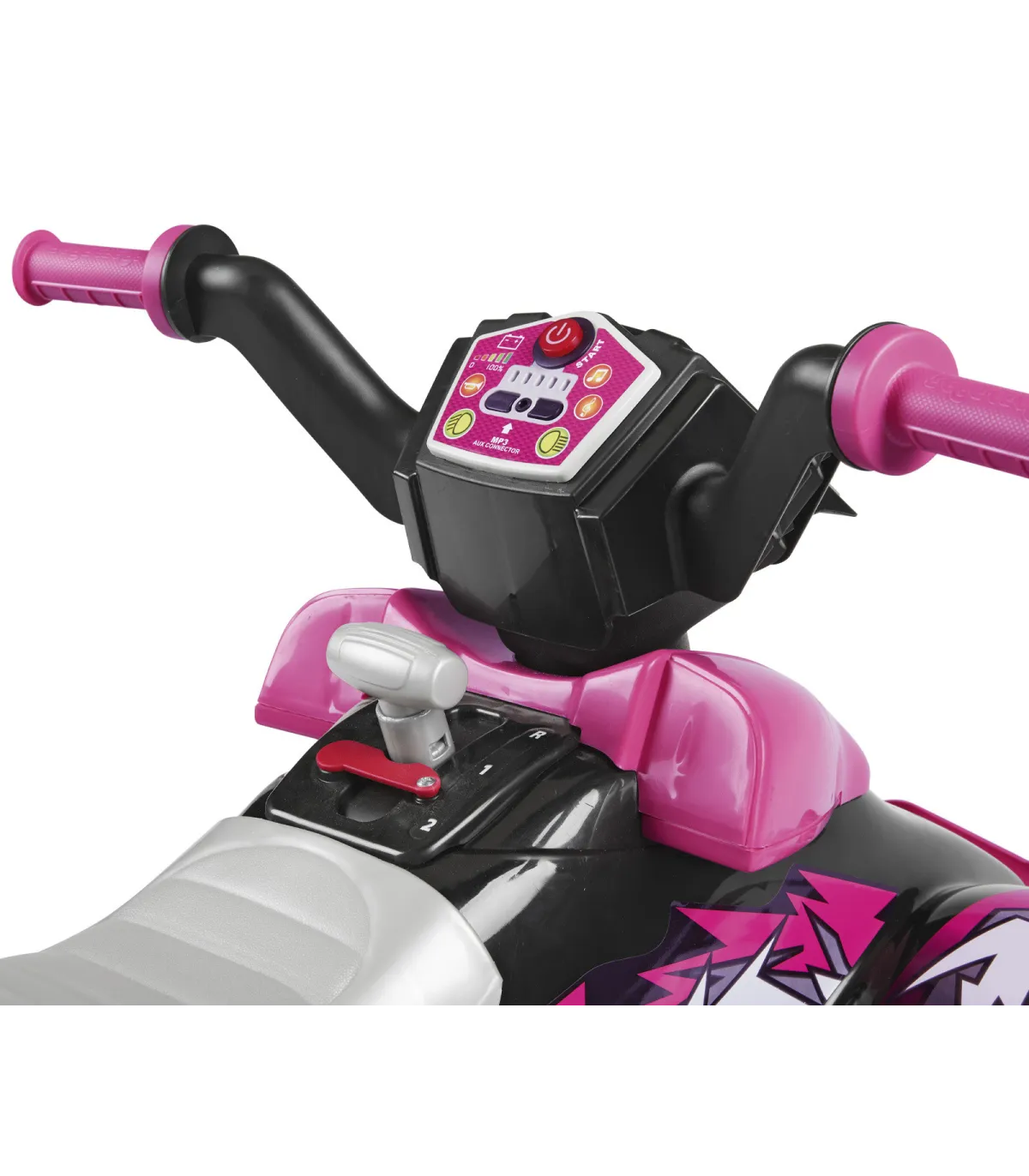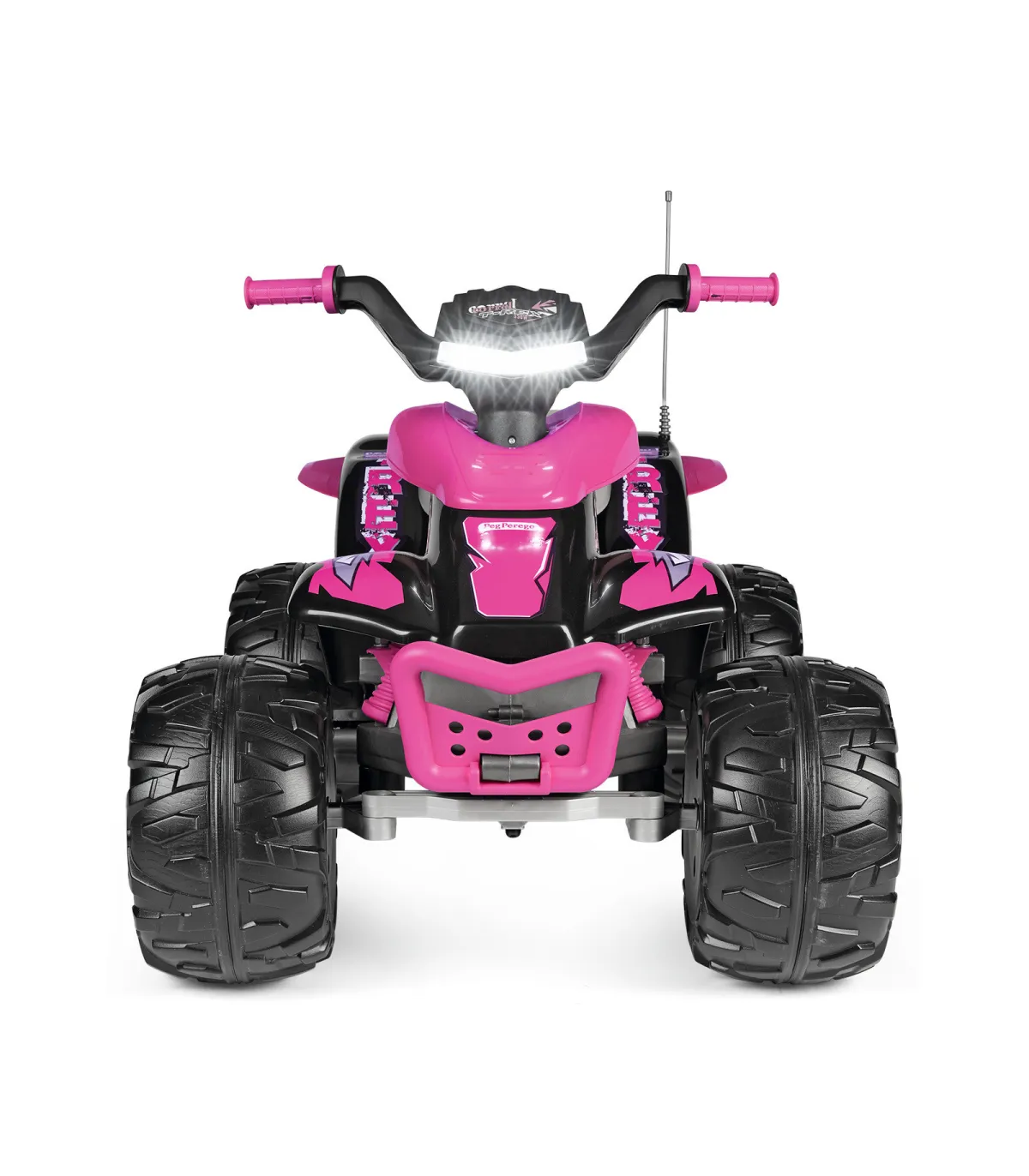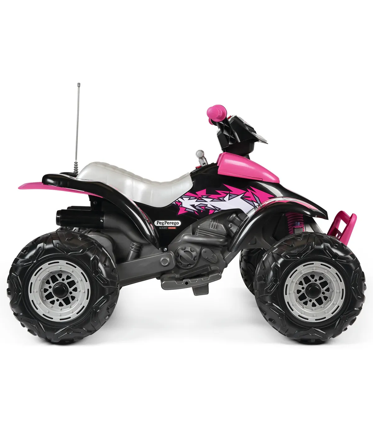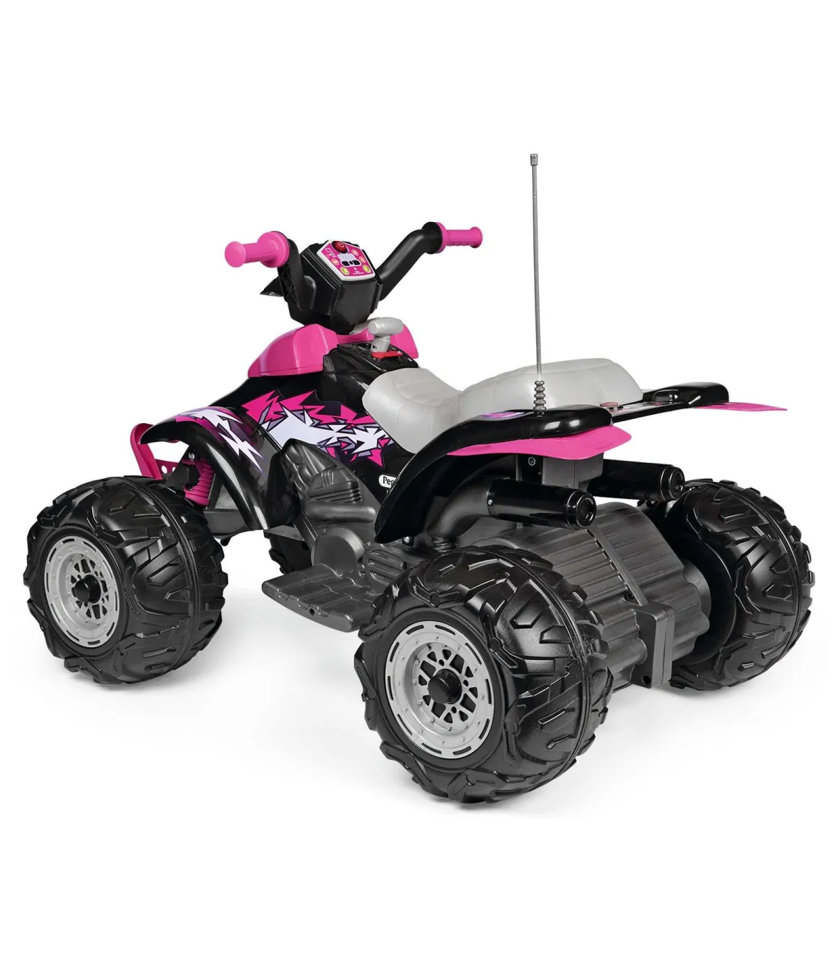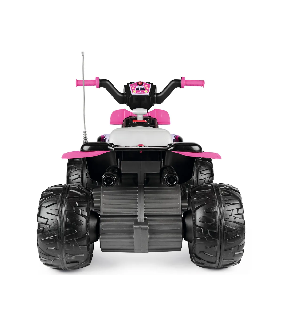 El marchoso quad eléctrico con luces y sonidos más glamuroso.Corral T-Rex 330W Pink es la edición de color rosa que ofrece una conducción deportiva con estilo. Calidad Made in Italy y características de alto rendimiento como luces, sonidos, melodías y claxon, para divertirse a partir de 3 años. Este quad eléctrico funciona con una batería recargable de 12 V - 8Ah y 100 Wh.