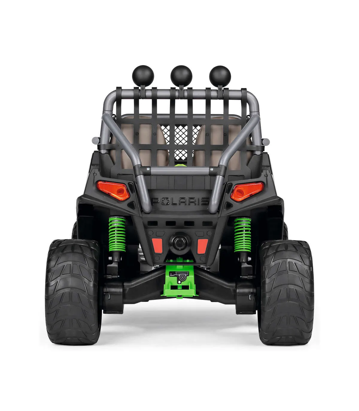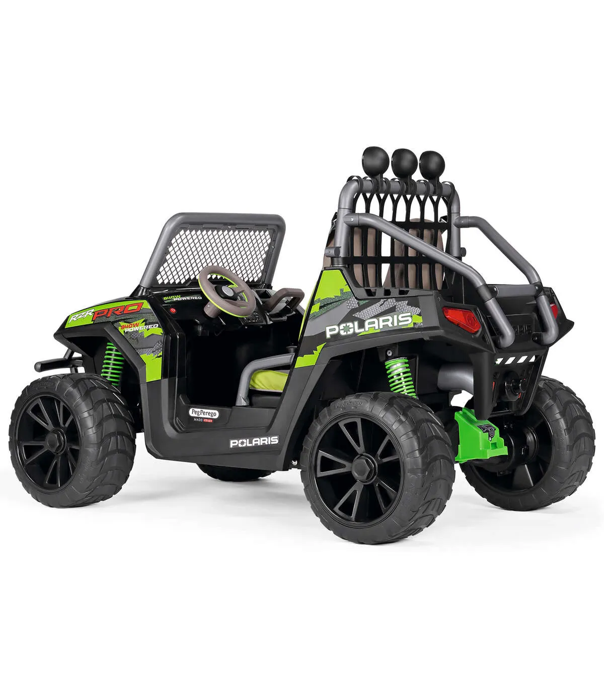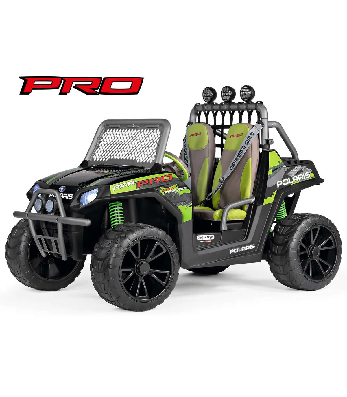 ¡Conduce como un profesional!¡Bienvenidos a nuevos niveles de diversión! ¡El Polaris RZR Pro Green Shadow es el potente todoterreno con batería recargable de 24 voltios/12 Ah listo para todo!Cero molestias, mucha diversión:PRESTACIONES PROFESIONALES: gracias a las ruedas de goma con tracción extrema, ¡no hay terreno que no pueda superar!BAJO NIVEL DE RUIDO Y UNA POTENCIA SUPERIOR: los 2 motores silenciosos de 420 W (840 W en total) dan movimiento al juguete como un auténtico coche eléctrico con un bajo nivel de ruido.¡DIVERSIÓN EXTREMA INCLUSO EN CAMINOS DE TIERRA! Su punto fuerte es superar obstáculos. Los dos motores cuadruplicados permiten desafiar cualquier obstáculo con gran facilidad y superar pendientes de hasta el 17% siempre a máxima potencia y a una velocidad máxima de 12 km/h. A partir de 6 años