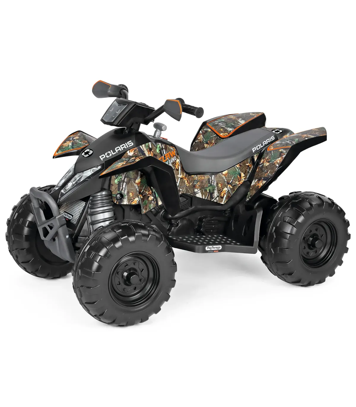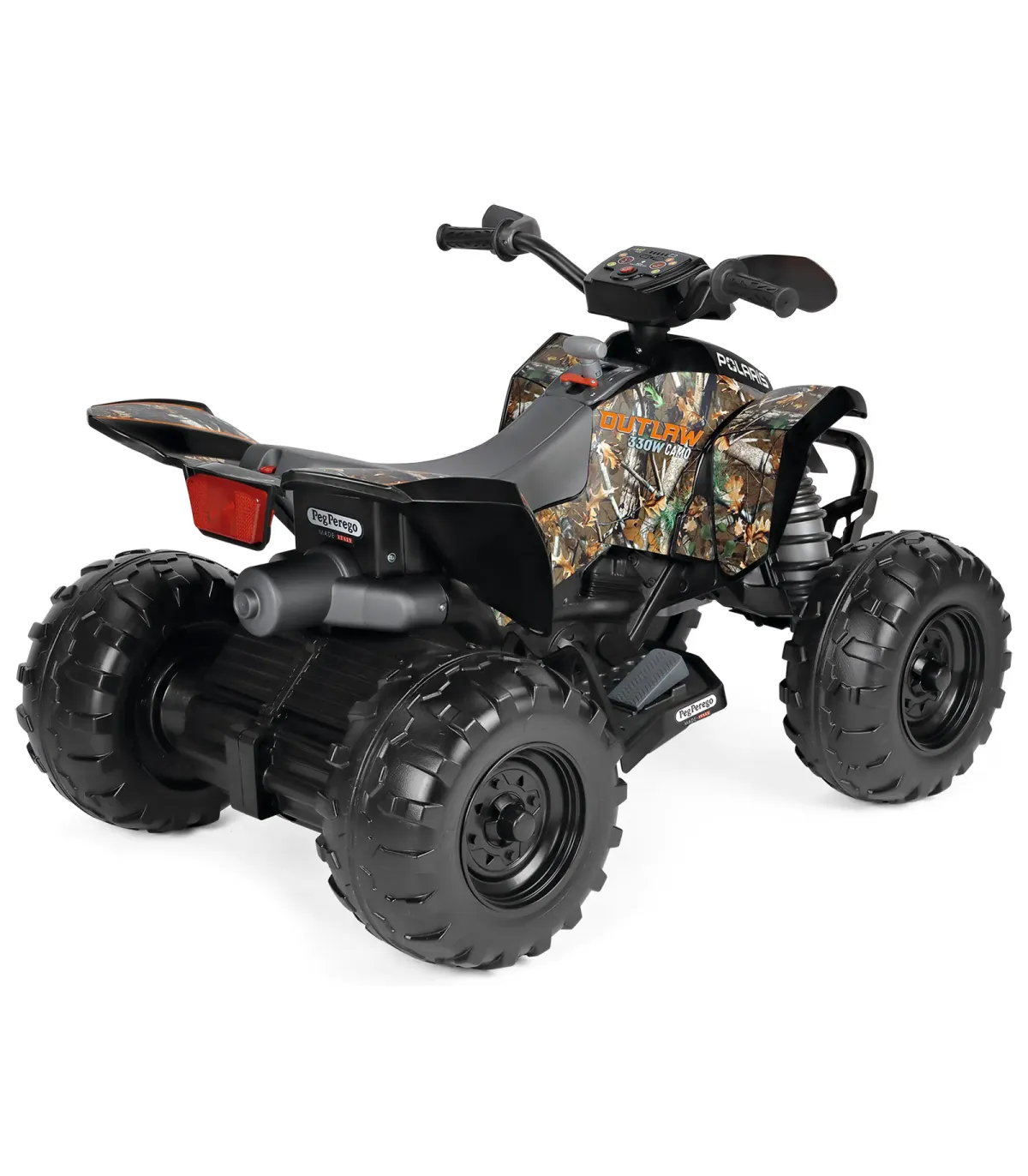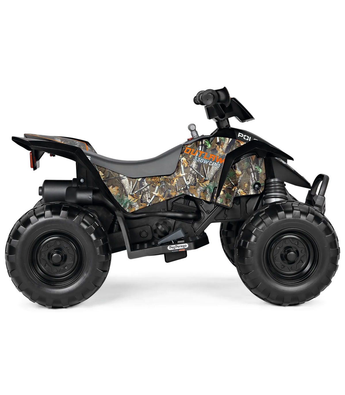 El quad eléctrico infantil con luces y sonidos en versión camuflaje para vivir aventuras todoterreno. Características de alto rendimiento como luces, sonidos, melodías y claxon, para divertirse a partir de 3 años. Polaris Outlaw 330W Camo funciona con una batería recargable de 12 V/8Ah/100 Wh.