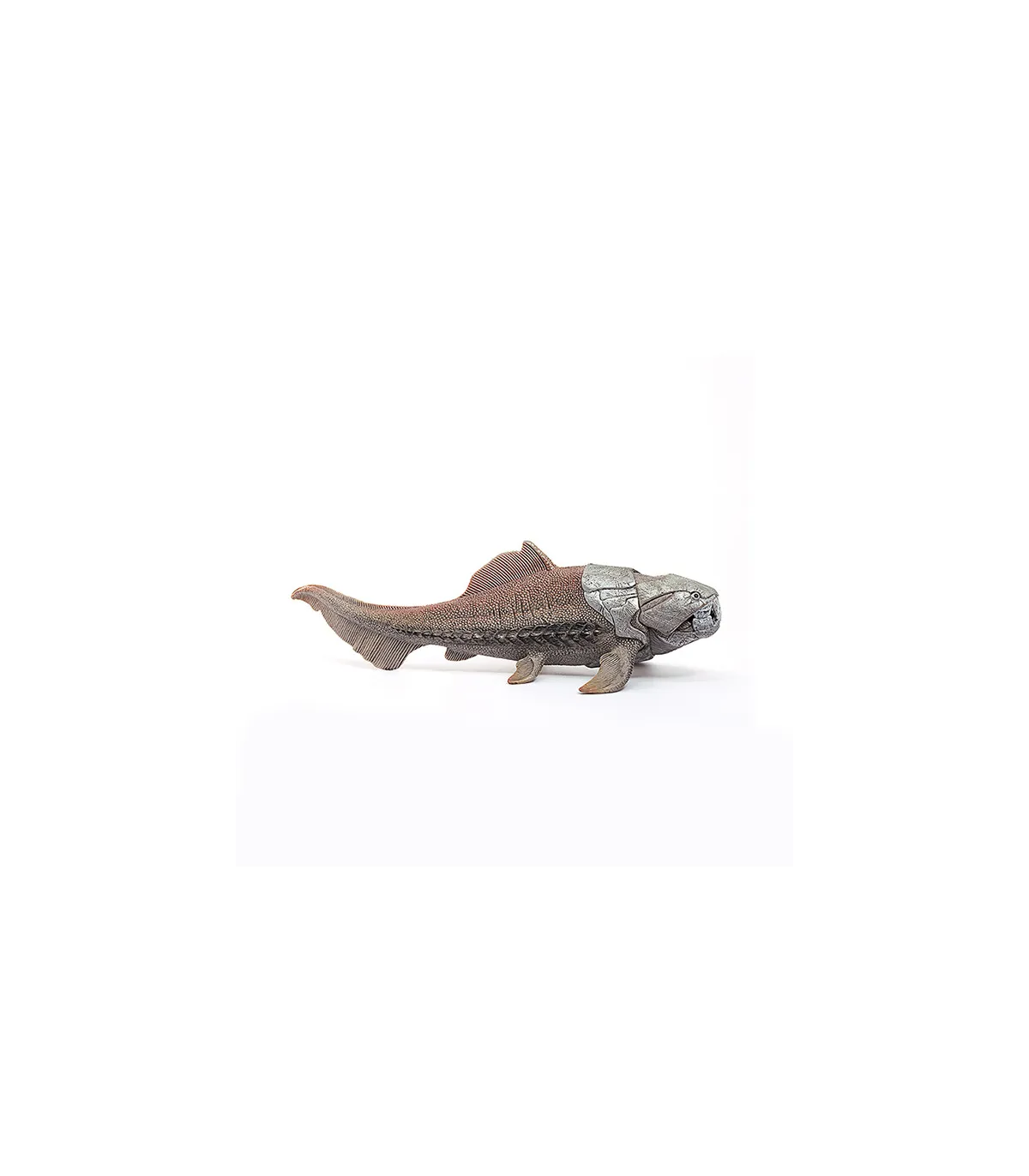El dunkleosteus era un pez acorazado y con sus ocho a diez metros de longitud, increíblemente grande para la era devónica. Junto con el titanichthys se considera uno de los primeros gigantes del mundo submarino. El dunkleosteus vivió 130-150 millones de años antes que el primer dinosaurio. Era un intrépido cazador que podía dar rápidamente un mordisco, comía tiburones e incluso si no encontraba otra presa, comía a los de su propia especie. Al lado de su esqueleto se ha encontrado a menudo peces que sólo estaban parcialmente digeridos. Por ello los científicos creen que este pez acorazado no podía masticar bien y se tragaba sus presas en grandes trozos. Lleva el nombre en honor al paleontólogo David Dunkle. La palabra "osteos" es griega y significa "hueso". Dato divertido En vez de dientes, el dunkleosteus tenía largas y afiladas cuchillas dentales en su poderosa mandíbula.