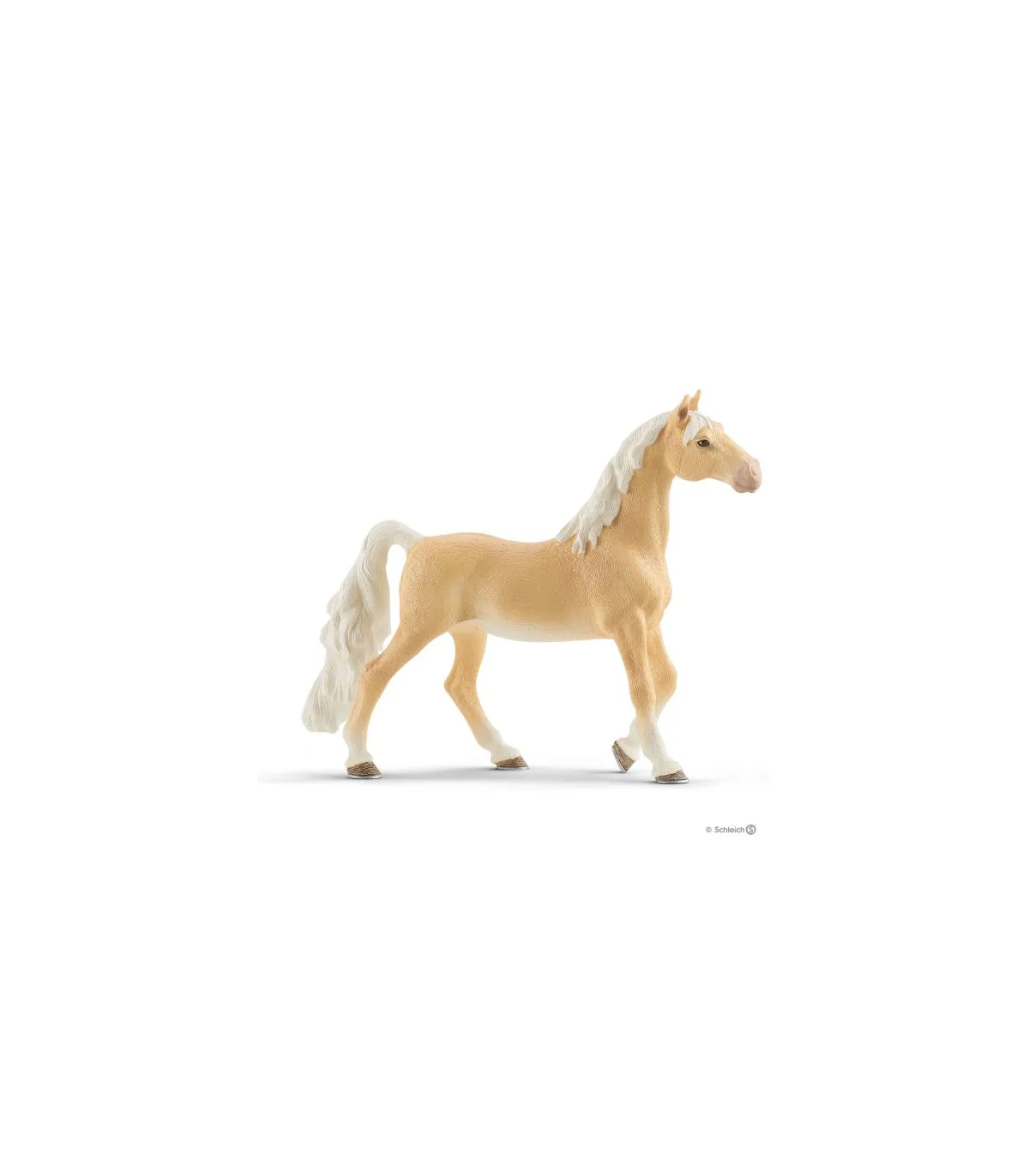 La yegua Saddlebred americana de Schleich® Horse Club es un bonito caballo de capa clara. Como es característico de su raza, esta yegua de Schleich® Horse Club porta altivas la cabeza y su larga cola. Antiguamente, los Saddlebred americanos eran caballos de silla y tiro, aunque en la actualidad se emplean sobre todo como caballos de espectáculo. Además de los tres aires —paso, trote y galope—, algunos caballos de esta raza dominan también el rack y el paso lento, ambos son movimientos suaves de cuatro tiempos. Dato divertido La cría del Saddlebred americano comenzó en el estado norteamericano de Kentucky.