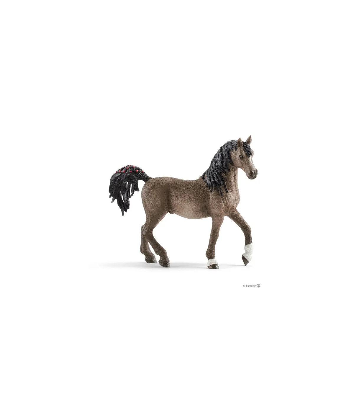Se suele decir de ellos que son la raza de caballos más bonita del mundo. Son de constitución esbelta y noble y su cabeza posee a menudo un perfil ligeramente cóncavo. El semental árabe de Schleich® Horse Club tiene la cola trenzada, la cual resalta gracias a su porte estilizado. Asimismo, despliega una magnífica crin de color oscuro y un pelaje de un elegante y atractivo tono pardo.