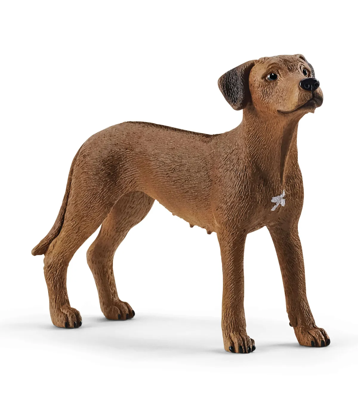 El perro crestado rodesiano de Schleich® Farm World cuenta con un pelaje corto, brillante y de color trigo característico de su raza.
