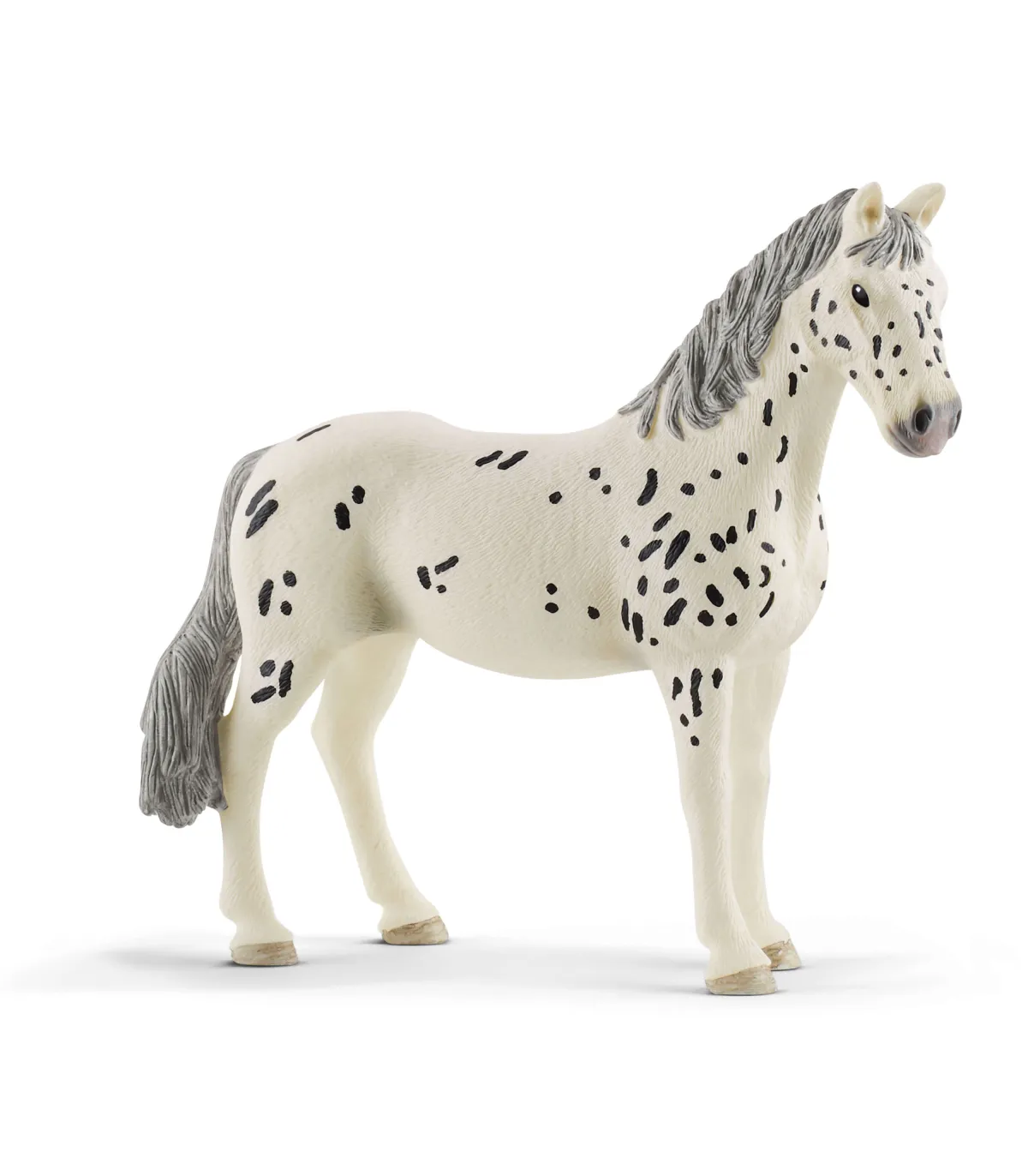El pelaje de la encantadora Knabstrupper de Schleich® Horse Club cuenta con numerosas manchas, características de esta raza de caballos.