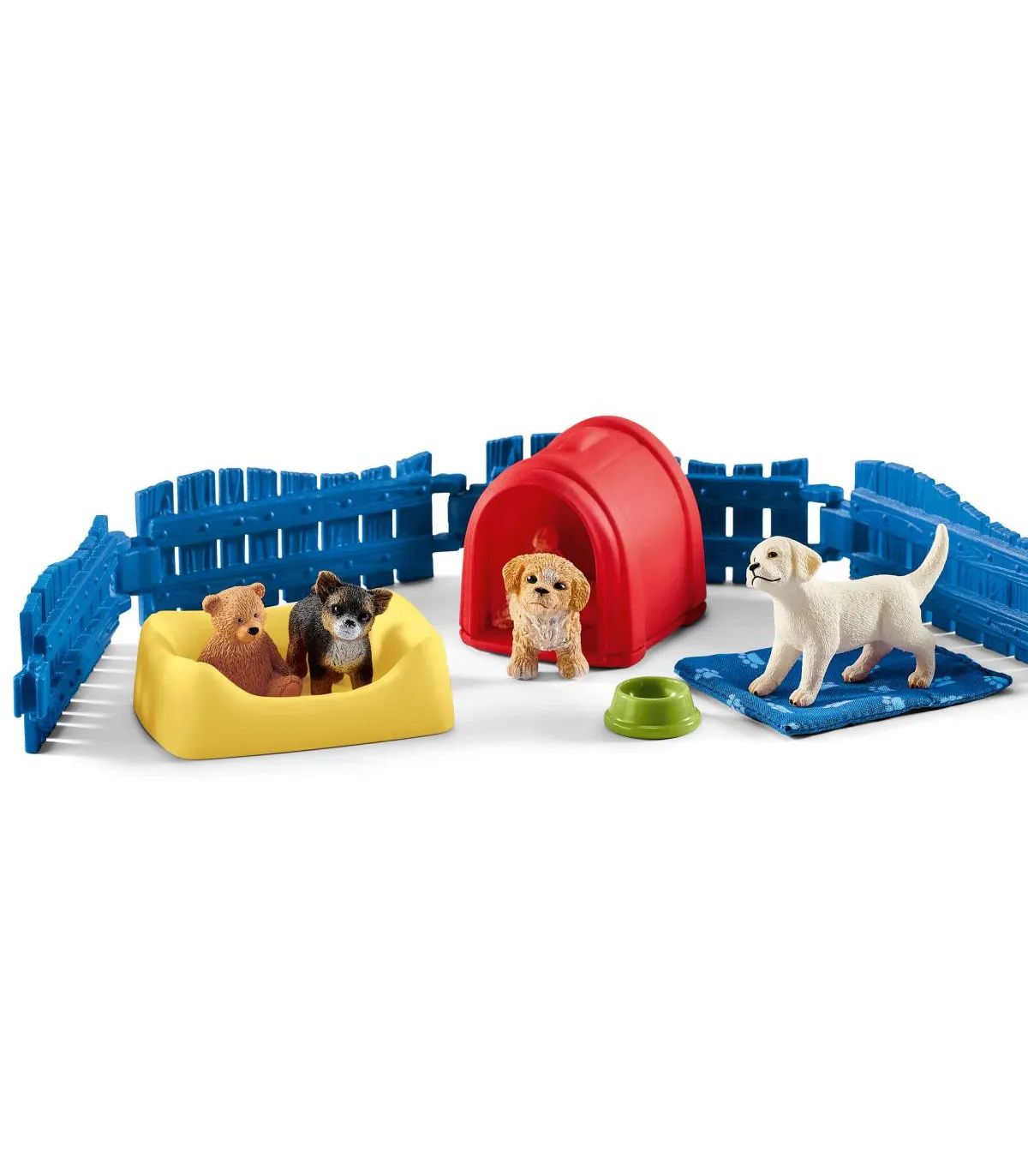 1x cachorro Maltipoo, 1x cachorro Chihuahua, 1x cachorro Labrador Retriever, 1x caseta perro, 1x cesta perro, 1x manta, 1x bol, 1x osito de peluche, 5x cerca